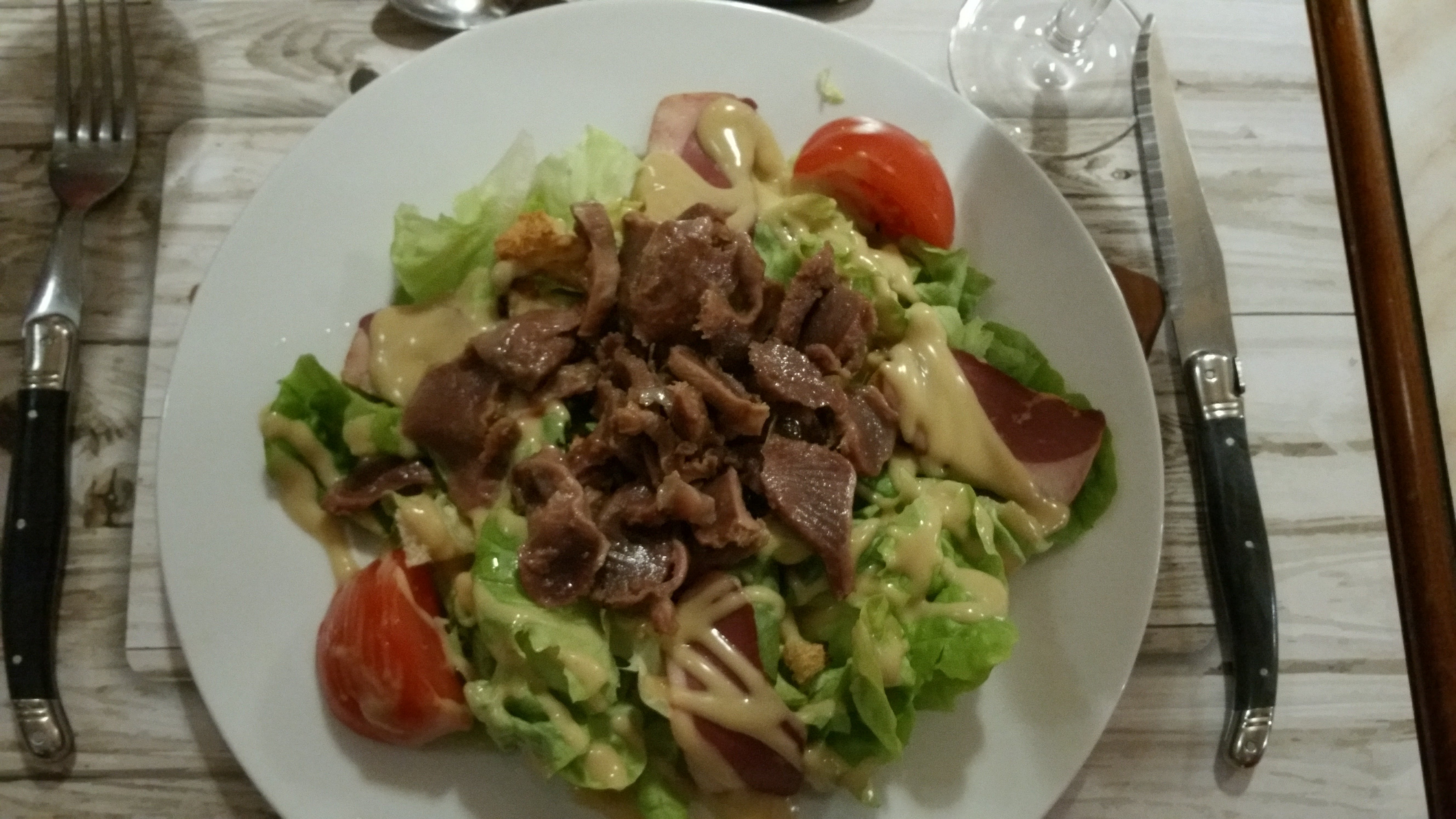 Salade de gésiers, paupiettes & légumes, tarte aux pommes avec crème & boule de glace... copieux, frais, fait maison. Je me suis régalé !