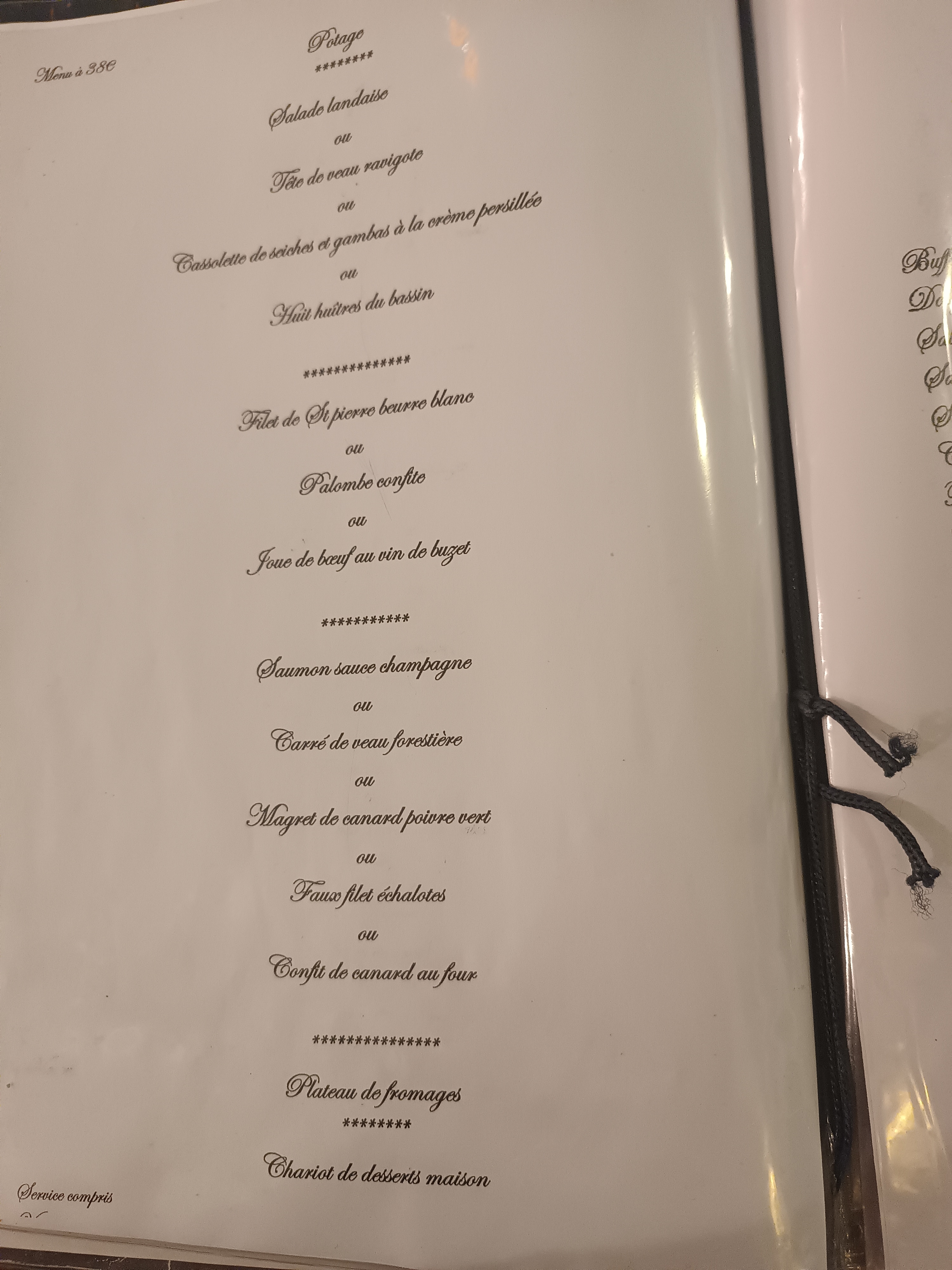 Nous avons réservé et passé une excellente soirée. Entrée à volonté. Un potage maison super 👌. Magret de canard hummm délicieux. Foie gras cuit à la poêle. Et le chariot des desserts. Je recommande.