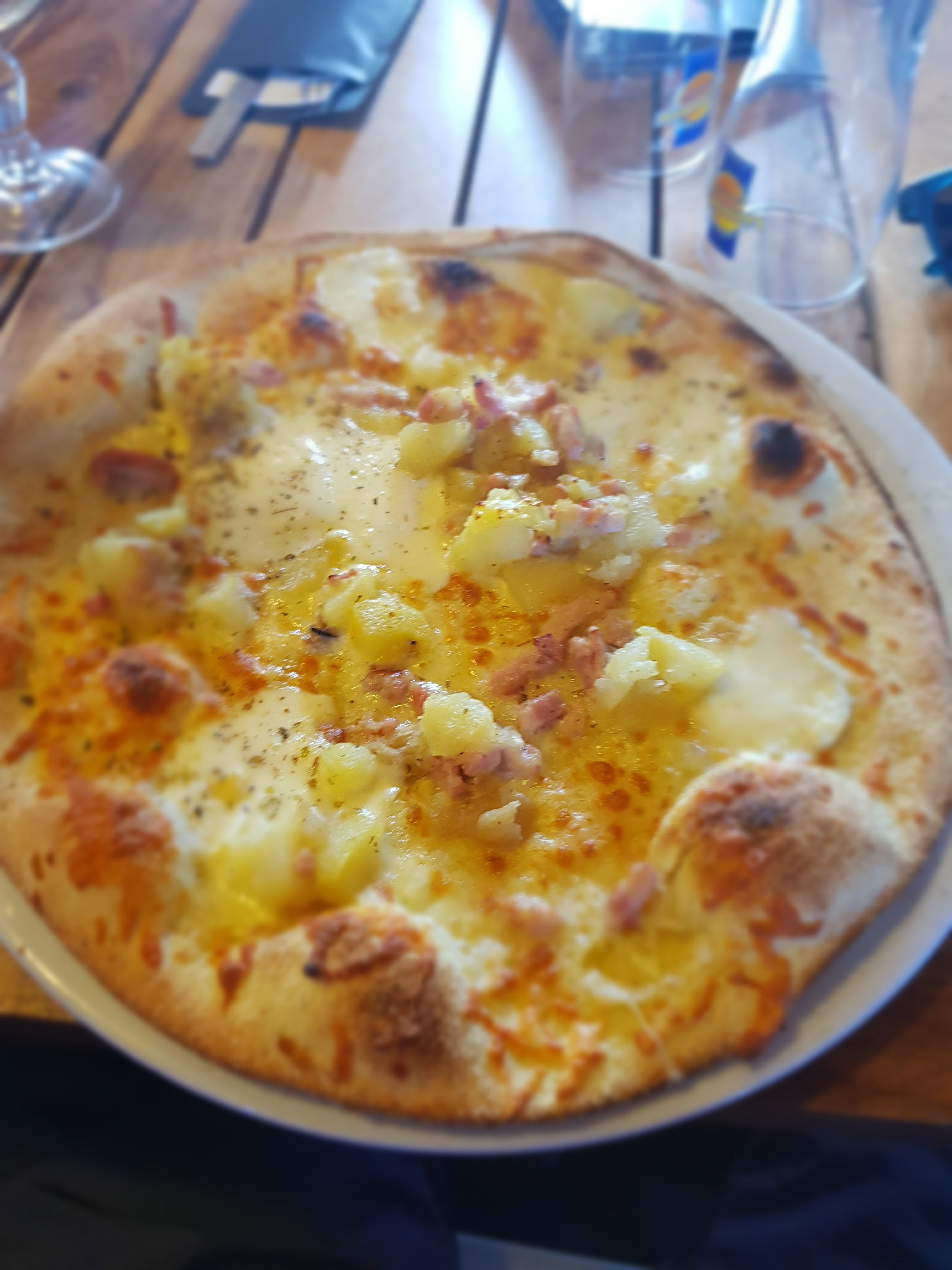 Au pied des pistes donc cadre de vie agréable Service rapide et souriant malgré l'affluence du midi avec un sympa de commande en ligne que je ne connaissais pas Félicitations au pizzaiolo pour sa pâte maison qui est vraiment très bonne Je met 4 étoiles car je trouve quand même les prix un peu cher pour les boissons et les menus enfants sinon rien à dire