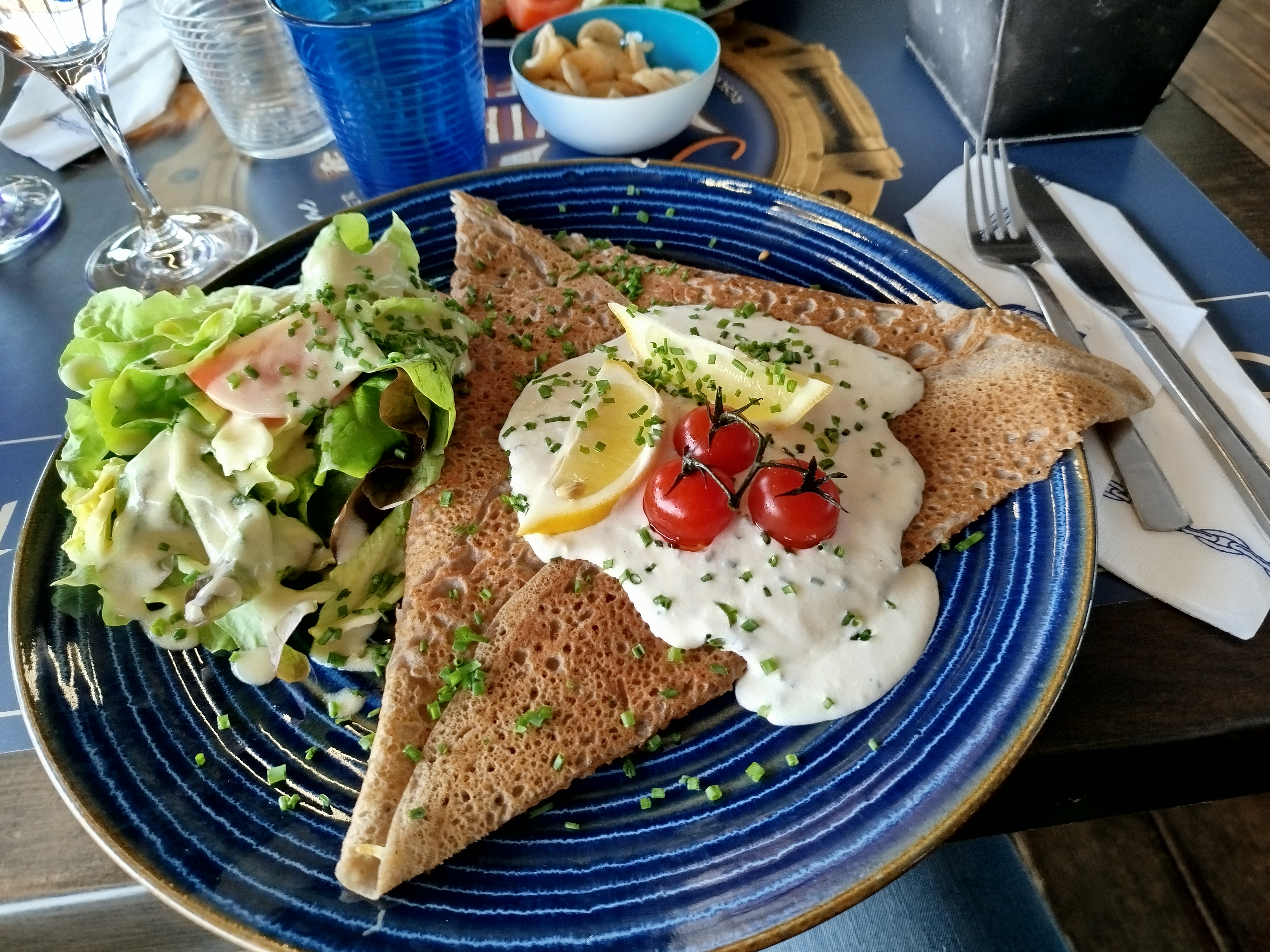 Petite halte en se promenant sur le port. Cadre super sympa, le gerant est tres accueillant et les plats sont très bons et bien garnis !! Galette saumon, crème et citron, et galette andouille, pomme et camembert. Nous nous sommes régalés !!