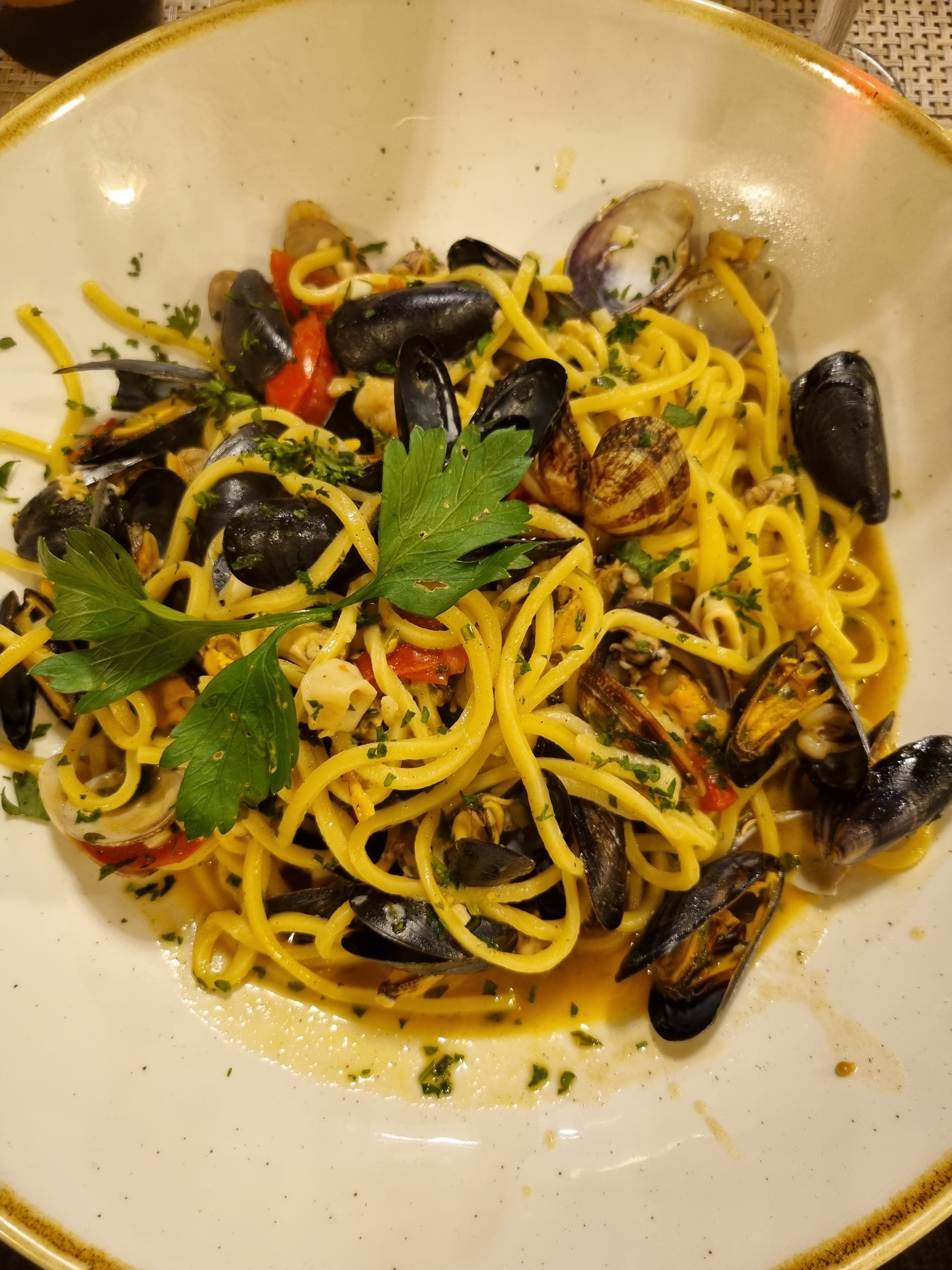 On commande 2 tagliata (viande bœuf tranchée finement) et on nous sert deux faux filets basic en m’expliquant qu’ici c’est comme ça c’est du tagliata non tranché… Accompagné de de pâte et frites surgelées avec mayo en tube. Pour 27 euros le plat ça fait mal. 2 plats et une bouteille 82 euros. Serveur gentil qui nous prend un peu pour des jambons.