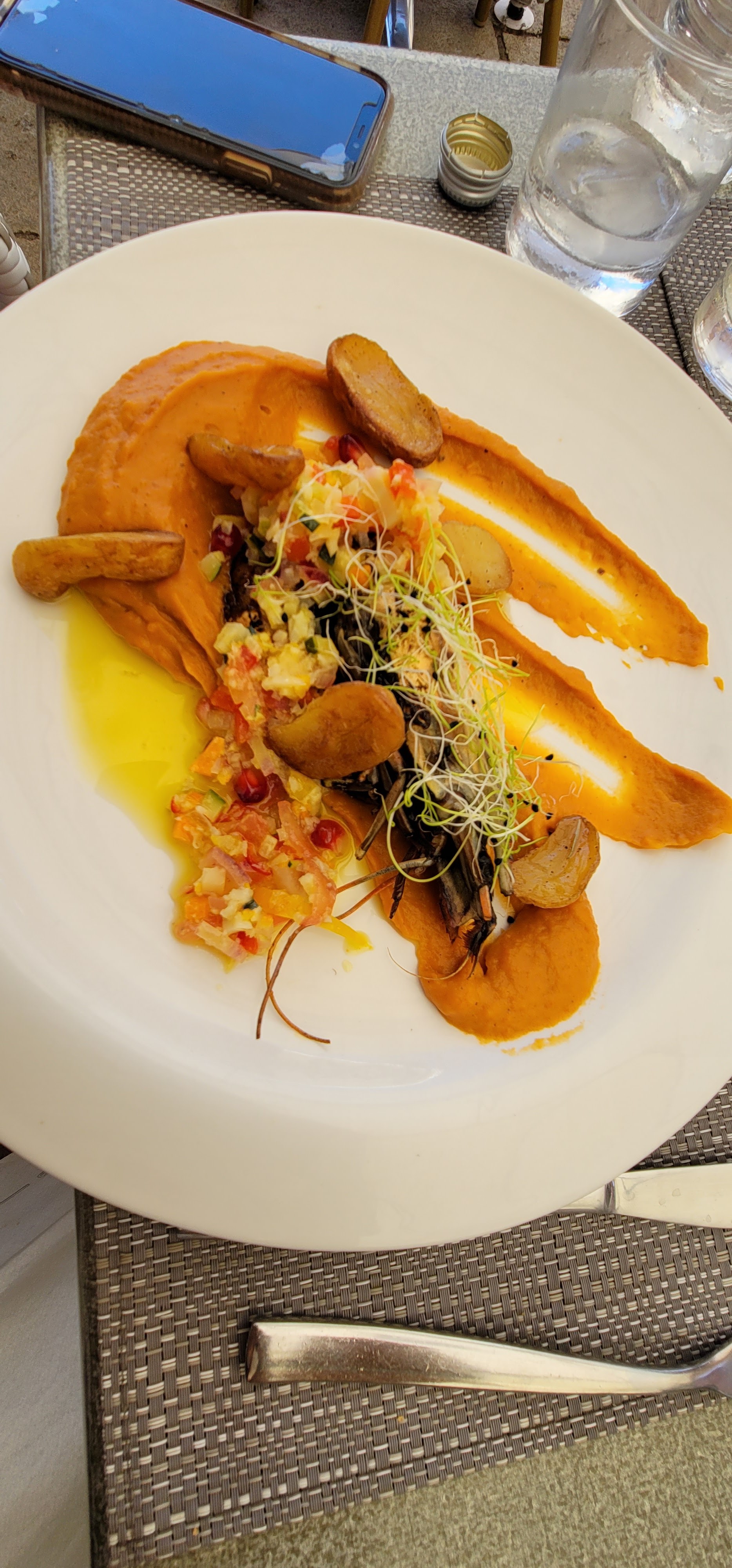 Pour être honnête, nous l'avons confondu avec un restaurant voisin qui avait des critiques élogieuses, alors nous nous sommes assis, la vue est bonne, le vin aussi, les serveurs sont gentils, mais la nourriture n'était pas de bonne qualité. Ils avaient une offre de déjeuner, mais je préfère quand même manger un plat de haute qualité plutôt que tout le menu qui ne l'est pas. Mon St Jacques était ok mais ma mère a commandé des côtes de porc qui étaient essentiellement du saindoux ! Elle ne se sentait pas bien après :(
