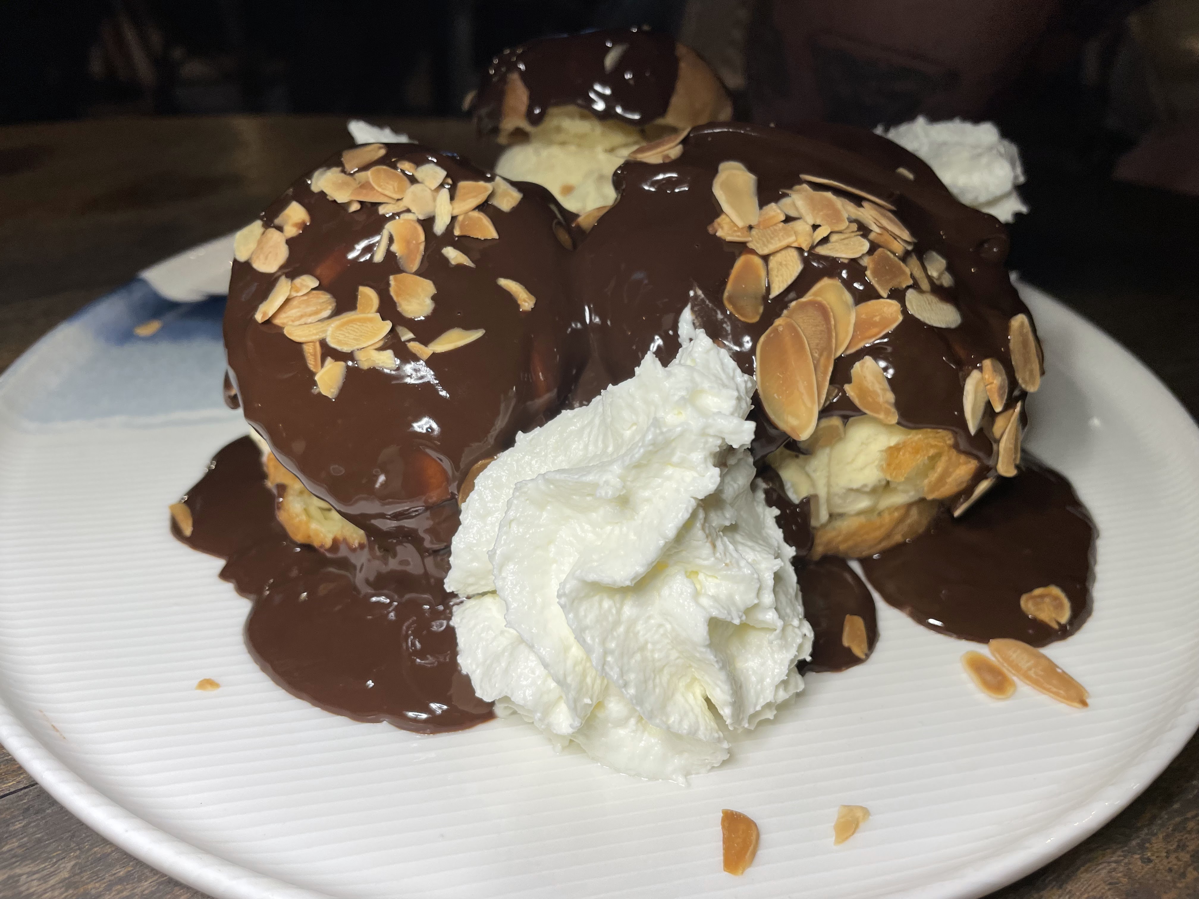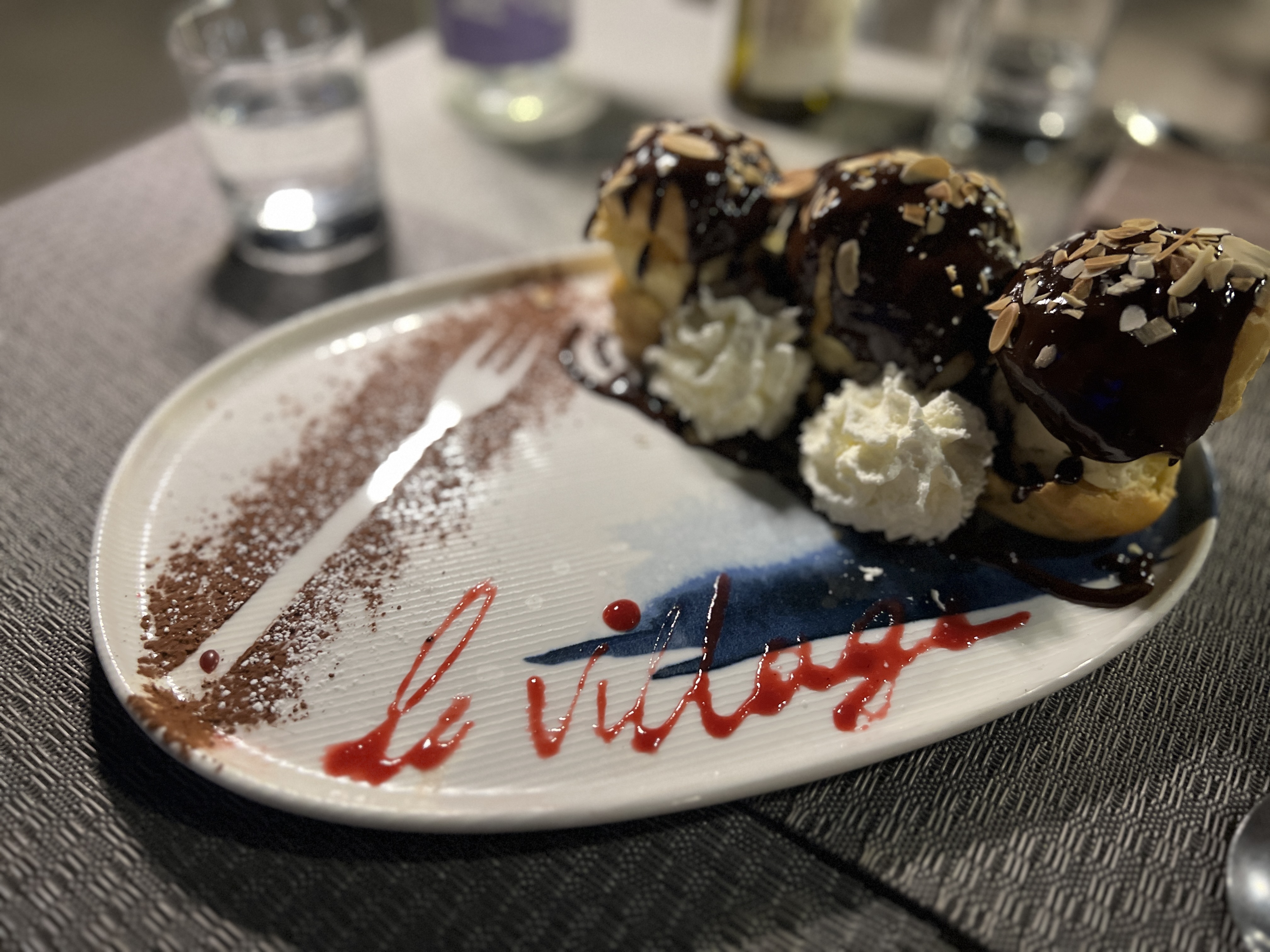 La nourriture ici est incroyable ! J’ai eu la meilleure purée de canard et de patate douce que j’ai jamais mangée, peut-être parce qu’elle n’avait pas le goût de canard. Ma femme a adoré les pâtes aux truffes, parfaitement al dente et avec une saveur si forte et merveilleuse. Le saumon était également très bon et tous les légumes étaient parfaitement cuits. Pour finir, ils ont brûlé et cristallisé la crème brûlée à table. Le Village était tellement bien que nous avons décidé d'y retourner une deuxième nuit. Quand la nourriture est aussi bonne, je laisserais passer la « possibilité » d’un repas décent pour un repas délicieux garanti. Le deuxième soir, nous avons eu l'apéritif aux champignons et au parmesan; différent de ce que je pensais que ce serait (non cuit) mais toujours très savoureux. Nos plats principaux étaient la crevette géante (sucée les têtes et bien sûr pour la meilleure saveur) et leur steak à la sauce aux truffes blanches. Ma femme a dit que c’était dans son top 3 des meilleurs steaks qu’elle ait jamais mangé. Puis pour finir en dessert nous avons eu les choux à la crème XXL ; essentiellement des choux à la crème géants avec une glace incroyable au milieu des choux, puis recouverts d'une sauce au chocolat décadente avec un côté de crème fouettée. Même s’ils étaient XXL, ils ont été dévorés en un rien de temps.