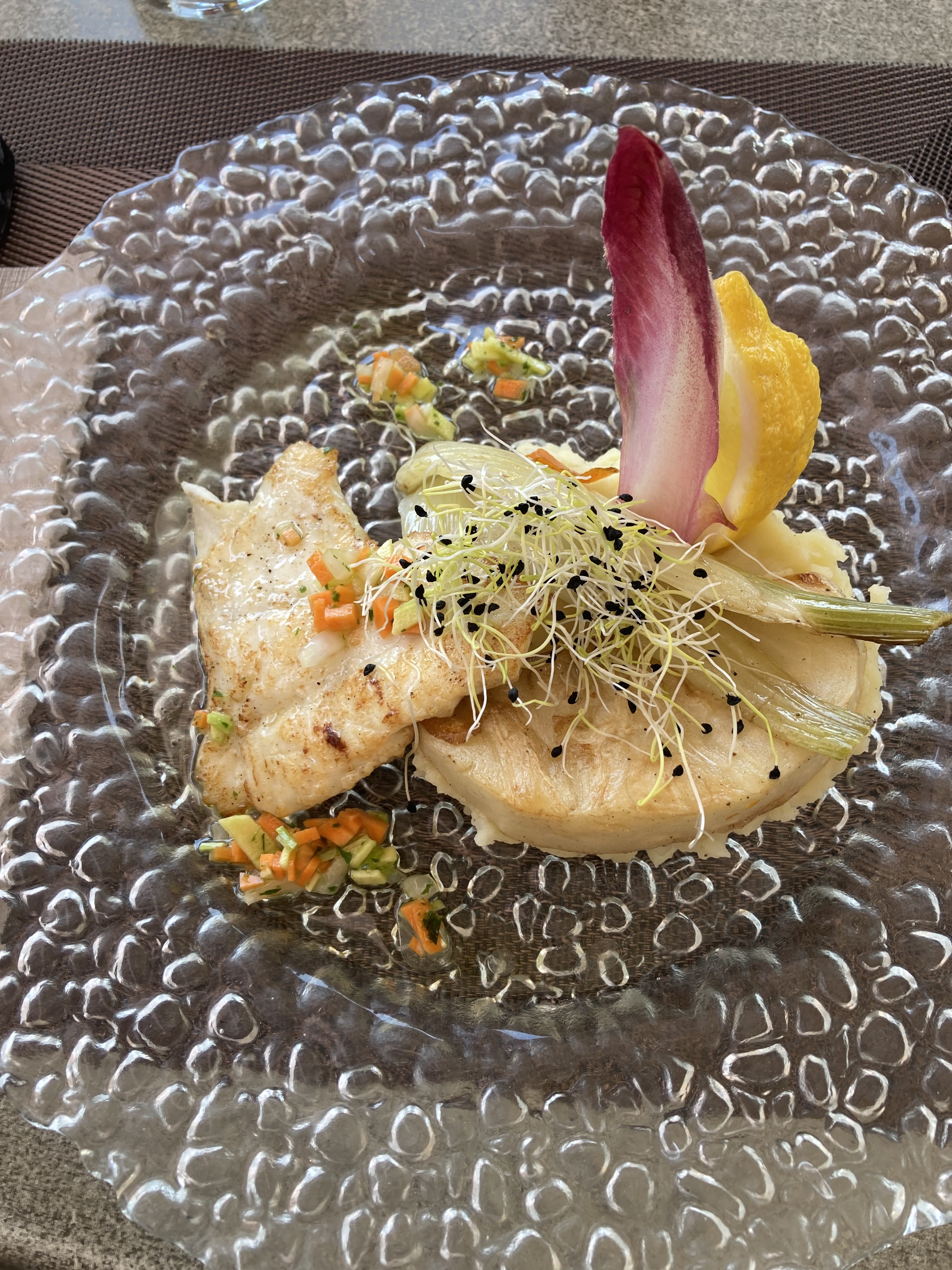 Menu du midi , tres longue attente, le beignet de fleurs de courgettes s est avéré parfaitement croustillant sur la friture , la fleur a brillé par son absence… Plat principal : les noix de st jacques ont rétréci à la valeur de 4 pétoncles sur un large matelas de purée, certes bien assaisonné… la direction n a pas souhaité faire de geste commercial … alors on ne gardera pas un souvenir inoubliable de l expérience 🙁