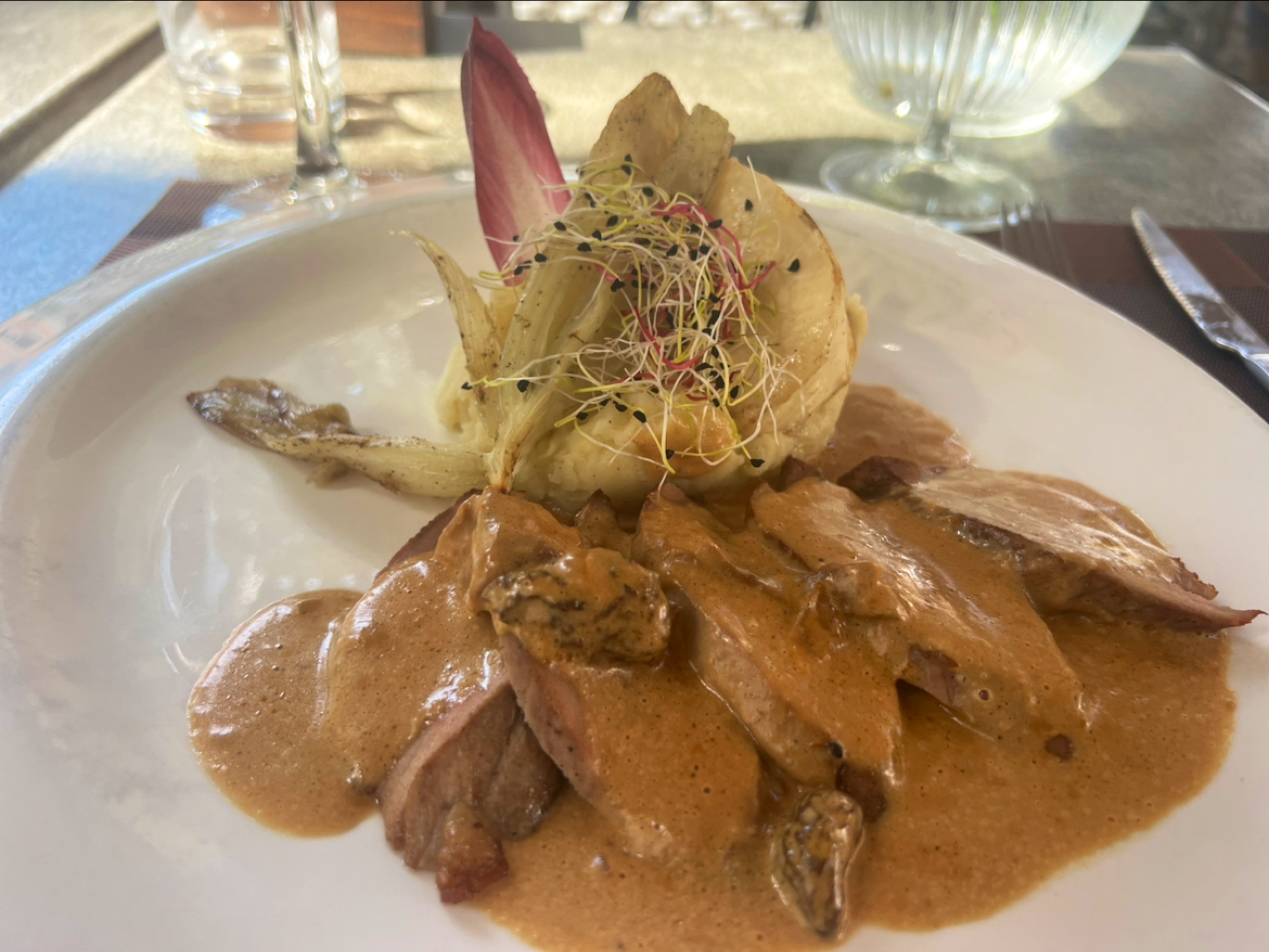 Excellent restaurant. Le service était parfait. attentif et sympathique sans être envahissant. La nourriture est arrivée à temps et l'emplacement est magnifique. Tous les plats préparés et présentés joliment. Le Magret de canard était parfaitement cuit et la sauce était piquante et sucrée. La salade de poires était délicieuse. Globalement, c'est un endroit idéal pour venir profiter de la nourriture et de la vue.