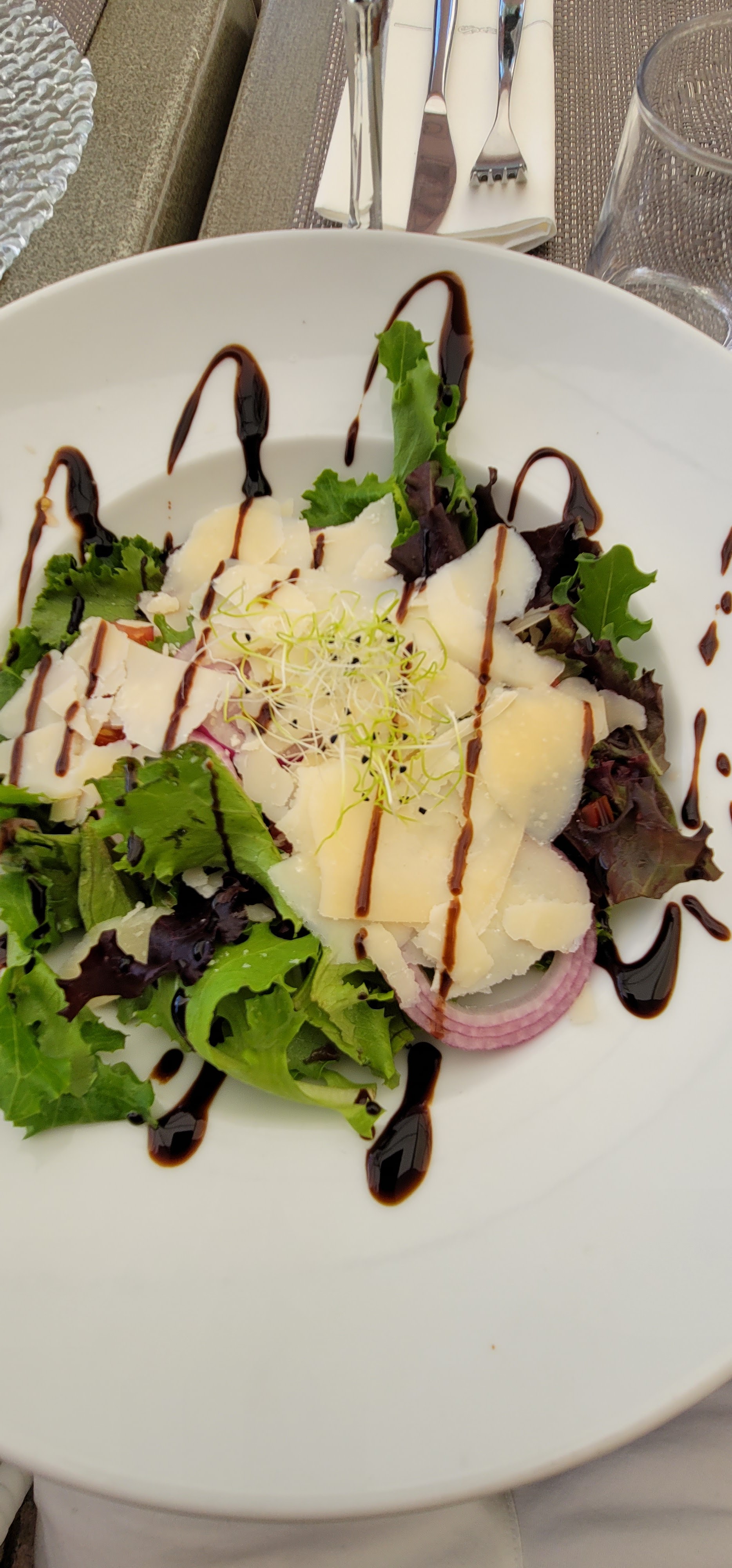 Salade de melon et pétoncles avec risotto pour le déjeuner, le meilleur risotto que j'ai jamais mangé, tout était délicieux et joliment servi. Le conjoint avait une salade et des pâtes, j'ai essayé les pâtes, c'était très bon. La vue est spectaculaire.