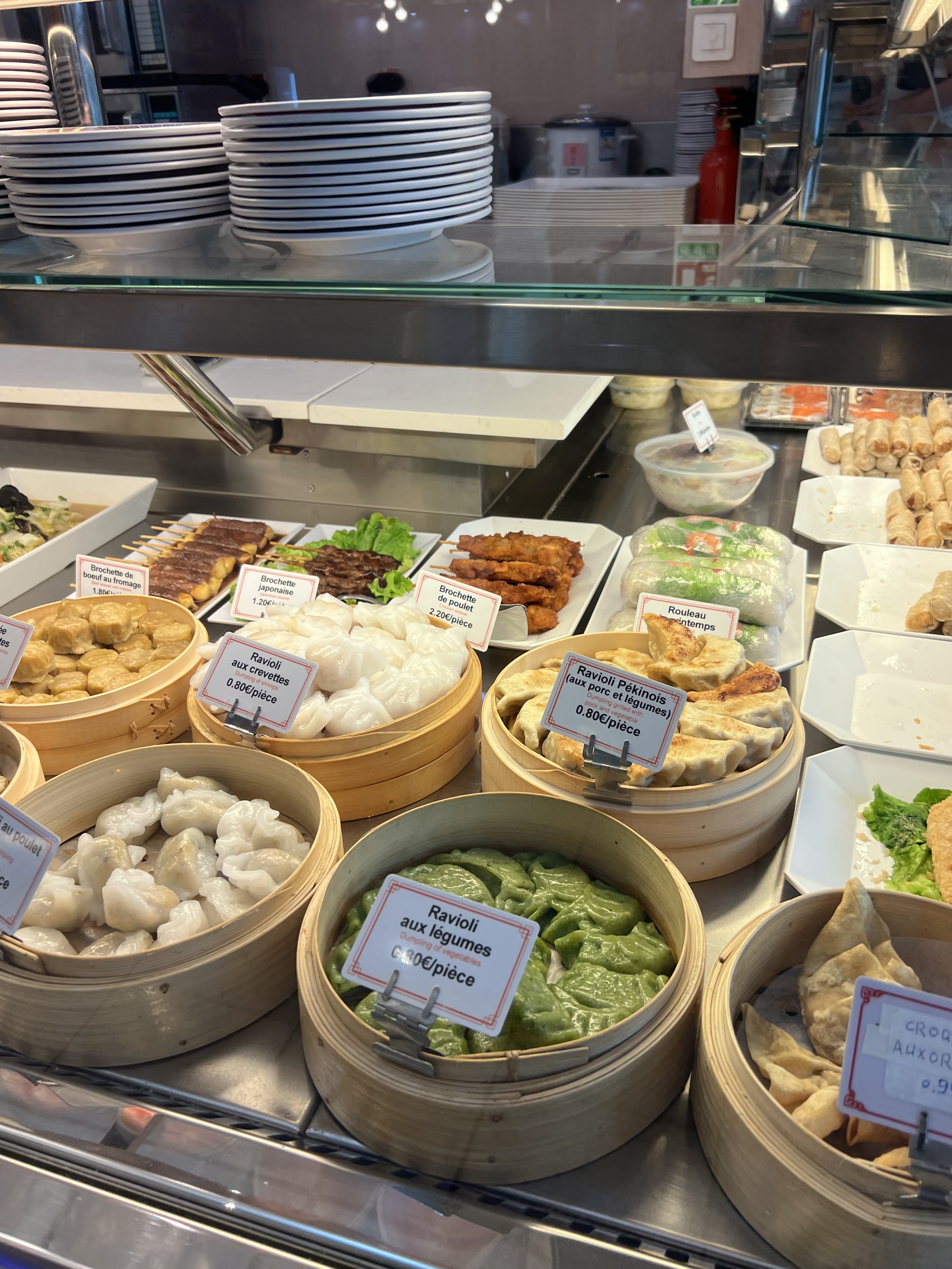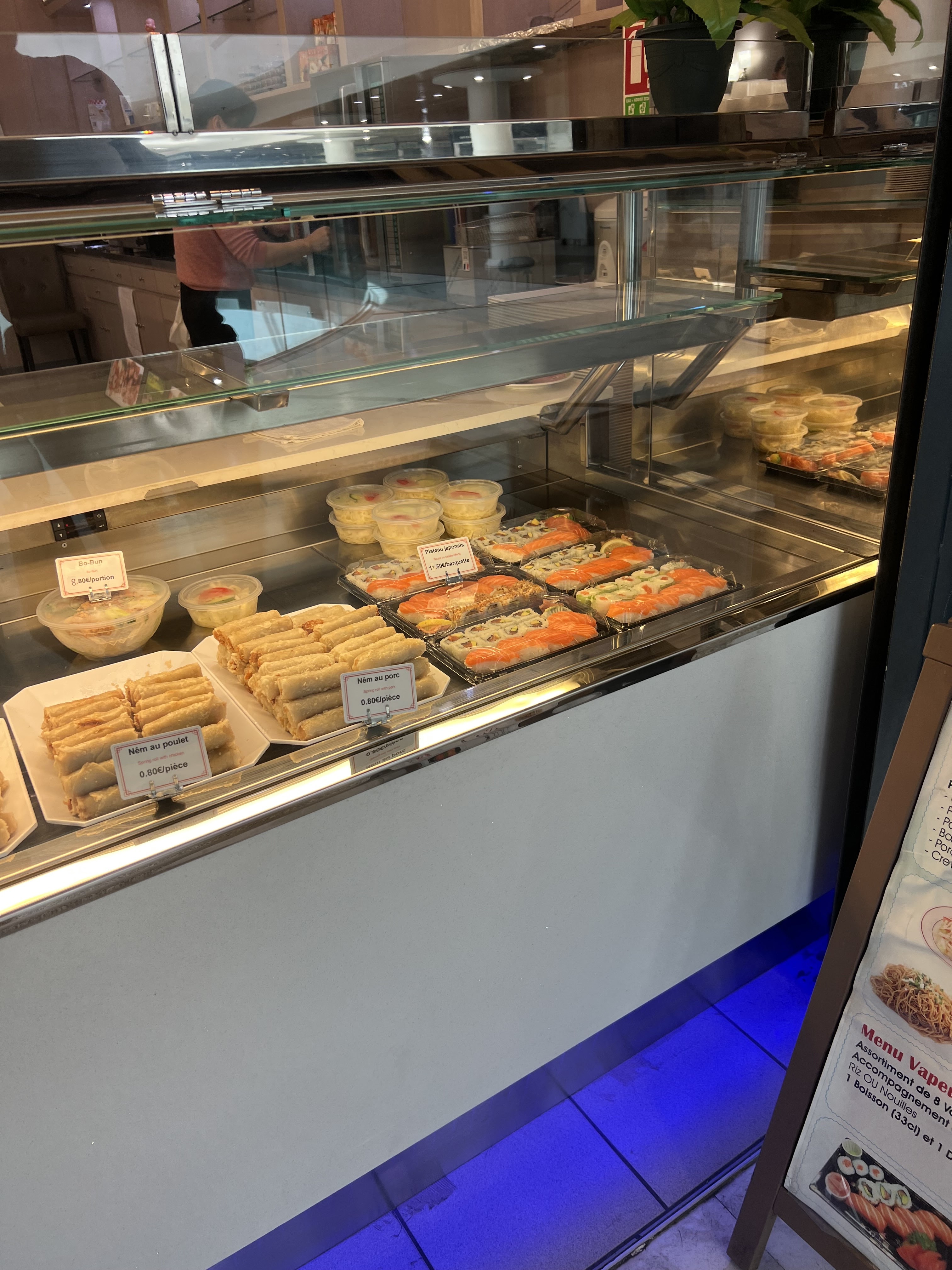 Pas le bonheur non. Le sol est collant sous les semelles ce qui laisse à penser que la propreté laisse à désirer. Quant aux plats et bien que dire? Tout ce qui contient du porc n’est proposé qu’à la carte. Ah bon? Étrange. Nous avons appris qu’ils proposaient pleins de sortes de nems. Nems crevettes et au poulet. C’est beaucoup non? Juste la base pour des nems. Ajouter ceux au porc et voilà. Vous avez fait le tour des nems. À ma connaissance il n’y en a pas d’autres. Les nems au porc ne sont proposés que sur le menu à la carte de même que le porc au caramel. Bref. Sur le peu qui est proposé au buffet à volonté, tout ou presque est mauvais et froid. Le pire c’est que la gérante nous voyant arrivés à la caisse au bout de 15 mn nous a elle demandé si nous avions trouvé les plats froids? Nous avons payé 40 euros pour 2 cocas. Nos assiettes sont restées pleines sur la table. De l’entrée au plat principal. Aucun geste commercial. Nous avons l’habitude de déjeuner dans ce genre de restaurant. C’est la première fois que nous quittons la table sans rien avoir touché ou presque.