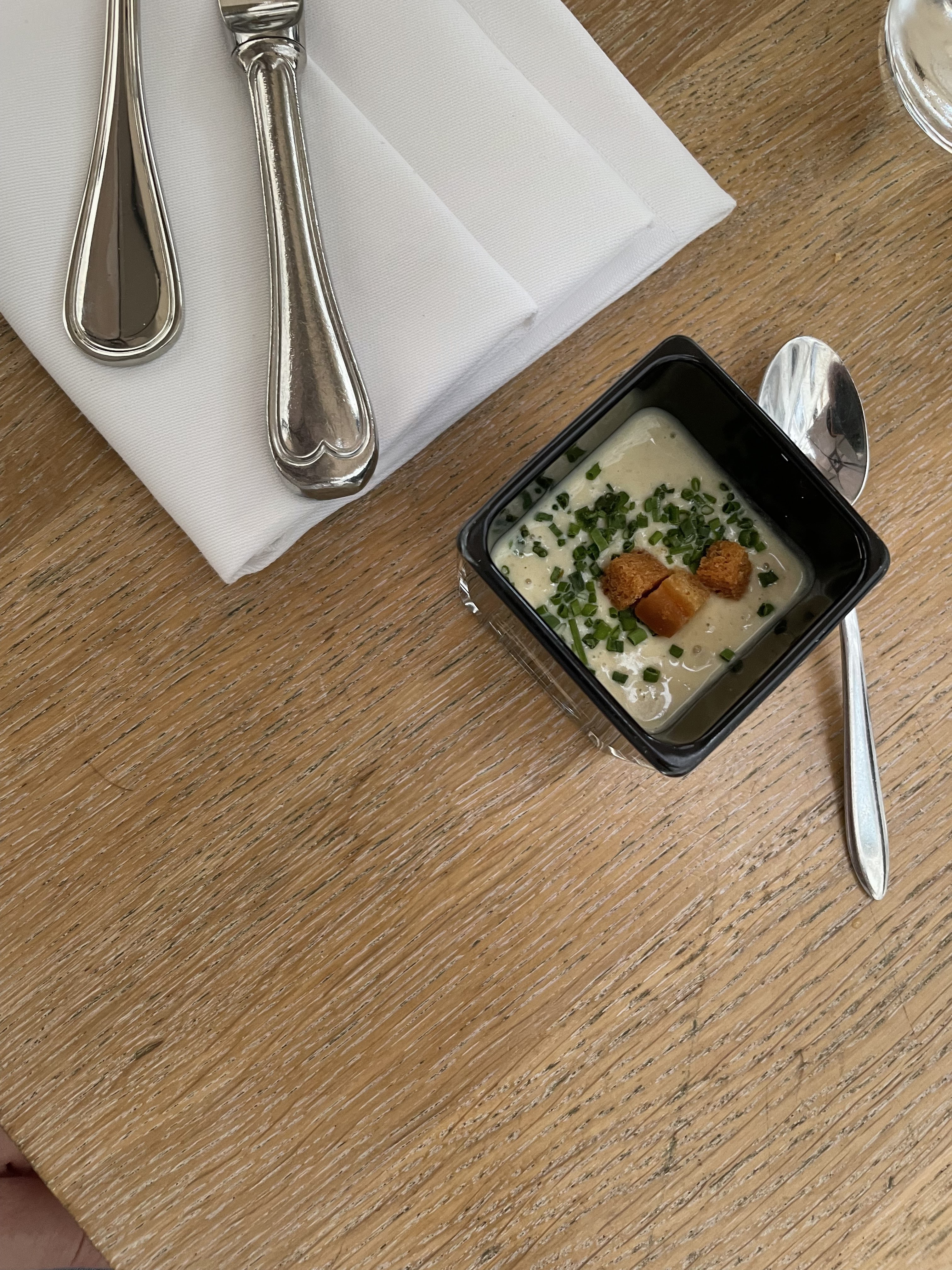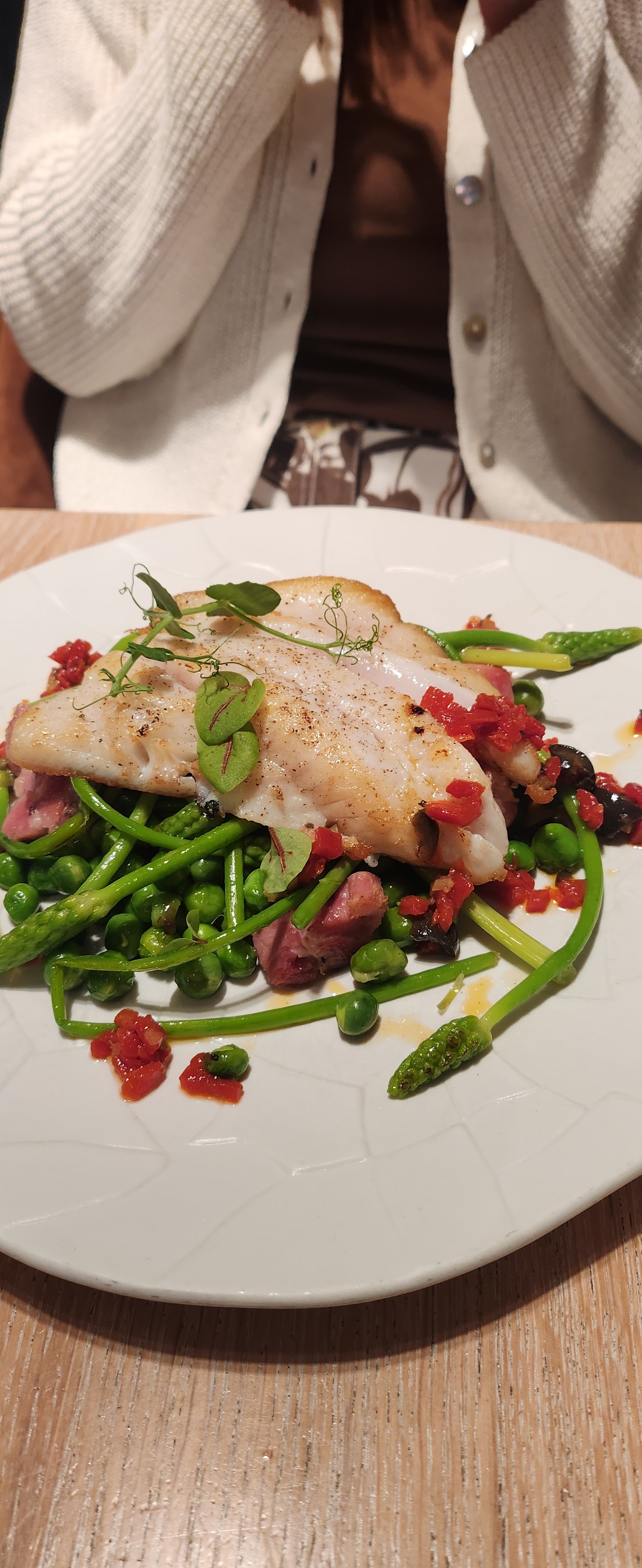 Nous avons pris 4 entrées car elles nous séduisaient dans l’idée C’est à la hauteur de nos espérances ! Le chef est venu nous saluer et nous a proposé les 2 entrées froides pour commencer et les 2 chaudes pour suivre Tataki de thon fin et délicat Asperge blanche et une aïoli au curry plus soutenue en goût Suivi de la cervelle, un peu gras mais très bien préparé ! La salade aux artichauts était divine ! Bref un enchantement ! J’ai adoré !!! On a testé la terrasse ! Mais il n’y a que 2 tables , on a eu de la chance !