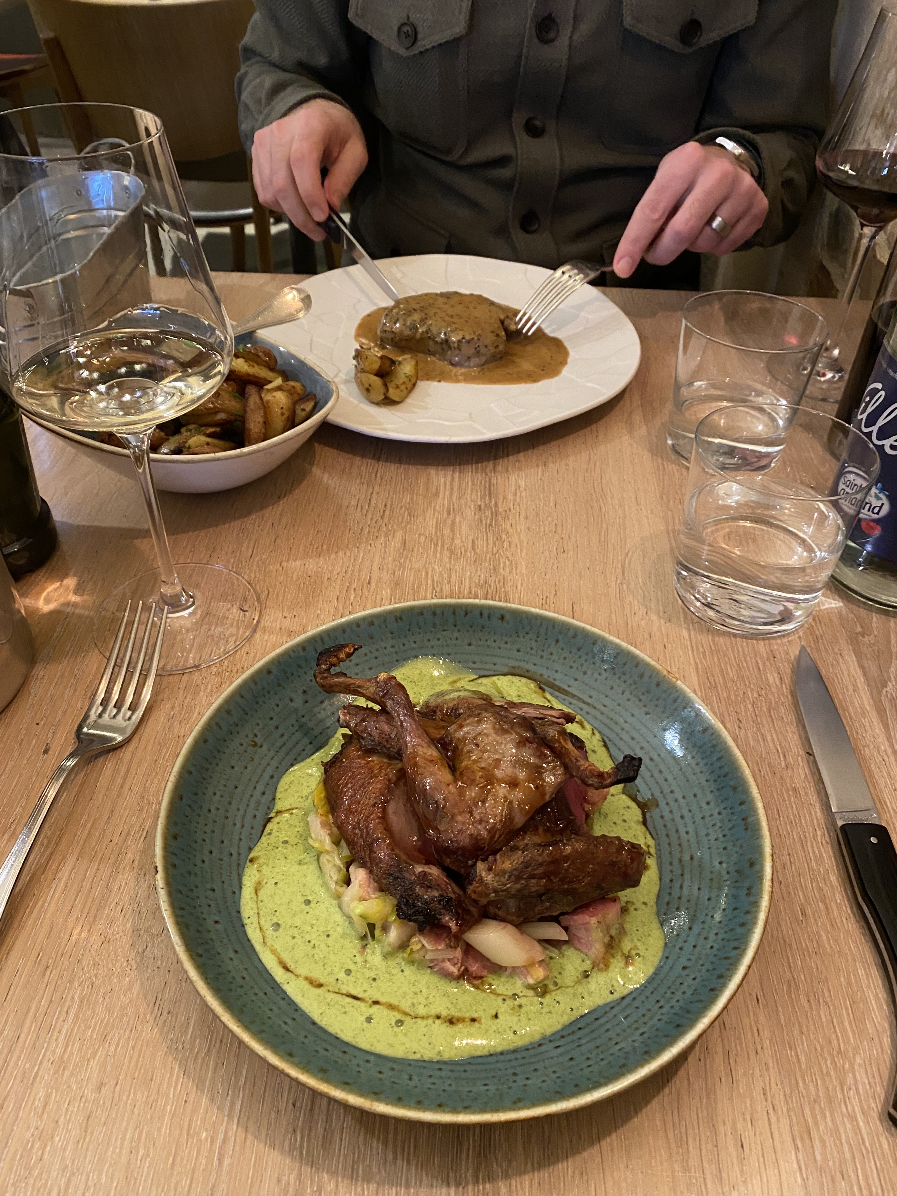 Après avoir eu du mal à trouver mon hôtel lors de mon premier jour à Paris, j'ai décidé d'aller directement dîner après m'être enregistré même s'il n'était que 18h00. J'ai consulté Google Maps pour trouver de bons restaurants dans le coin, et j'ai eu de la chance car Le Villaret, un restaurant labellisé Michelin, n'était qu'à quelques minutes de chez moi ! Je n'avais pas de réservation mais comme j'étais en avance, les gens du Villaret m'ont gracieusement hébergé. Phillippe a patiemment expliqué les éléments du menu, entièrement en français. Une photo montre mon verre de rosé et mon hors-d'œuvre, artichaut breton à la crème de champignons sauvages, œuf poché (en anglais, selon Philippe et Google Translate : artichaut breton à la crème de champignons sauvages et œuf poché). Mon plat principal était le poulet fermier, embeurrée de chou vert au saindoux, pleurotes (poulet fermier, émincé de chou vert aux lardons, pleurotes). Les saveurs des ingrédients se complétaient bien. Le rosé recommandé, bien que l'une des options les moins chères du menu, accompagnait parfaitement le poulet. Bon repas.