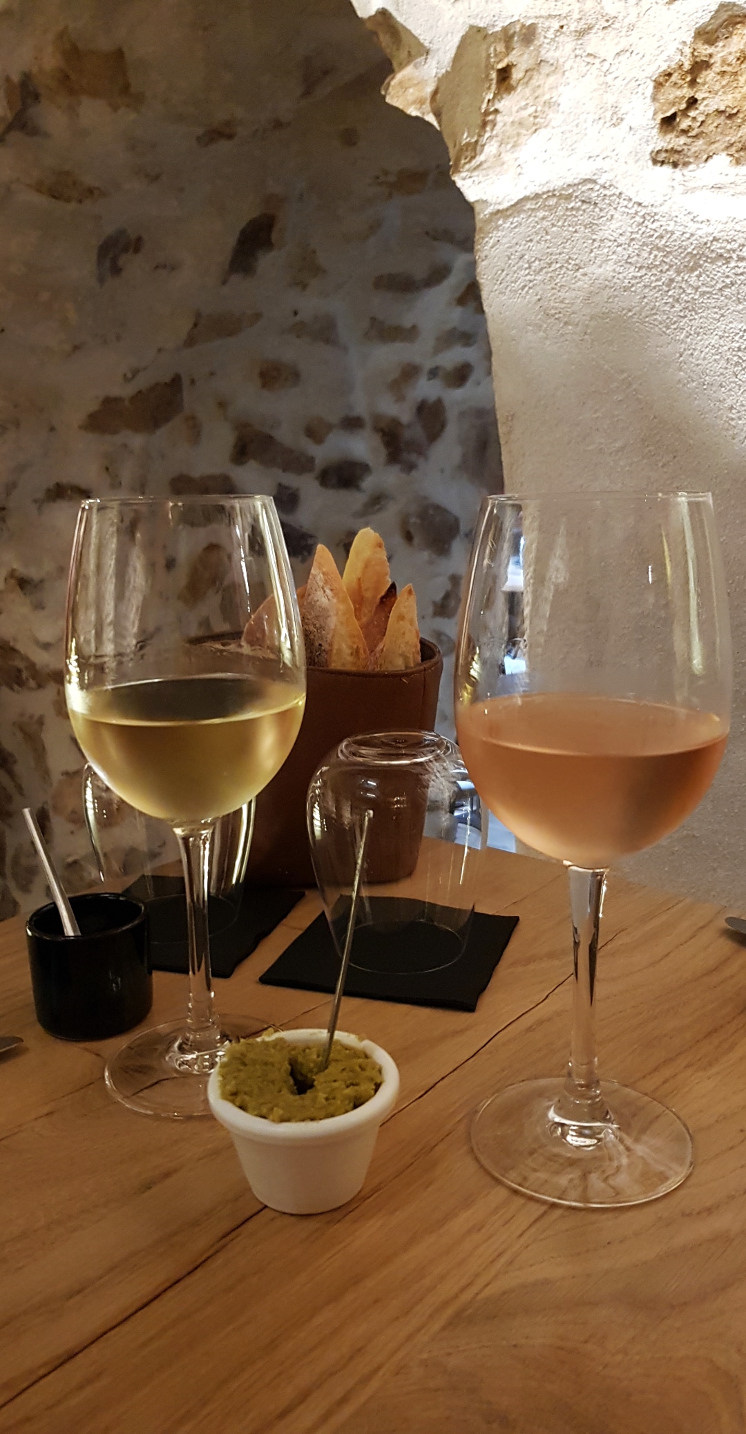 Cadre sympa (vin, pierre, bois) et bons produits. L’équipe est également accueillante. La carte sur portable est en revanche pas très lisible et nous avons eu la mauvaise surprise de commander des verres à 18 euros (conseillés, nous nous sommes laissés guider donc en partie de notre faute -?-). Addition très salée au final qui gâche un peu la soirée et le fait de revenir. Dommage.
