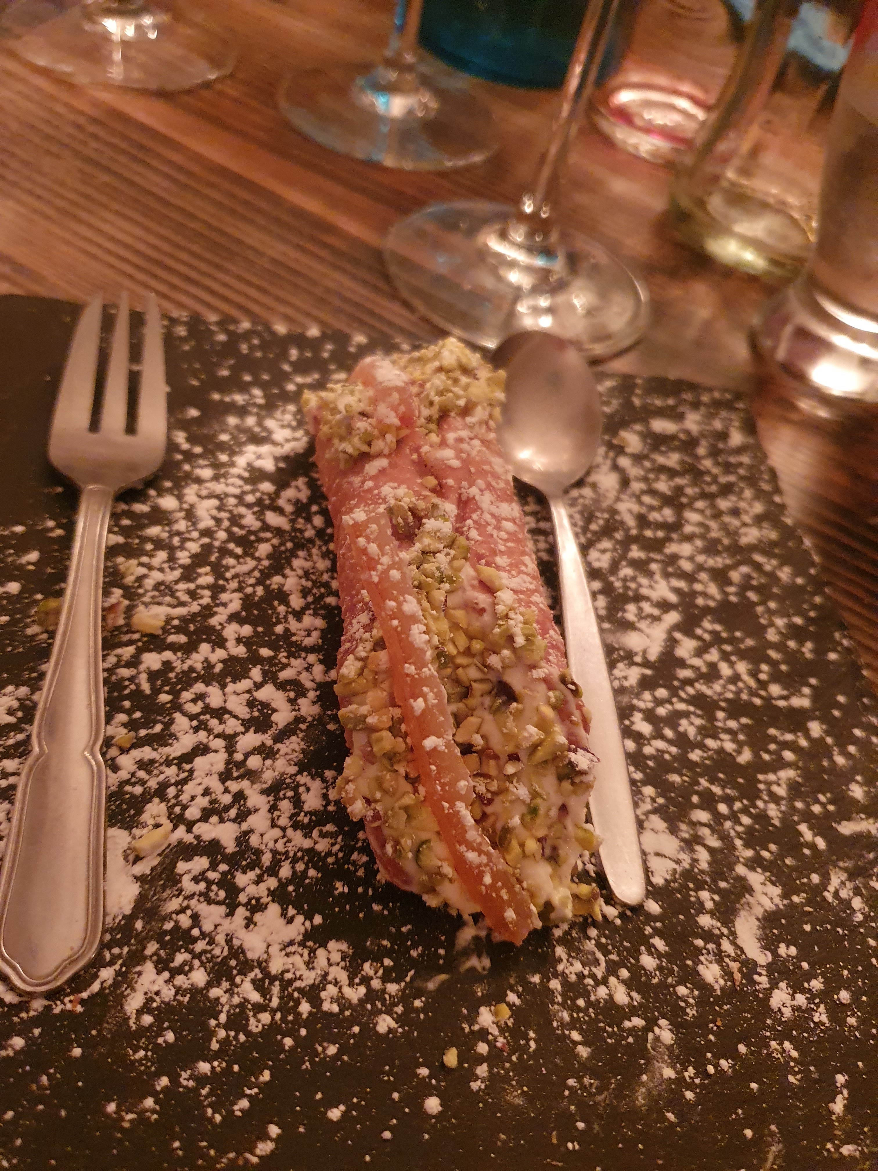 2eme passage. Raviolis farcies aux épinard. Elles était bonne mais le bord des pâtes était dur...c'est bizard. Sinon les dessert super bon. La cannolle et panacota !!! 😍😝