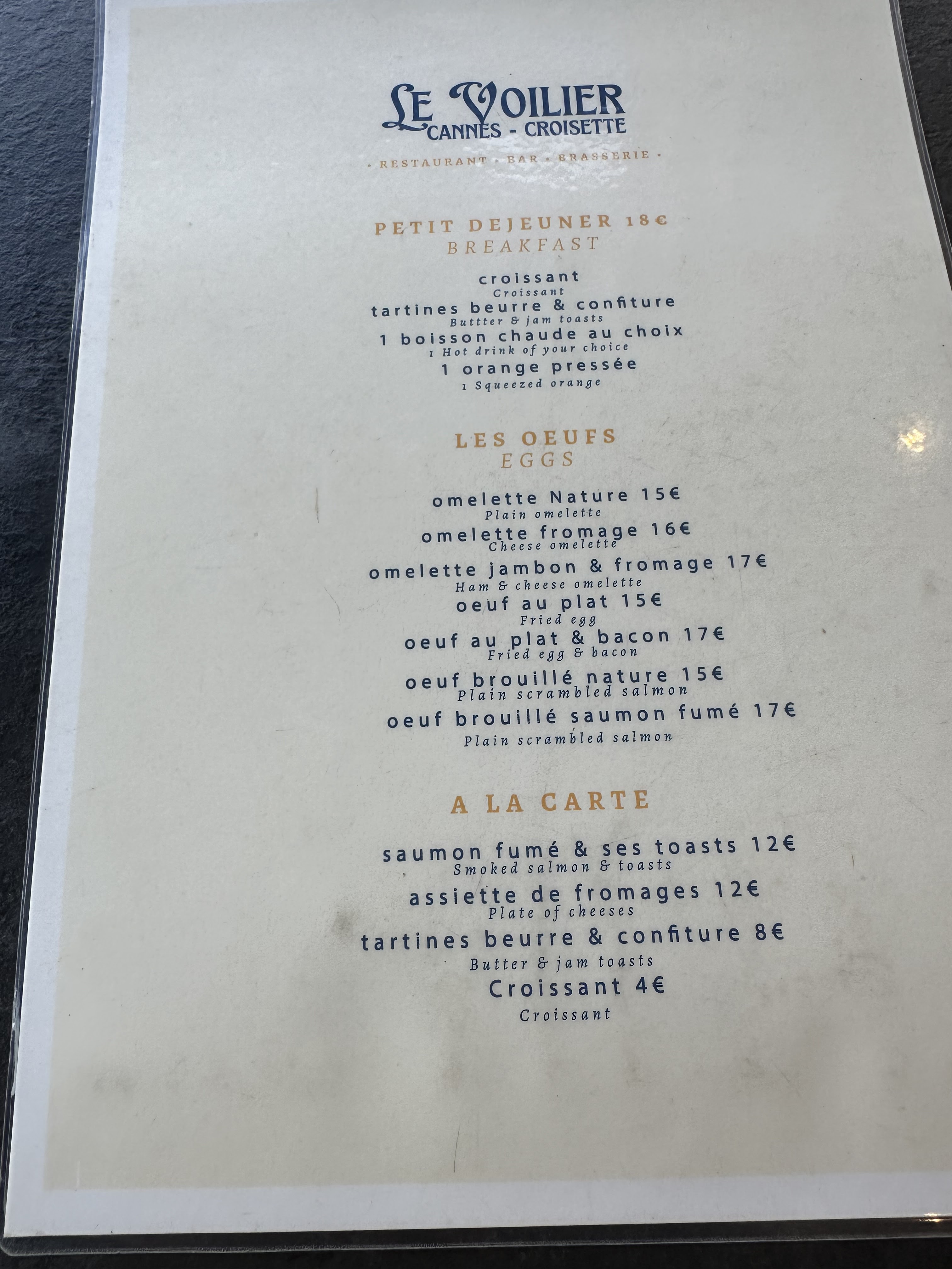Le Voilier a toujours été une valeur sure sur la Croisette: service svelte, cuisine de saison, gourmande, plats copieux et appétissants gustativement et visuellement ...Retour après son ouverture et grosse déception avec une carte bof déjà vue...avec une escalope milanaise à la cuisson ratée, baignant dans une chapelure grasse et sans croustillant. Sauce tomate des pâtes sans saveur. Coupe de fruits rouges servie brute...deux fraises coupées en 4 et des baies de saison .