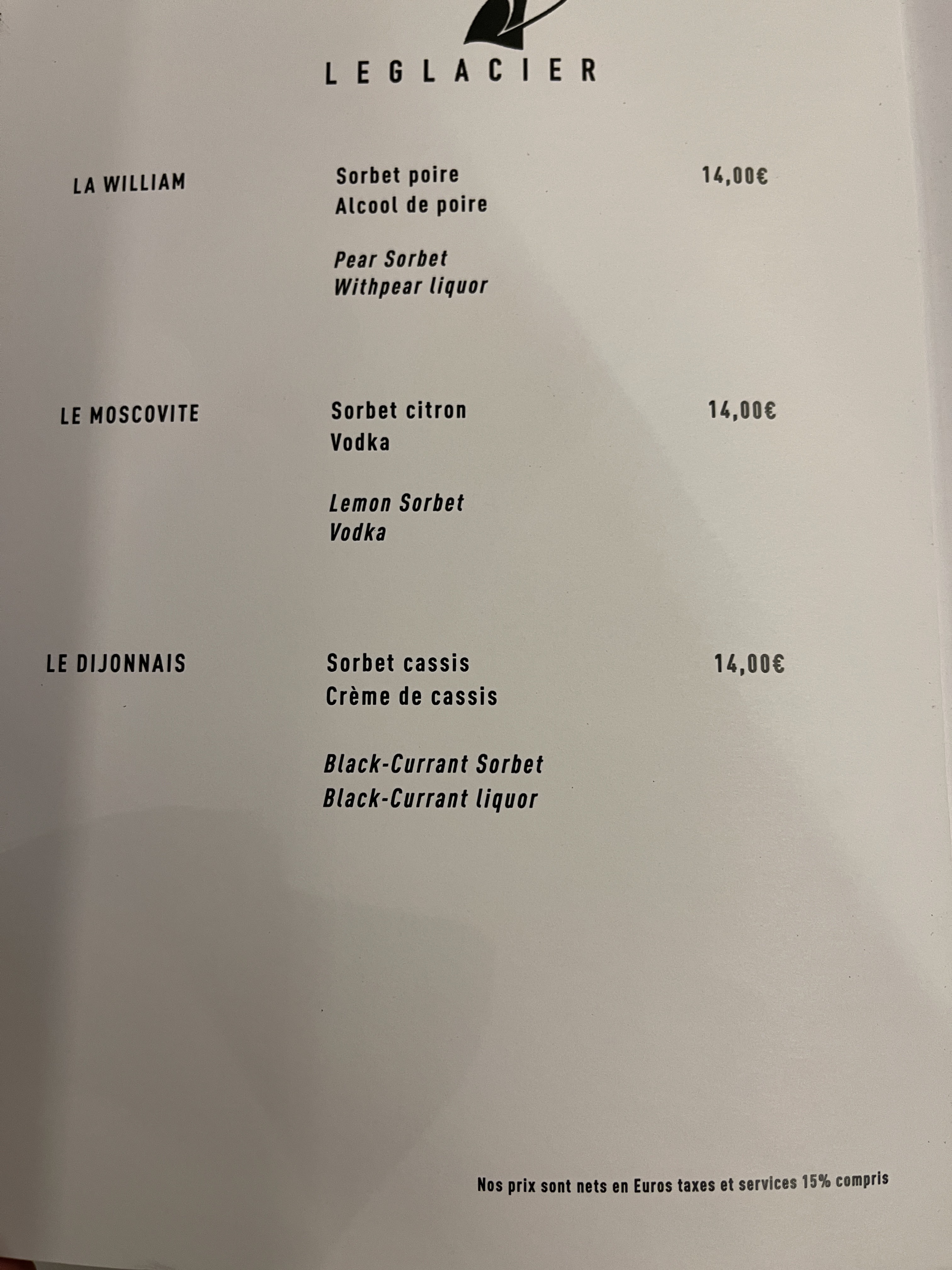La cuisine était sympa, le service aussi, mais 9 euros la bouteille de San Pellegrino et 14 euros le dessert, quand même !!!