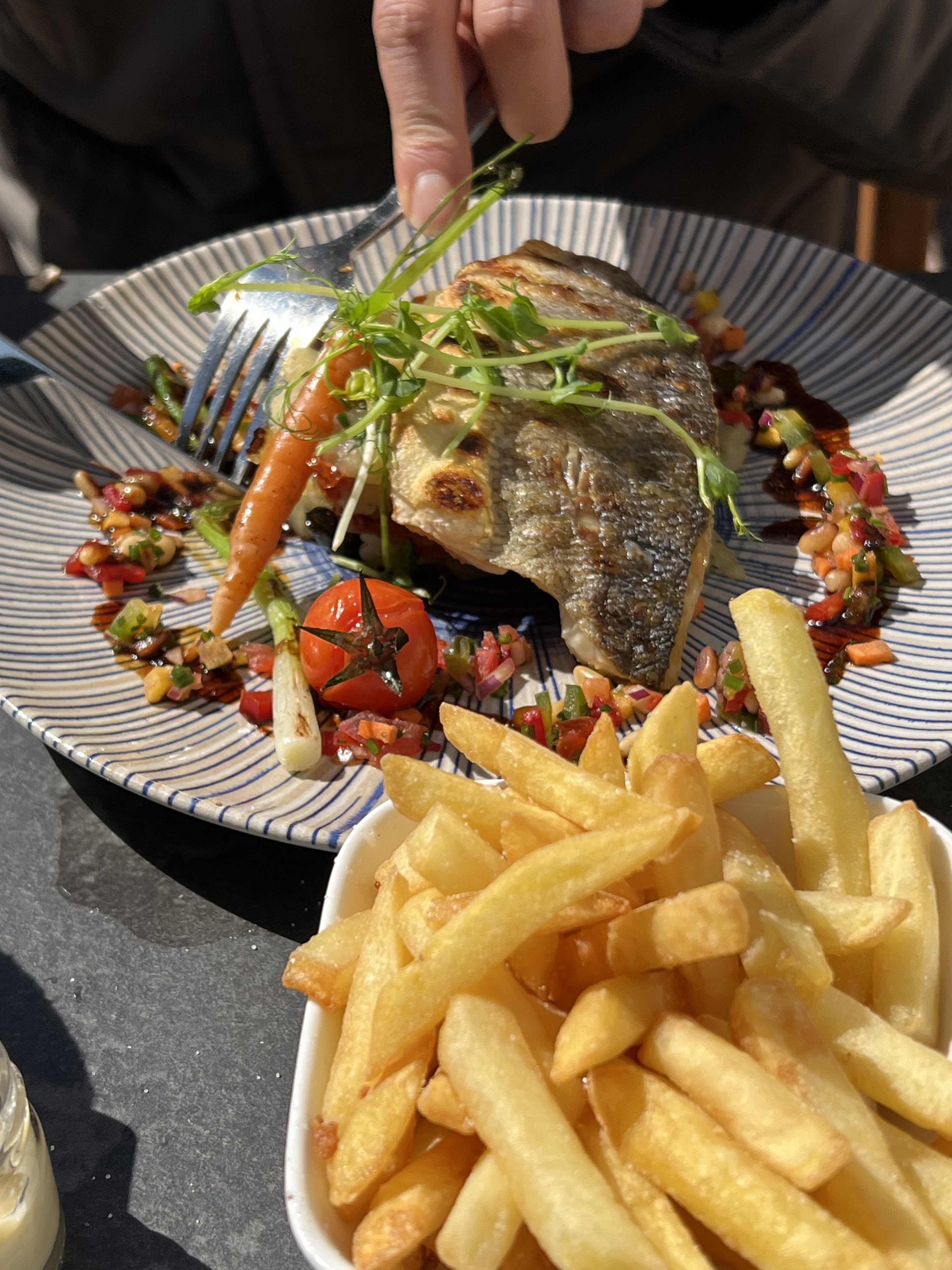 Déjeuner avec dorade grillée avec frites maison deux fois. Petit-déjeuner excellent sur la terrasse au soleil fin janvier! La formule petit déjeuner comprend jus d'orange frais, pain tradition et croissant remarquable servis avec deux plaquettes de beurre et deux petits pots de confiture. Café double ou thé sont également inclus dans la formule à 13,5 ou 13,90€. Personne ne fait mieux et moins cher sur la Croisette, on a comparé.