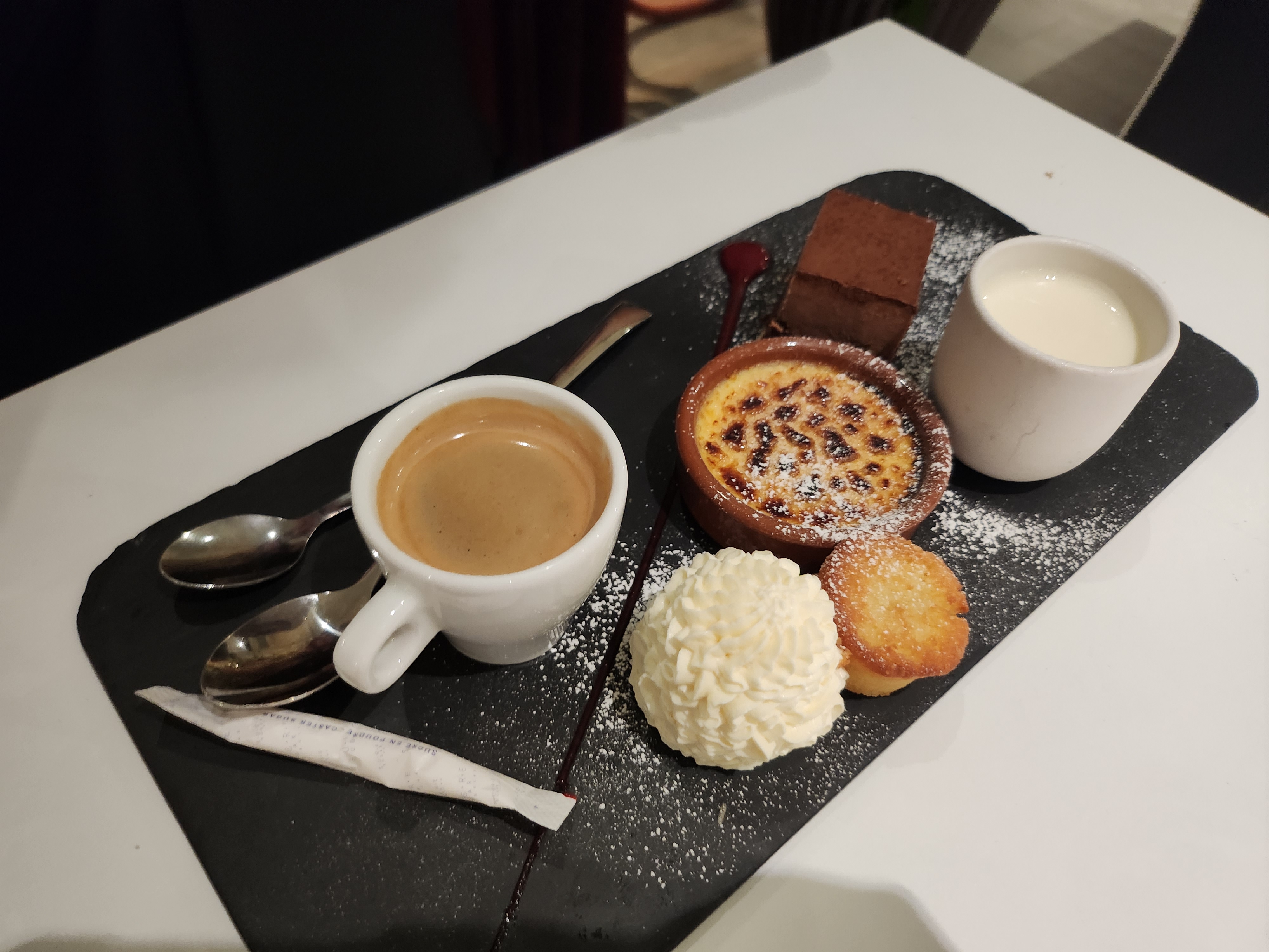 Nous avons l'habitude de venir boire le café dans cet établissement superbement placé café allongé bien servi 1€40 prix imbattable dans le coin Nous avons voulu tester le restaurant mais nous sommes un peu déçu mon épouse a pris le menu du jour mais la langue de bœuf pas suffisamment cuite immangeable signalé au serveur qui était désolé Moi j'ai prix le menu à 28€90 déçu par le saumon qui n'avait rien d'un gravlax par contre je me suis régalé avec la pièce du boucher et le café gourmand