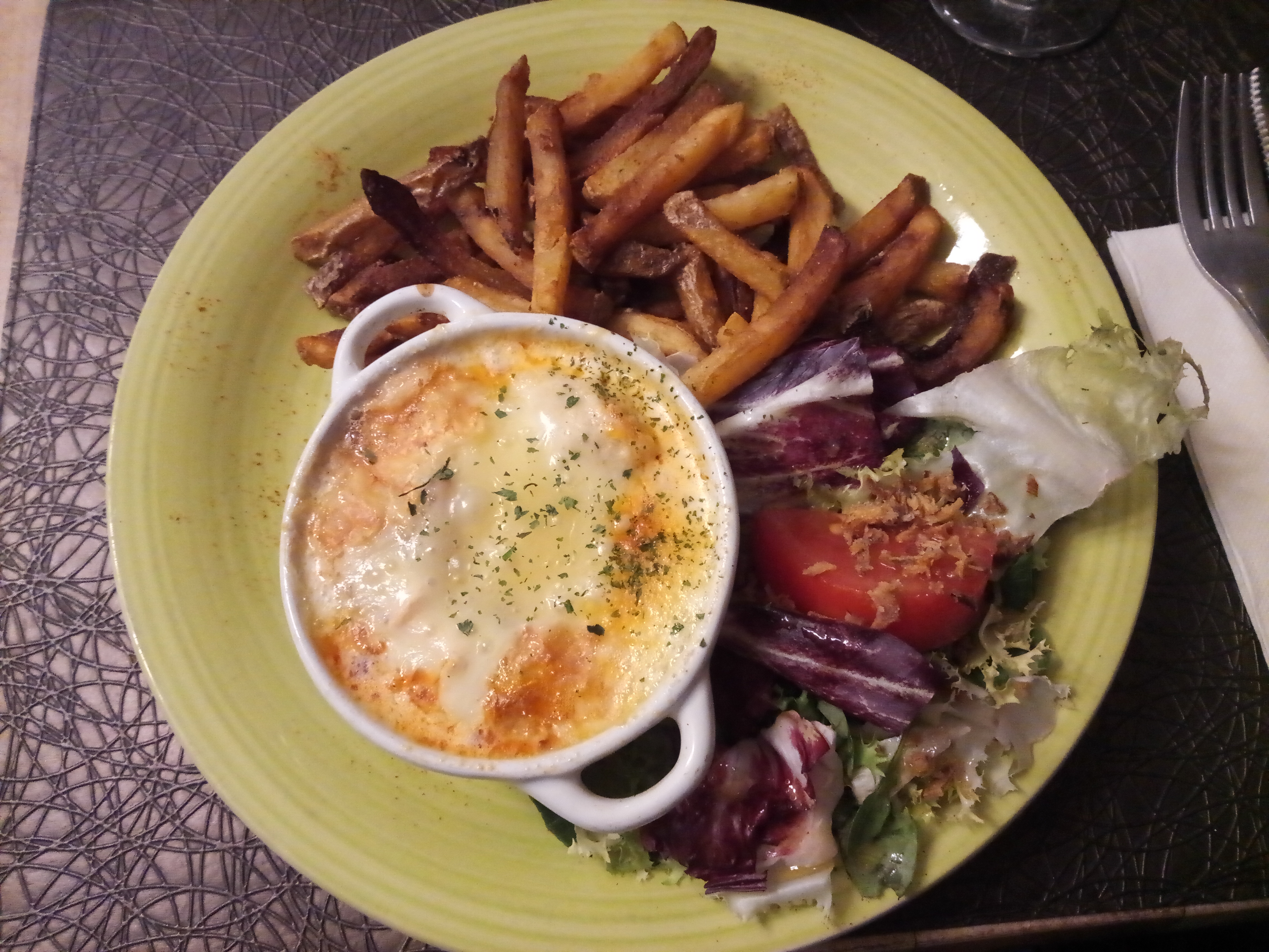Accueil simpatique. Repas bien mais haricots un peu cramés.. Pas dramatique mais dommage pour 17€ entrée plat dessert café.