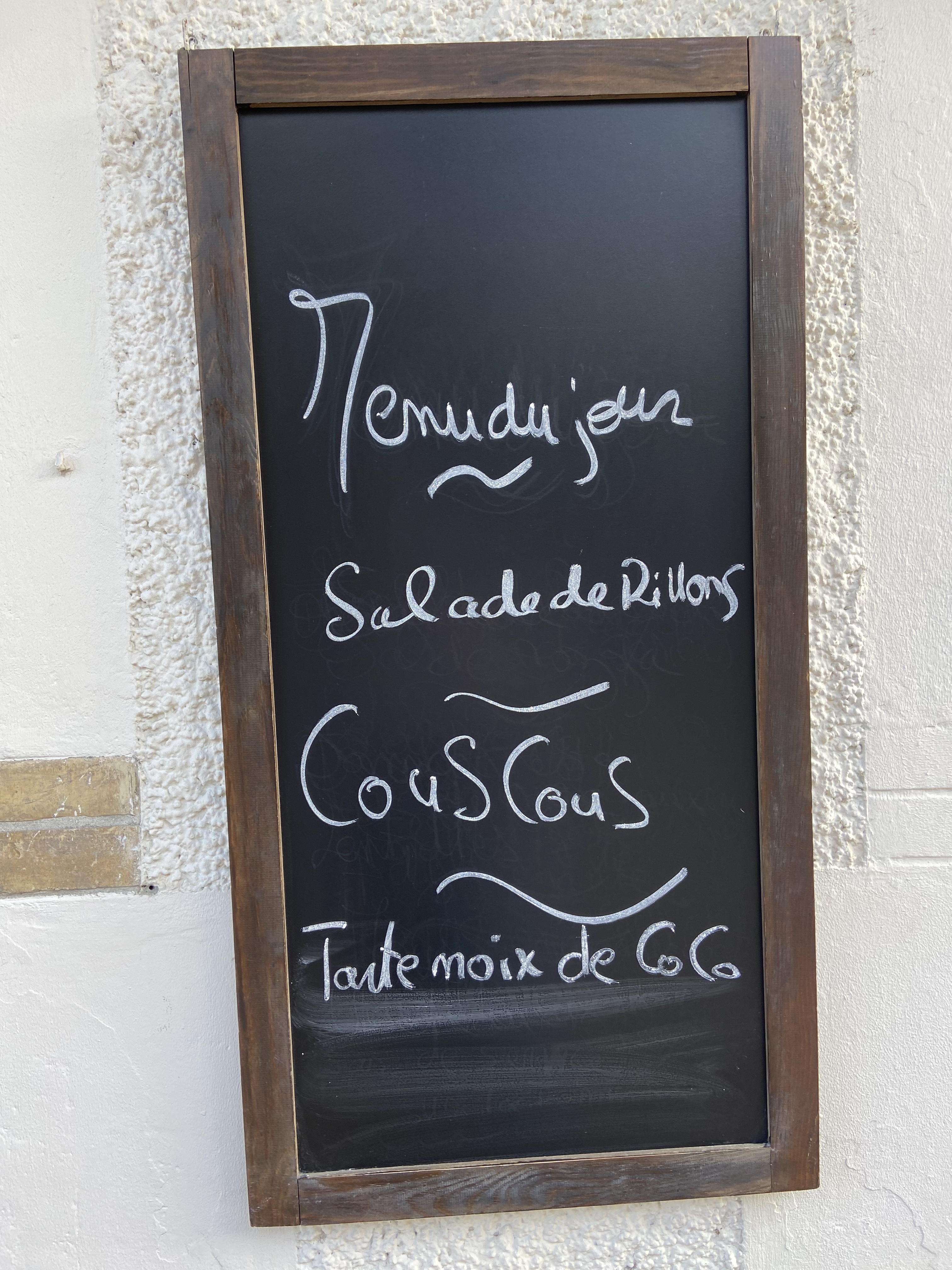 Nous faisions du vélo dans les vignobles voisins et nous nous sommes arrêtés ici pour un délicieux déjeuner. Ils n’avaient pas de menu fixe, mais sont sortis et nous ont indiqué les trois assiettes qui figuraient au menu du jour. Nous avons partagé trois assiettes entre quatre adultes pour le déjeuner et commandé des cafés et des thés. La nourriture était délicieuse et le total était d'environ 30 euros. Ils ont fait de leur mieux pour nous aider à communiquer avec nous malgré notre français basique. C'était agréable de s'asseoir dehors sur leur terrasse et de déjeuner. Il y avait des supports à vélos juste en face pour nos vélos.