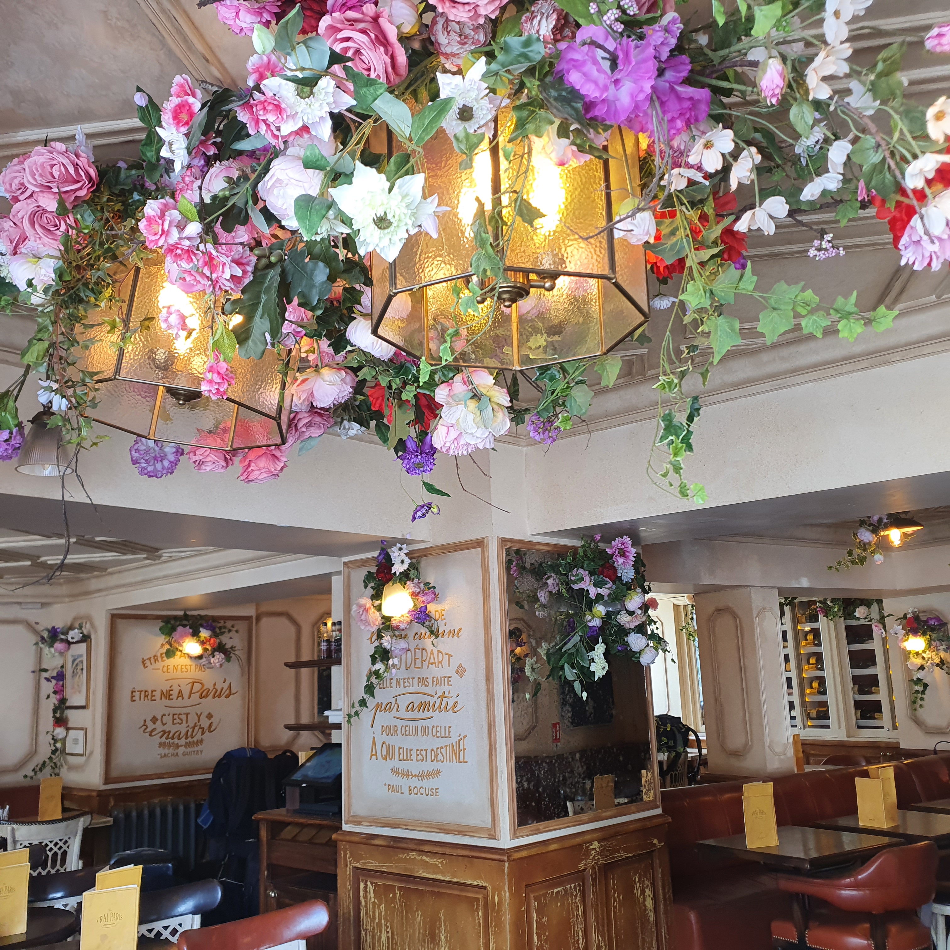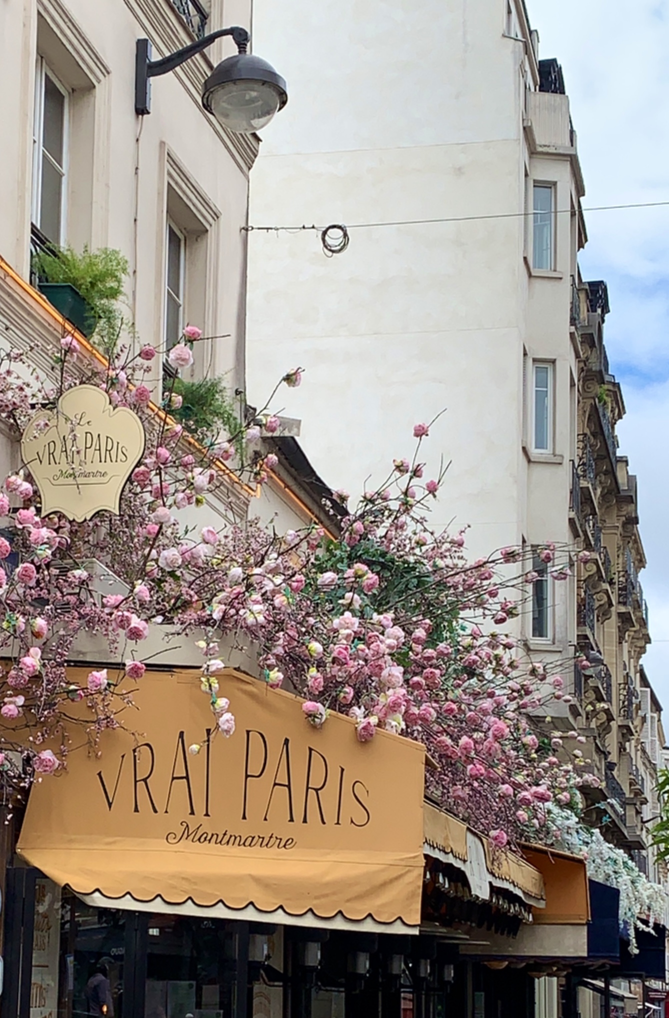 Les Abbesses de plus en plus jolies et agréables. Les décos floraux des cafés parisiens.
