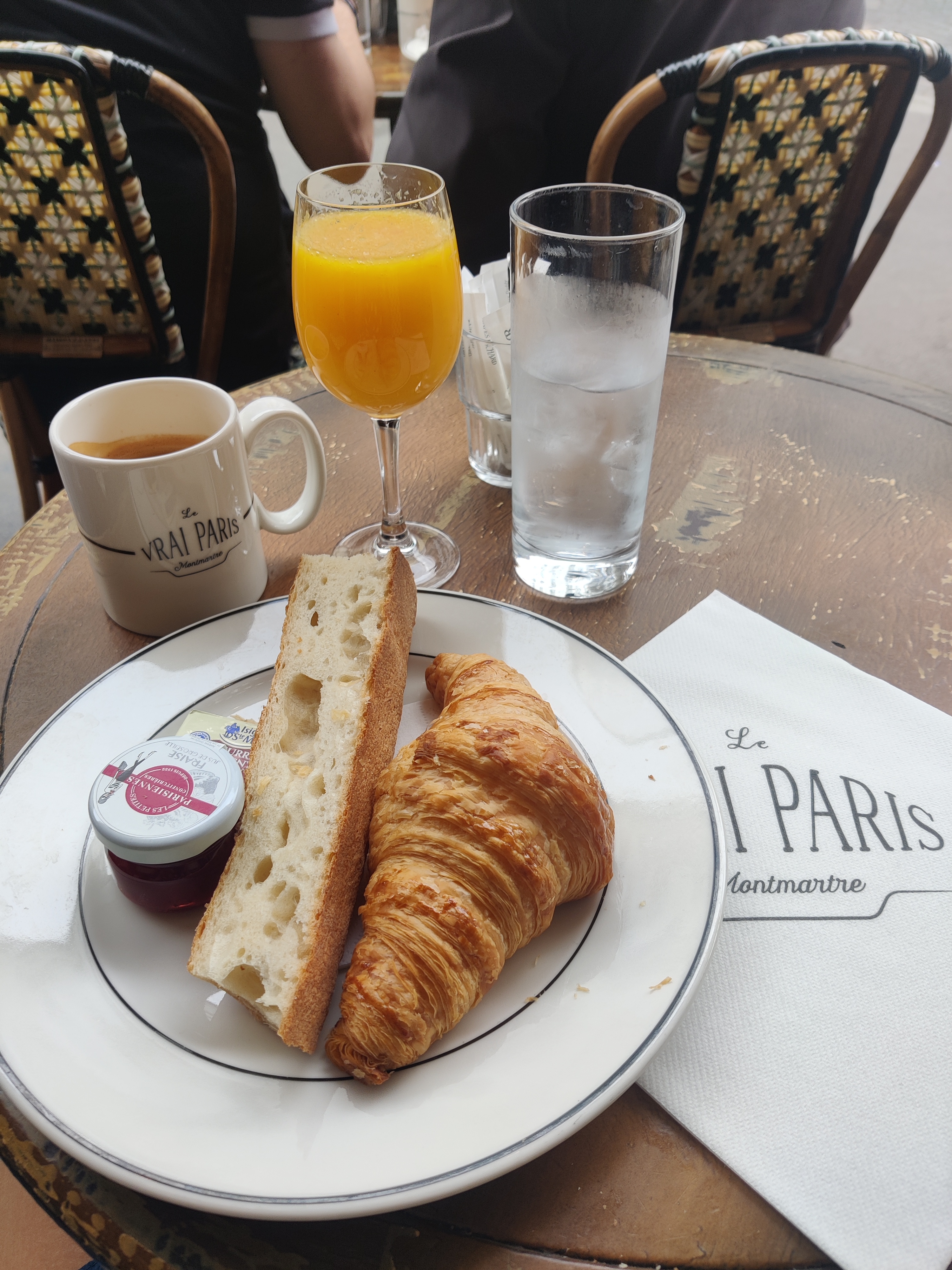 Le vrai Paris devrait s'appeler le vrai croissant : une tuerie bien feuilletée avec ce petit goût de beurre si rare: normal il vient d'en face, comme un grenier classé meilleur croissant de Paris. Of course, le reste suit: jus fraîchement pressé (attention parfois servi avec des glaçons), capuccino super. cadre sympa avec fauteuil cuir on y reste. serveuse cool, mais souvent les serveurs qui servent de la qualité sont cools.