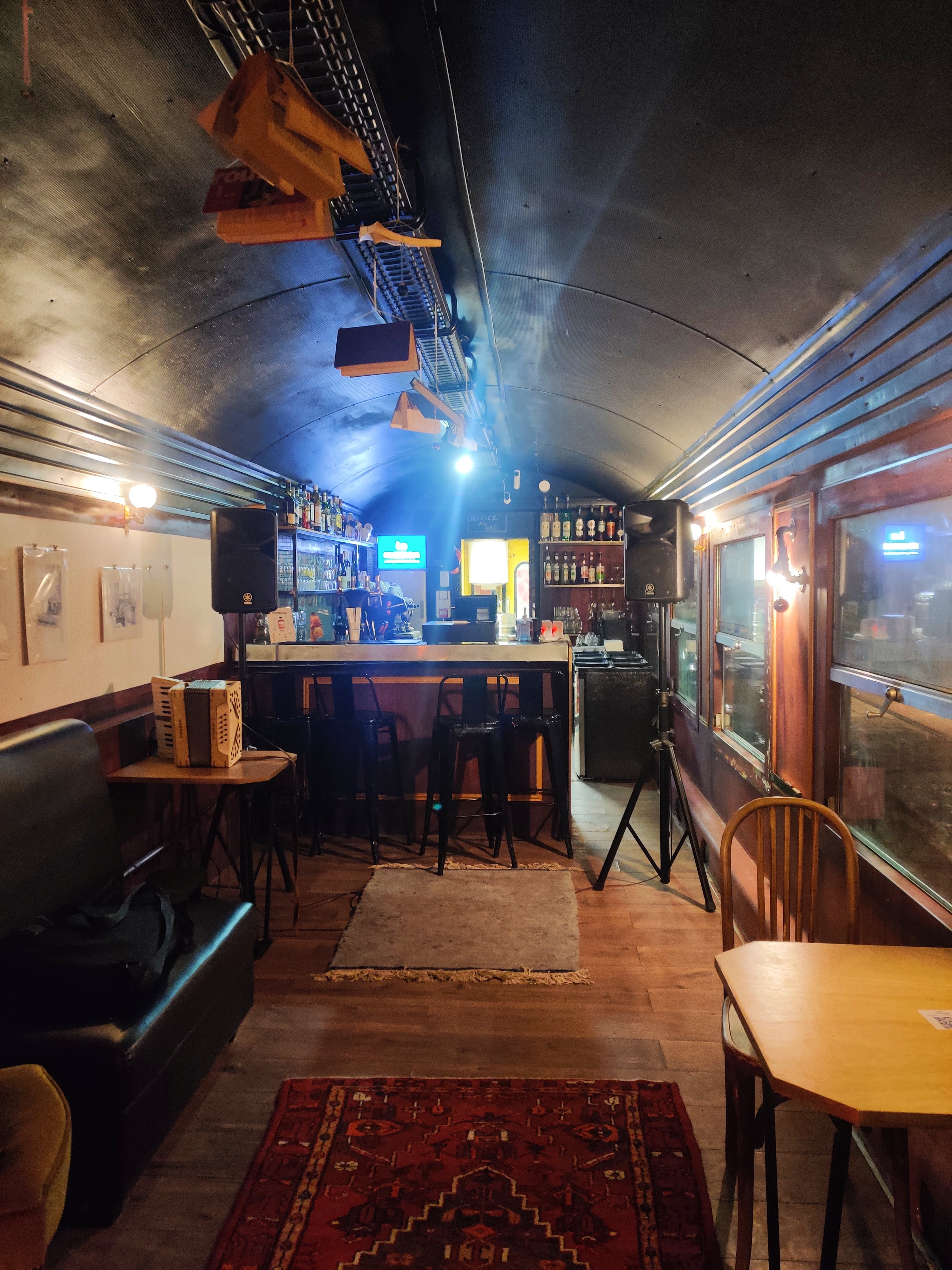 Endroit très cosy pour prendre un verre et manger quelque chose. Le wagon est absolument élégant à l’intérieur. Tout est un peu différent ici.