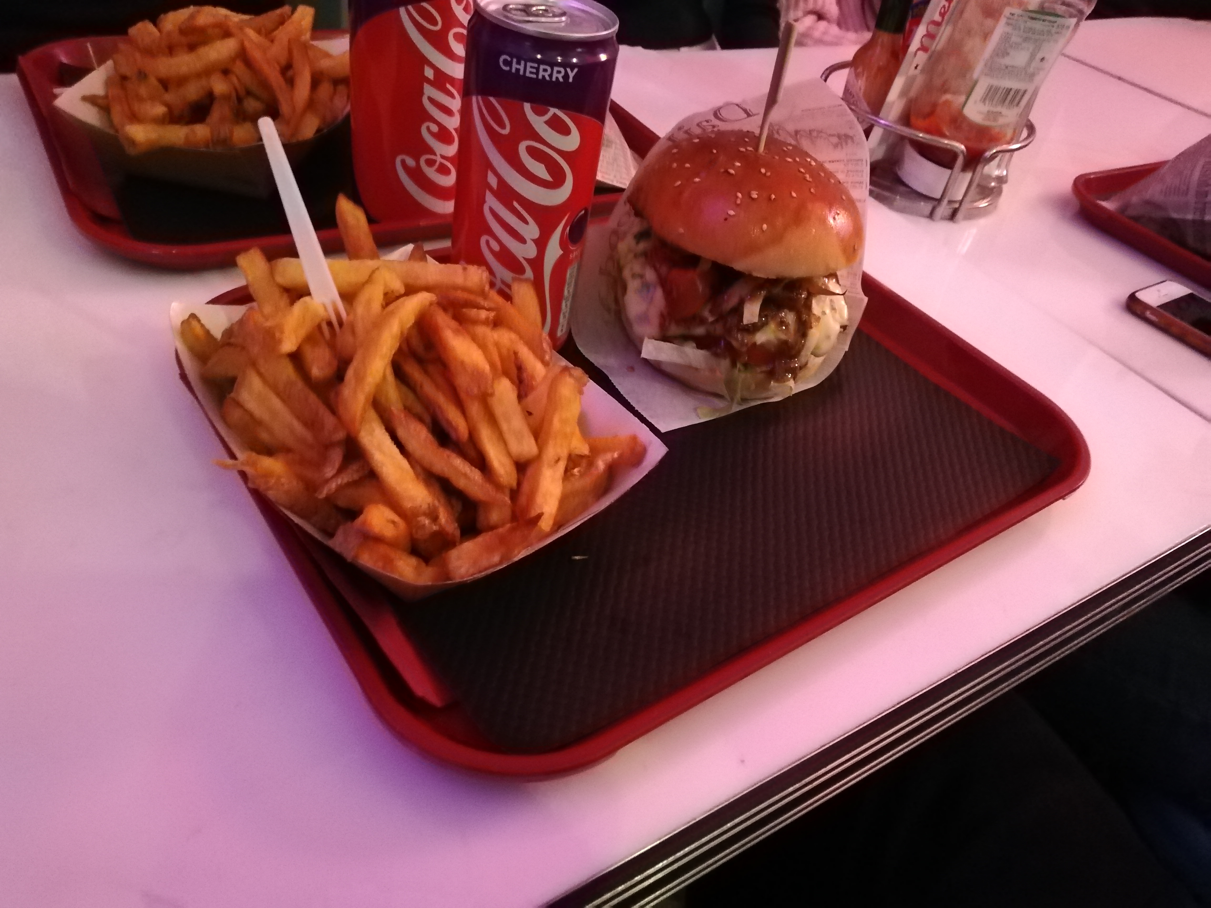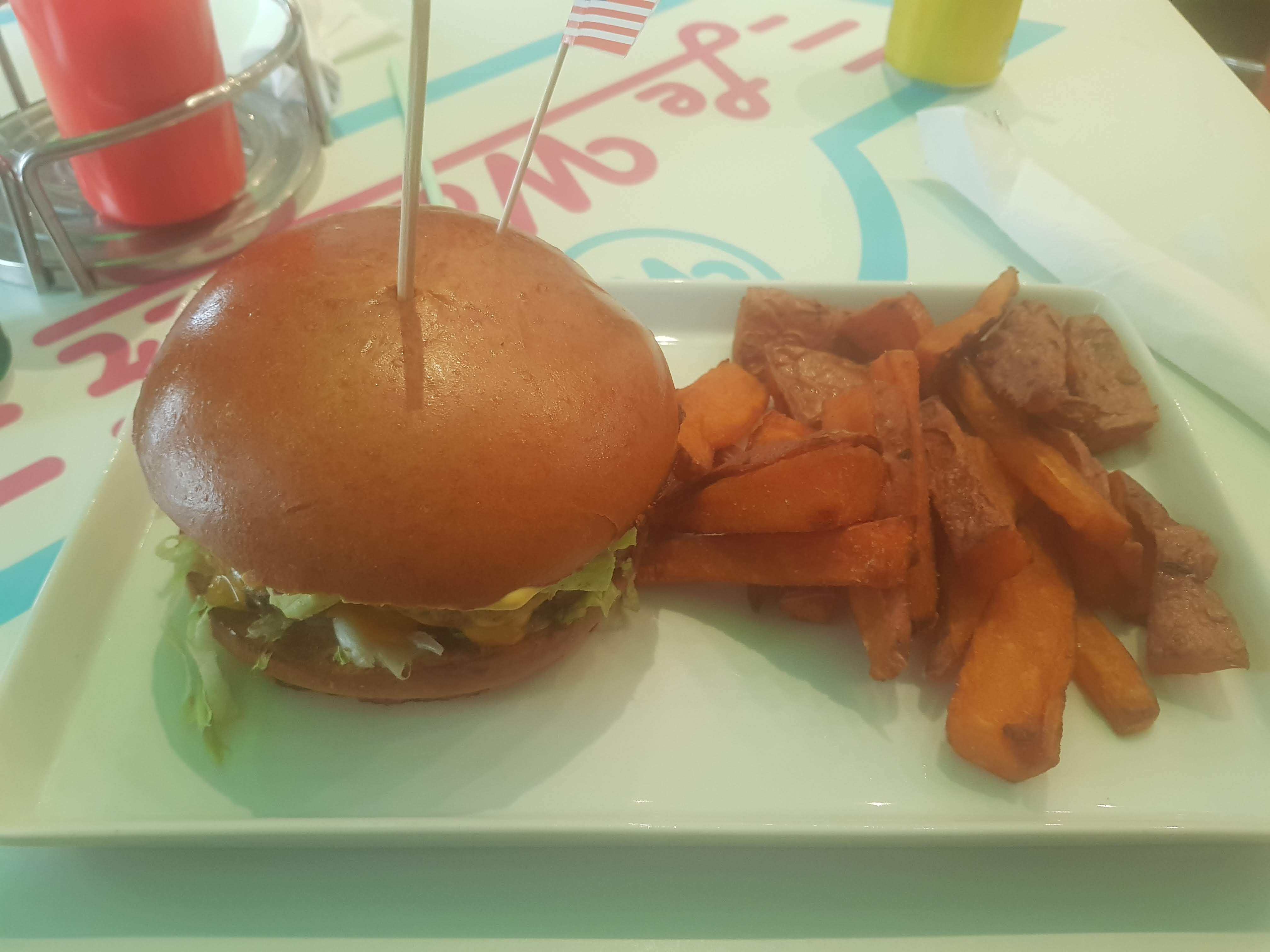 Nous avions réservé pour 11 personnes à l’occasion d’un anniversaire et celui qui nous a accueilli a gentiment déplacé des tables/chaises pour avoir la place nécessaire, car le restaurant n’est pas très grand. Cependant le décor est joli et les musiques qui passent nous mettent vraiment dans l’ambiance « États-Unis dans les années 80 » et c’est cool. Concernant à la nourriture: on sent que les frites sont faites maison, elles sont très bonnes d’ailleurs, et l’hamburger a un bon goût. Peut-être un petit peu cher pour ce que c’est ( 9,90€ le menu cheeseburger ) mais vraiment rien d’excessif vu la qualité. Nous avons attendu un bon moment quand même ( je dirais 20-25 minutes ) avant de recevoir notre plat, mais je mettrai ça sur le compte du fait maison ! De ce que j’ai pu voir, il n’y a qu’une seule personne en cuisine, ce qui n’est pas très pratique vu l’affluence qu’il y’avait ce soir-là. Le garçon à la caisse était aussi seul et il semblait des fois débordé, mais cela ne l’a pas empêché d’être très agréable et compréhensif. En conclusion, je recommanderai sans souci ce restaurant si on veut se faire plaisir avec un bon gros hamburger américain, mais plus en journée si on a vraiment faim !