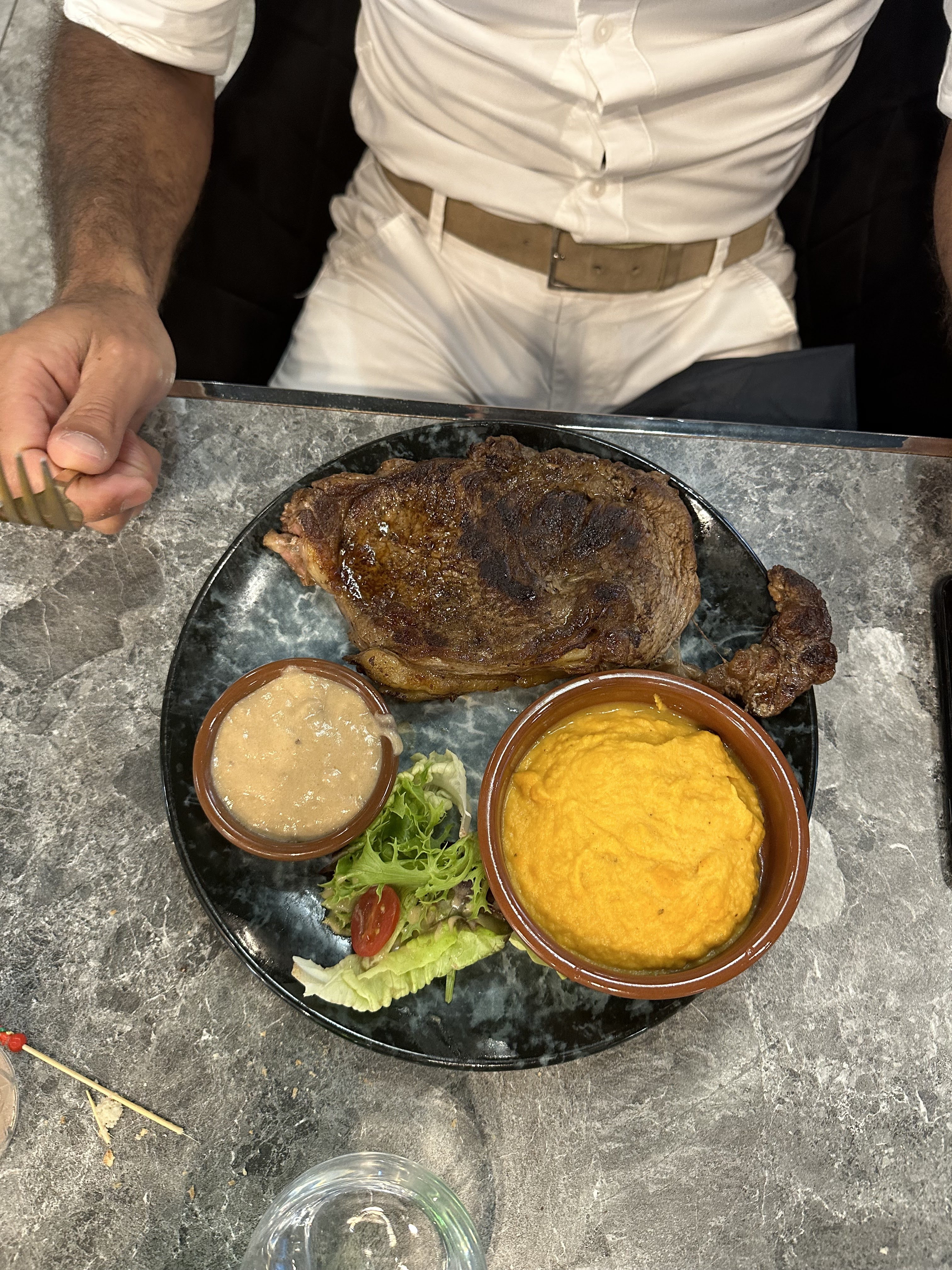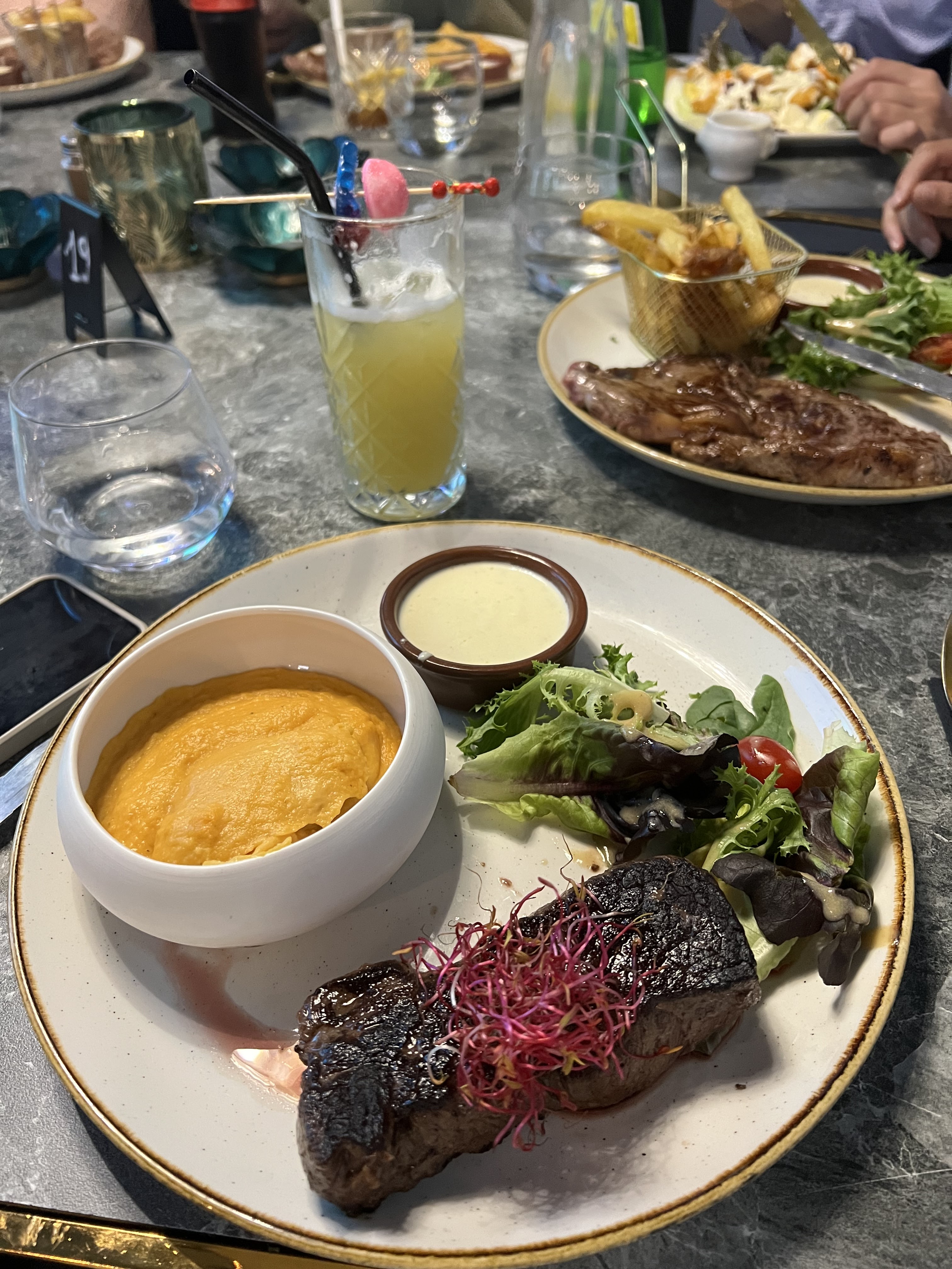 La pièce du boucher était tendre et délicieuse, cuite parfaitement à la demande, ainsi que la purée maison et les pdt grenailles. Mention spéciale pour la brioche perdue 👌