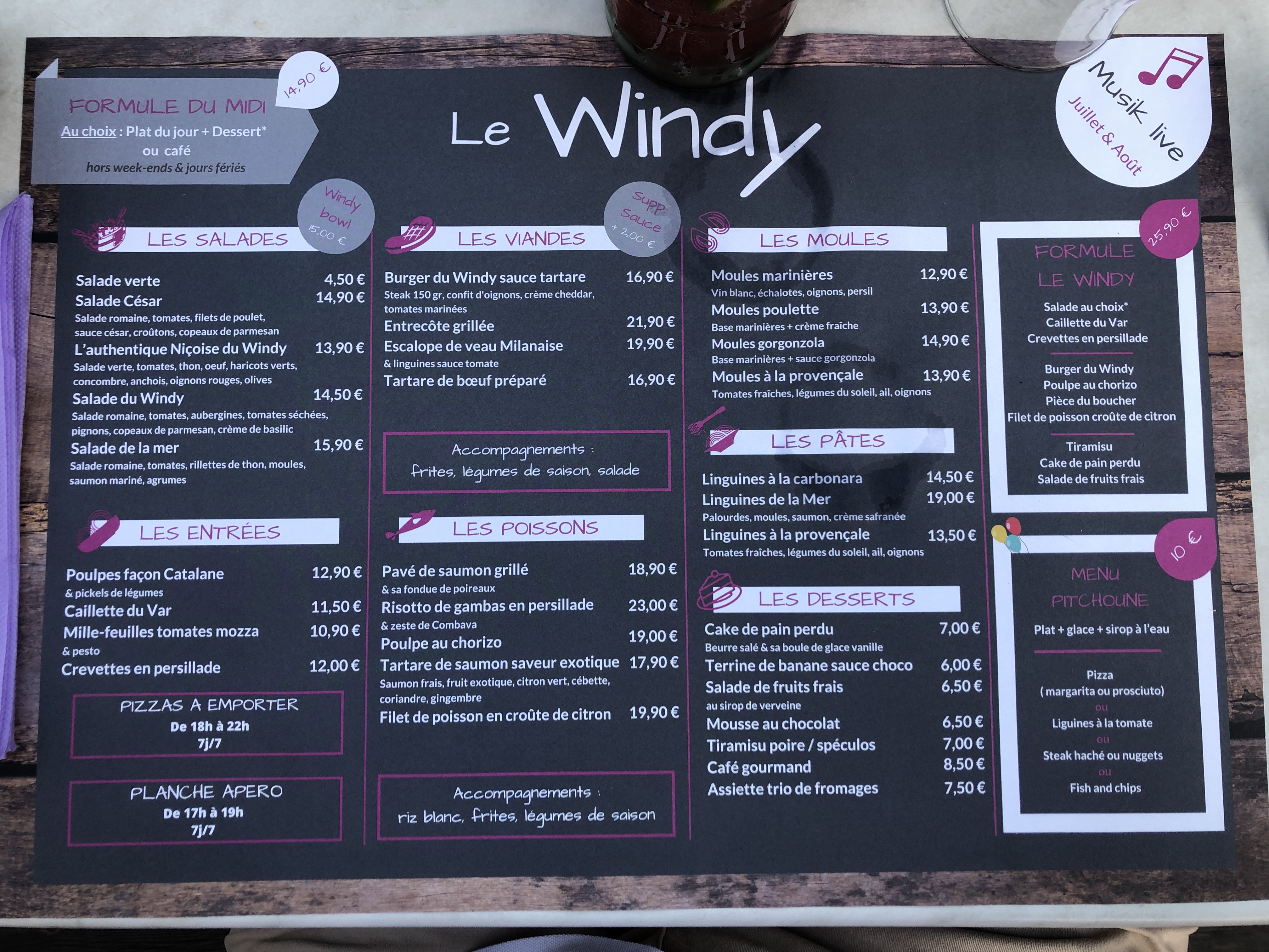 Sommes ravis comme tous les ans d aller manger au windy. A notre table: pizzas, moules à la crème, linguines carbonara, wok gambas, hamburger. Rien à dire! Et le patron, toujours le sourire et à l écoute de ses clients