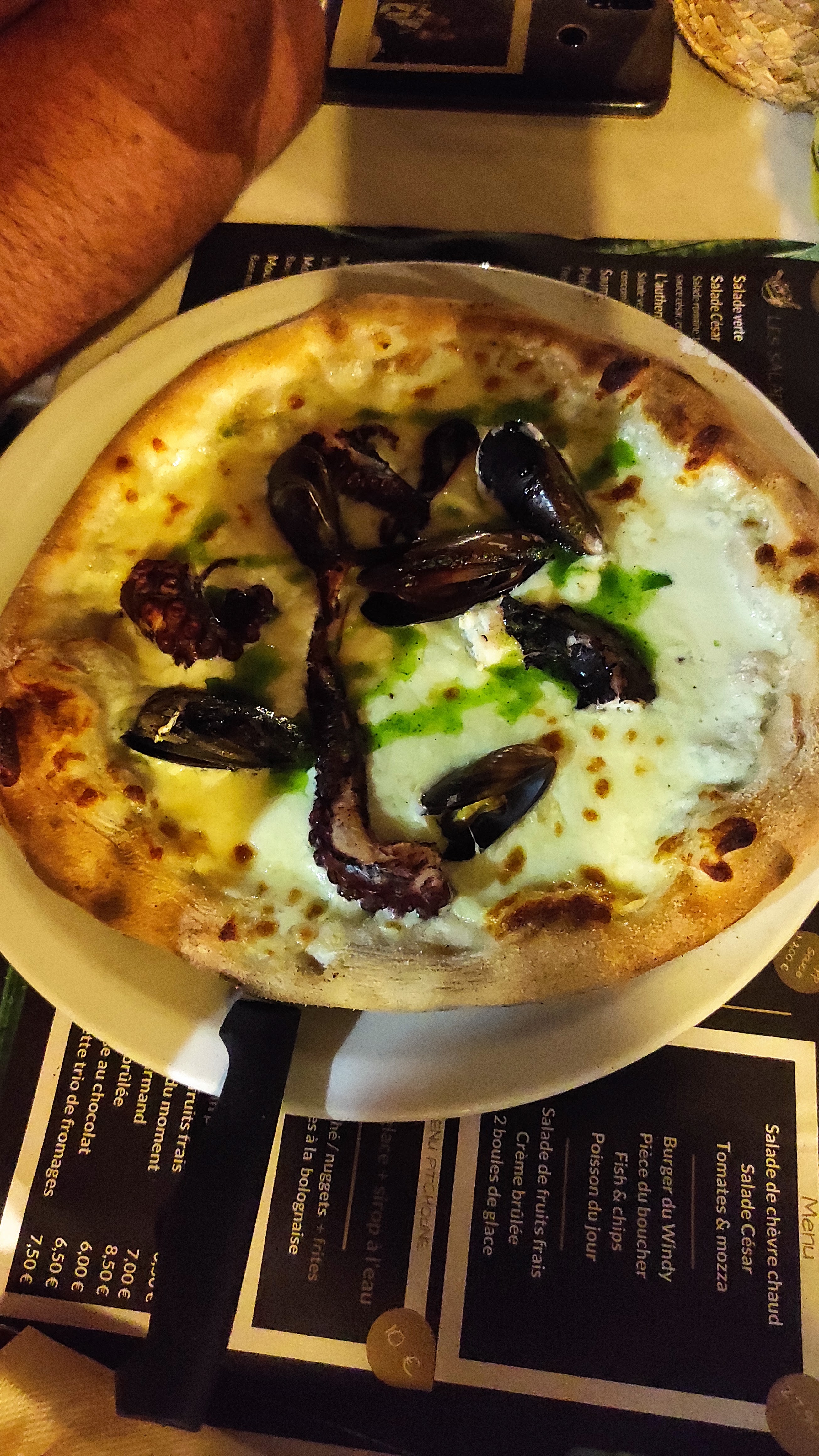 Nous y étions Jeudi soir (12/08). Repas plutôt bon dans l'ensemble (hamburger et moules frites) et Tarifs convenables pour du bord de mer👍 Pour les moules, si vous avez une grosse faim ça risque d'être juste. Pour le repas enfant comptez 10€.....(perso je pense que les restos en général abusent pour le prix d'un repas enfant pour ce qui est dans l'assiette). Crème brûlée et glaces bonnes👍 Notre nappe n'était pas nettoyée par contre, miettes et quelques petits restes dessus....dommage ça prend 2mn. Au niveau du Pass sanitaire......une pancarte est devant, par contre on ne nous l'a pas demandé, peut être un oubli de la part du serveur......?🤔 (nous sommes vacciné heureusement) Je recommande, on y retournera pour essayer autre chose. Voilà, comme annoncé nous avons essayé autre chose: veille de départ nous avons commandé les pizzas🍕à emporter. Franchement, je recommande sans hésiter 👍 Bonne pâte, bons ingrédients et en quantité 🍕et bien cuite. Nous avons commandé une Parma (en photo), une Regina et une 4 fromages, vous avez très bien mangé avec un pizza, et je ne suis pas un petit mangeur😏