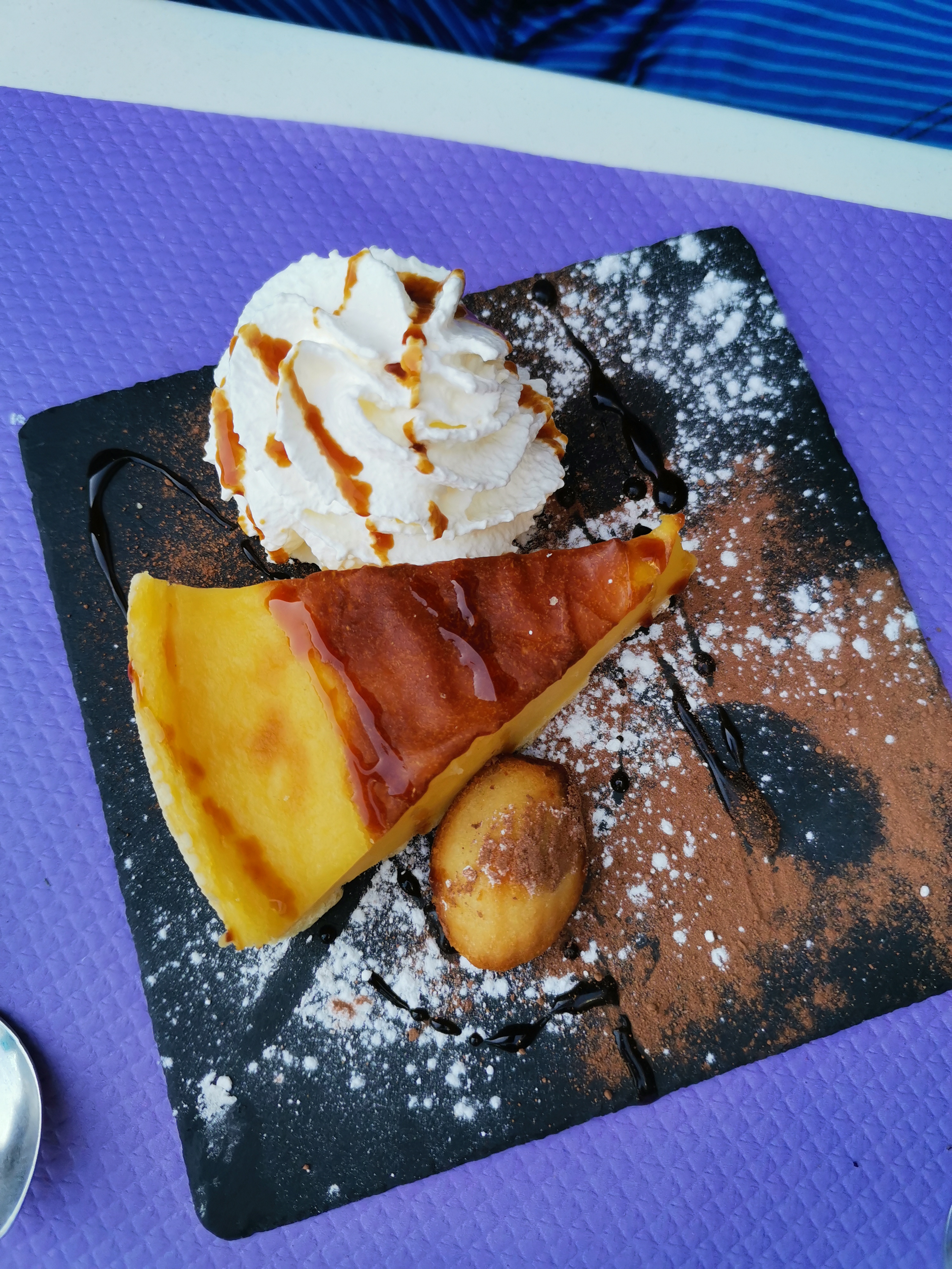 J'y ai mangé plusieurs fois pendant que nous campions. Le dîner était ok. la sélection est bonne. Malheureusement, aucun pain n'a été reçu avec les tapas, seulement après en avoir fait la demande. Cocktails malheureusement médiocres. Nous n'avons pas aimé le mojito. C'était aqueux. Très amical avec les chiens. Pour le petit-déjeuner, des pâtisseries avec du café et des jus de fruits sont proposés. Le jus de fruits frais est excellent, mais le café est malheureusement aigre - il n'a pas bon goût. La crème brûlée était brûlée et avait le même goût.