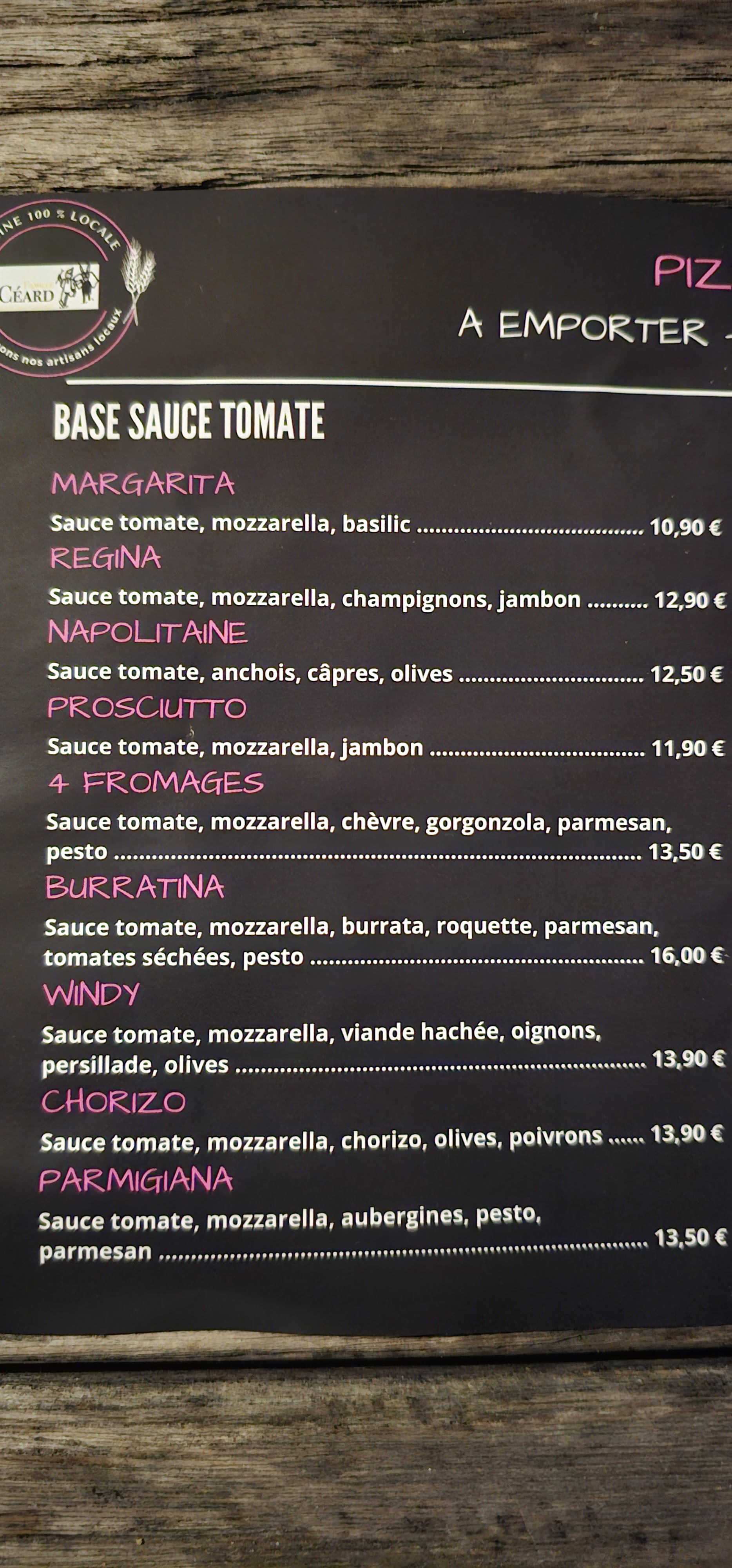 On a pris à commander une pizza burratina, sur leur photo de Facebook (menu) 14€ la pizza arrivée sur place 16€ la pizza (il serait peut être bien de mettre les prix à jour) Ensuite 16€ pour manger de la roquette ? Et une burrata ? Tomates séchées très peu et aucun goût de pesto comme indiqué sur le menu , vraiment très déçu je ne conseille pas du tout !! Bien contente d'en avoir pris que une pour 2 pour pas à dépenser de l'argent à tout vas dans le vide.