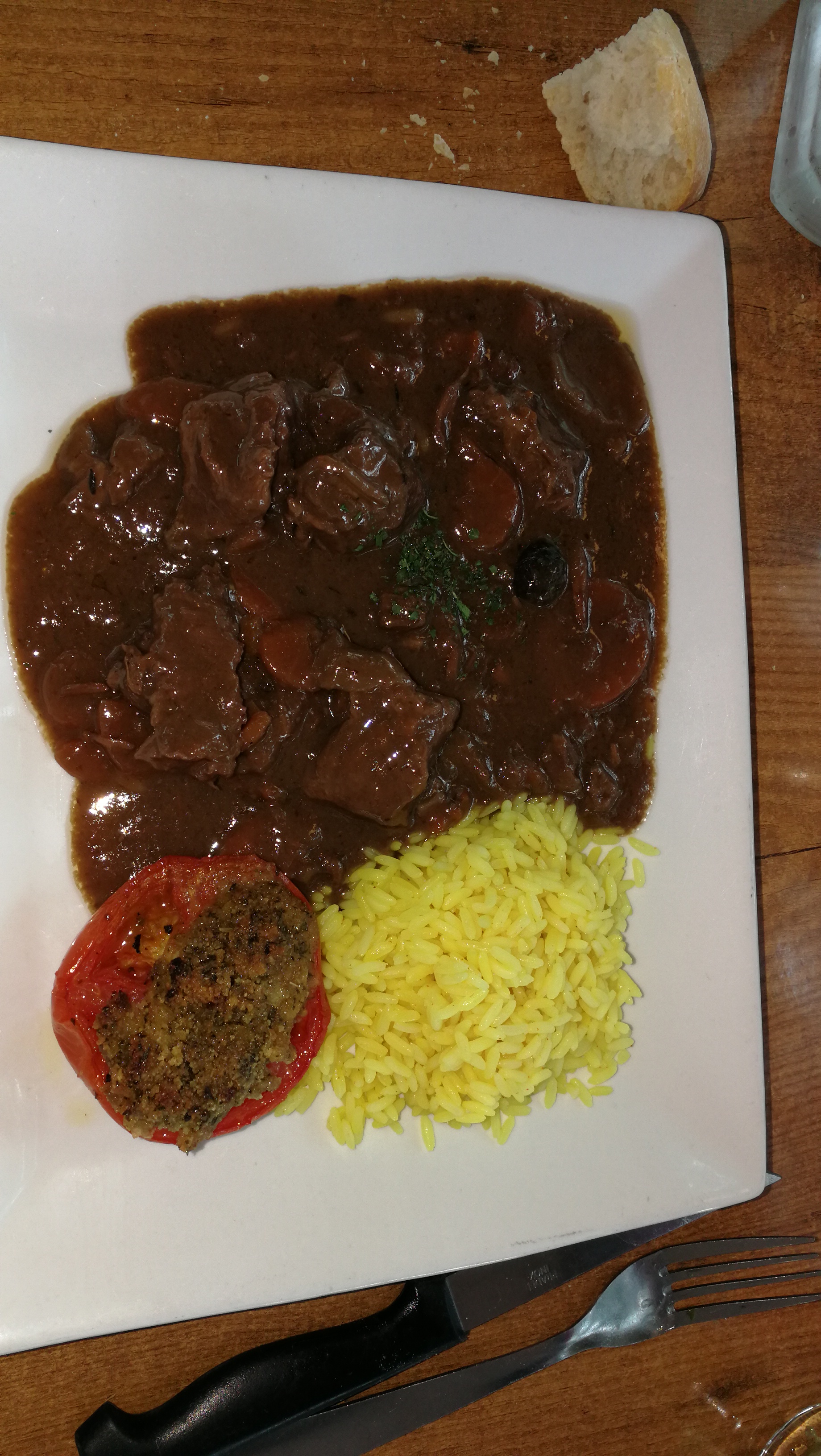 Repas très industriel rien de fait maison je me suis arrêté la car il proposait une gardienne de taureau j'ai eu une daube de quelques choses mais j'ai un gros doute sur le taureau je me demande si ce n'était pas du bœuf bref pour de l'industriel c'était bon Attention au menu à 15,90 euros (entrée +plat +dessert) sur 7 entrée 2 sera facturé un supplément sur 6 plats 1 sera facturé un supplément et sur 6 dessert 1 sera facturé un supplément donc vous risquez de passer de 16 à 20 euros ça fait quand même 25% de plus
