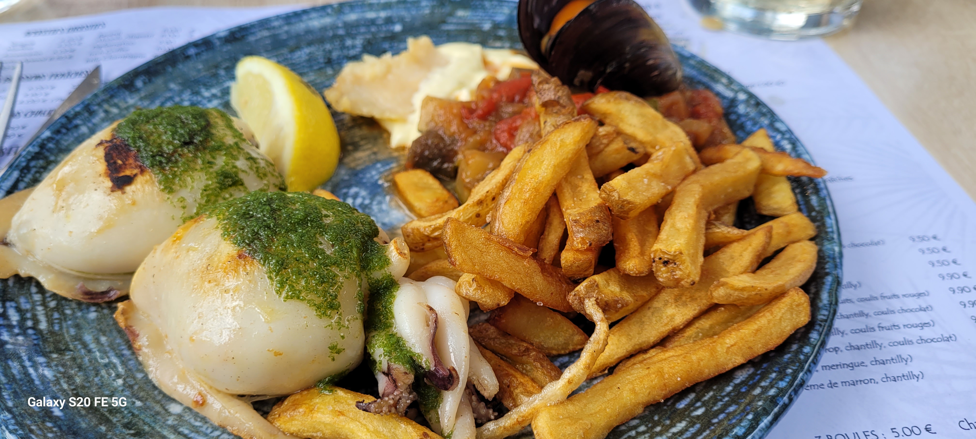 Que dire , Assiette du pêcheur ,une tuerie et notre plat était 2 belles seiche , fraîche avec frite ou riz au choix , et ratatouille, plus dessert , pichet de vin et 2 café pour 59,10€ rien a redire ! Tout est copieux serveuse agréable ! Souriante Nous reviendrons lors de notre prochaine visite sur Carnon !