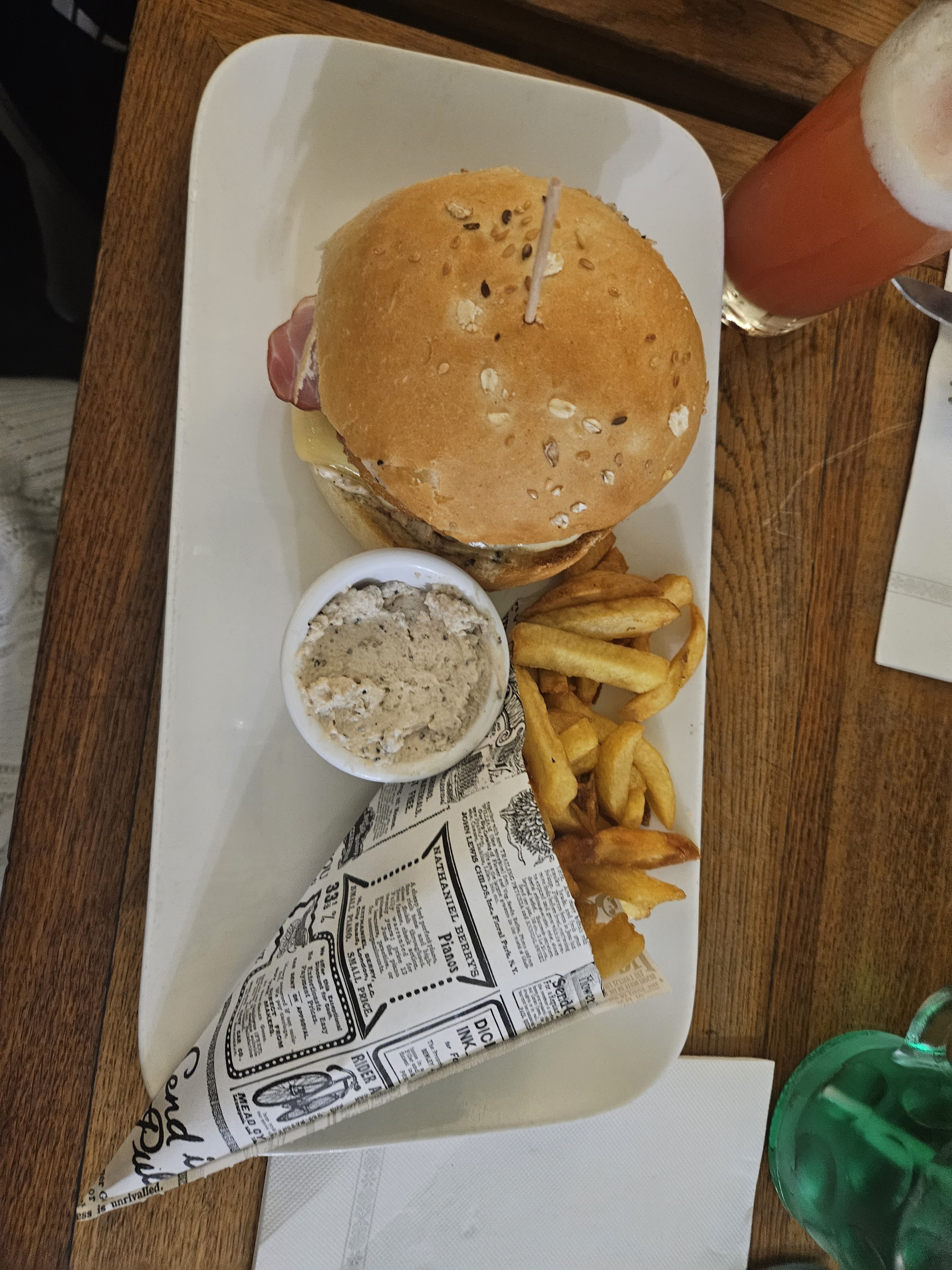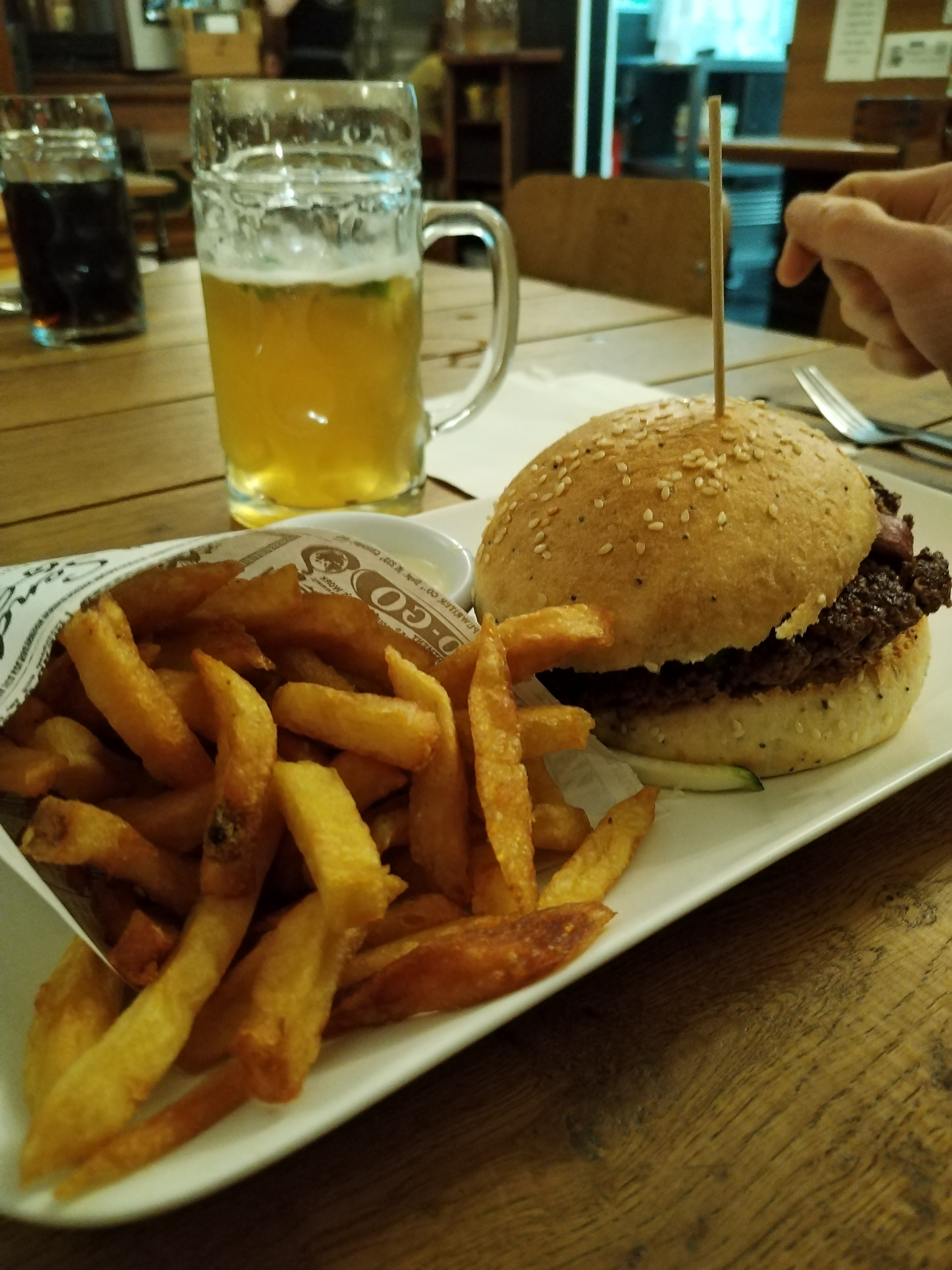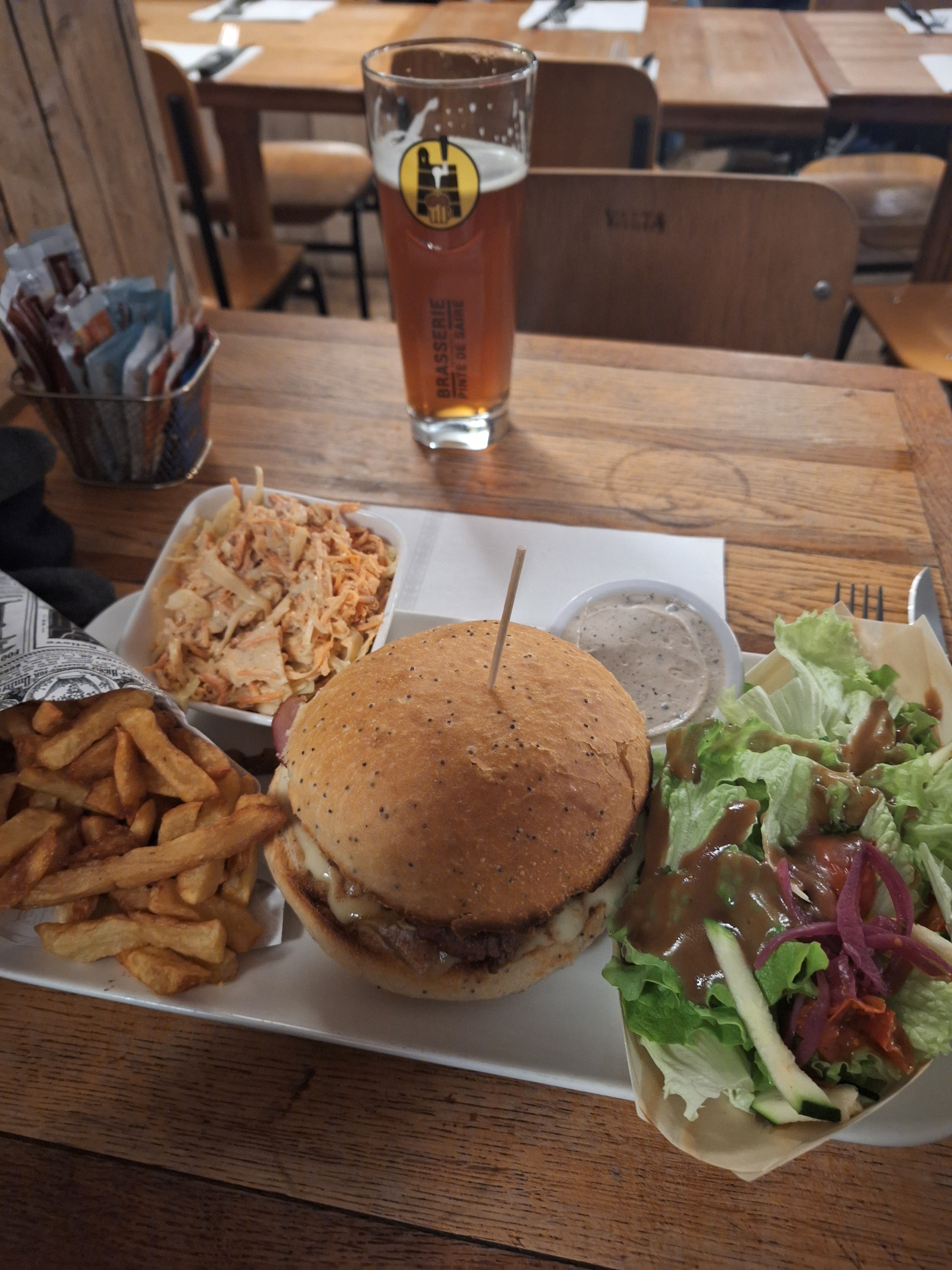 Faire payer la sauce et les frites est un scandale. Encore plus quand la.le serveur.e ne prévient pas et ne demande pas si nous voulons un verre de 50 cl ou non, permettant ainsi de ne pas payer les frites. Cependant, elles sont bonnes. Les verres de 50cl sont généreux. L'hamburger est lui pas super. Le cadre est sympa de l'autre côté, c'est à dire à droite des escaliers. Sinon, il est neutre.
