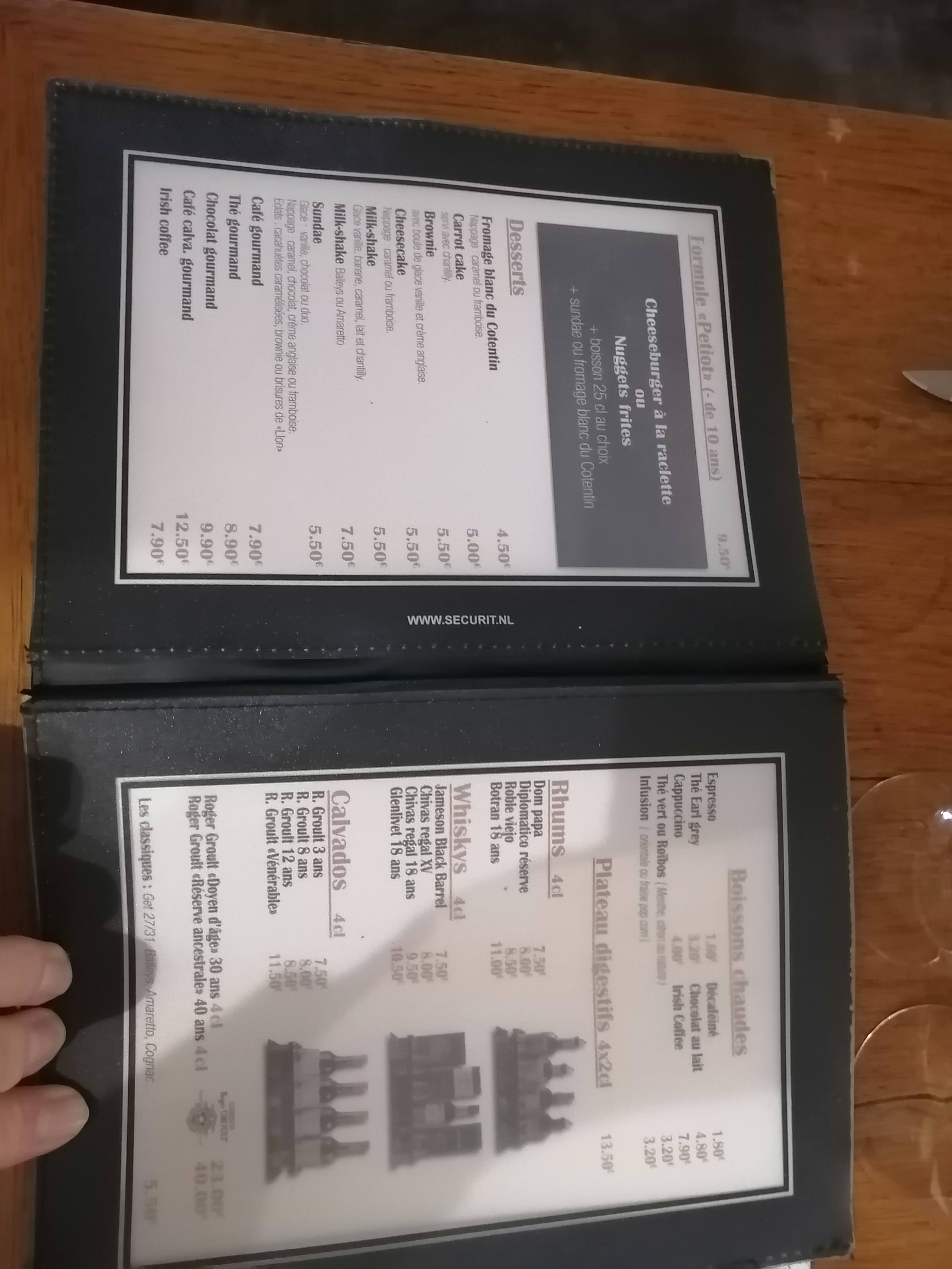 5 adultes avec cocktails ,kir Normand,1 plateau charcuterie servi pratiquement avec notre commande pas cool !!! Les hamburgers bons mais tous froid, un fish chips très copieux et bon .malgre 50cl de bière, de 50 cl de cidre ,toutes les frites étaient sur notre addition, après vérification du ticket, j'ai réclamer les frites gratuites ,mais le cidre n'est pas pris en compte ?? Donc demandé votre ticket !!!!