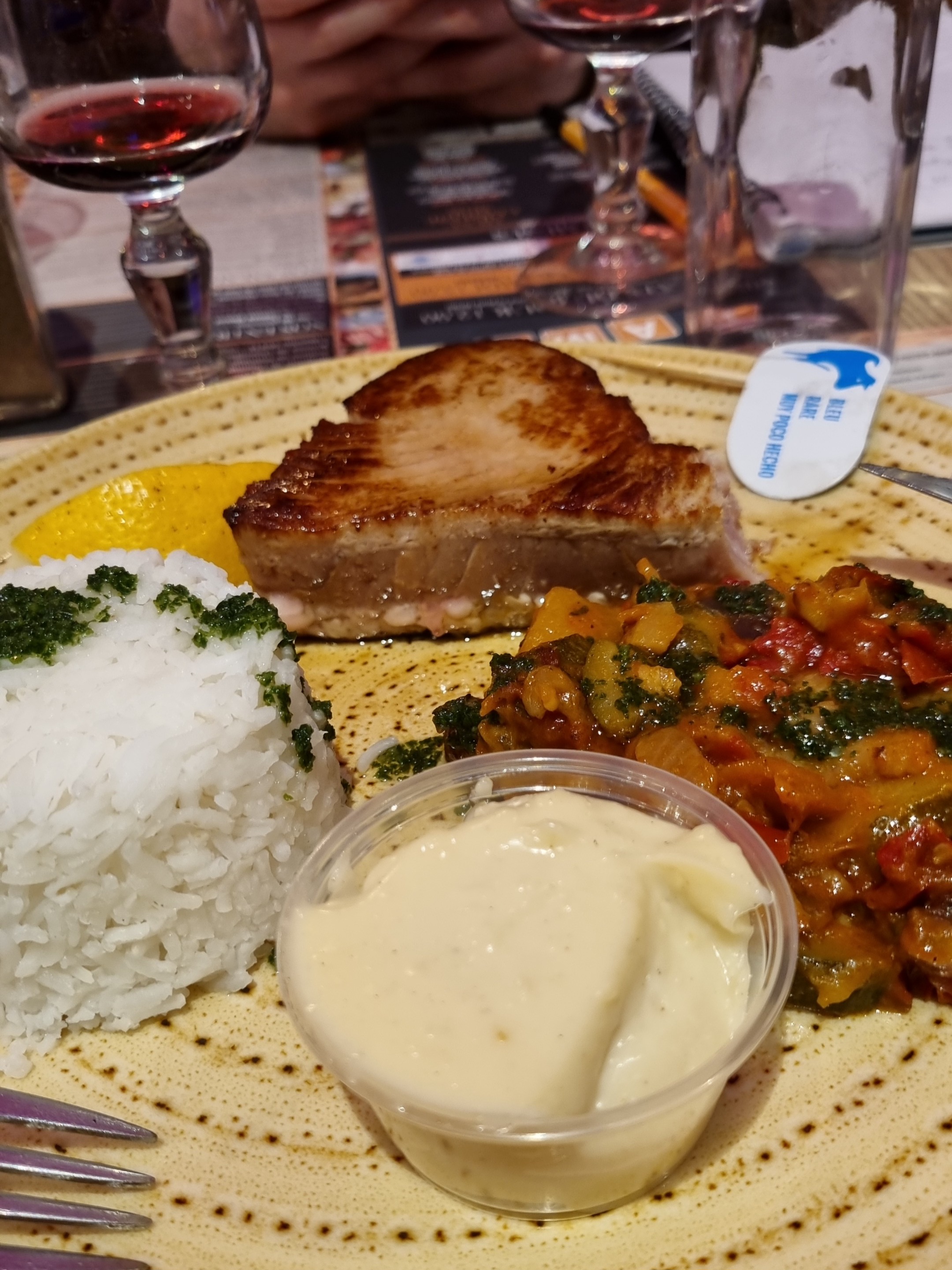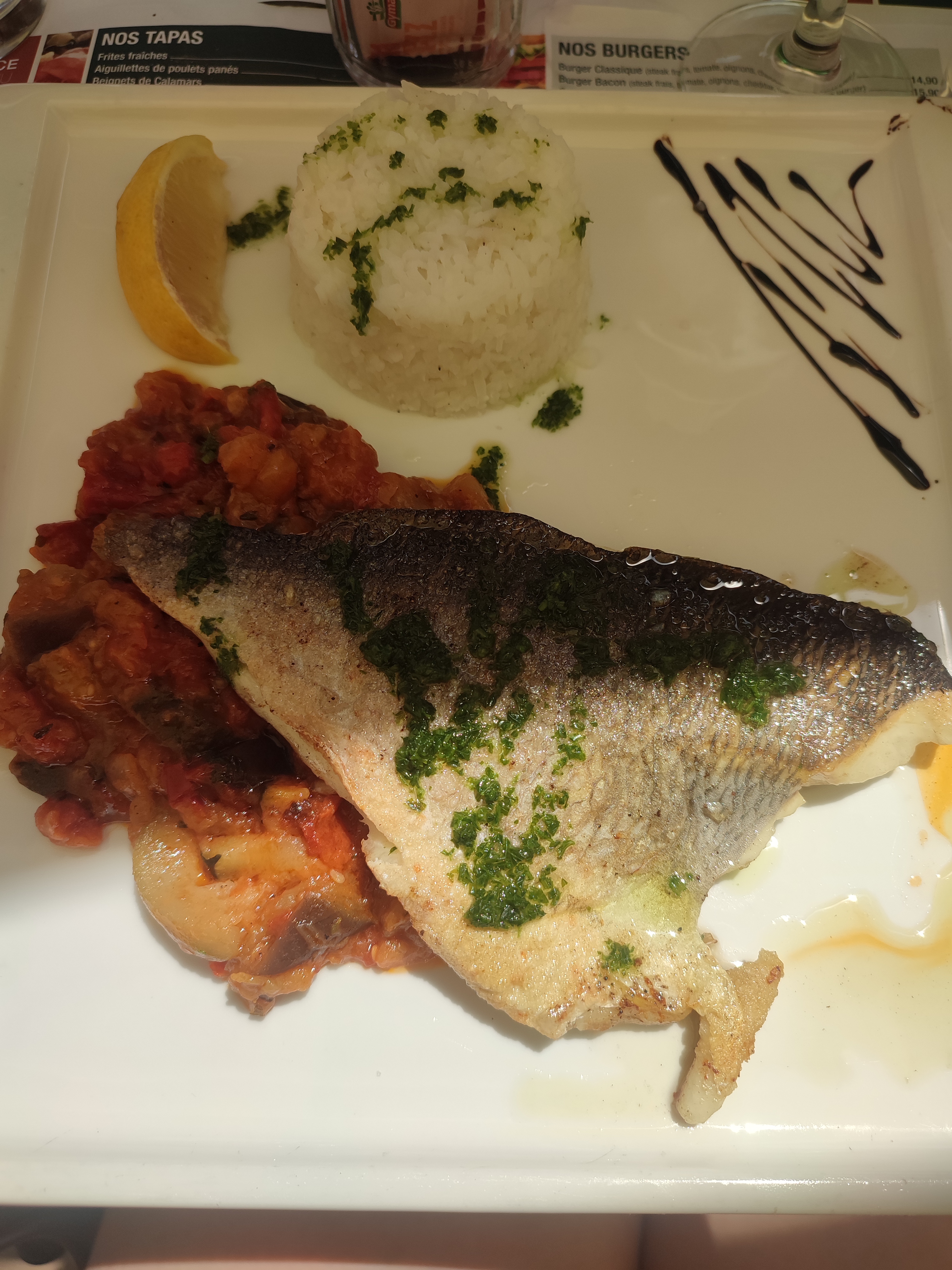 Entrée moules gratinées très bonnes, le plat travers de porc caramélisé pas du tout caramélisé et beaucoup de gras ! Les gambas bonnes bien cuites, l'aïoli pas terrible, riz fade, haricot vert pas assez cuit, mousse au chocolat bonne. Par contre super service, le serveur apporte sa touche d'humour.