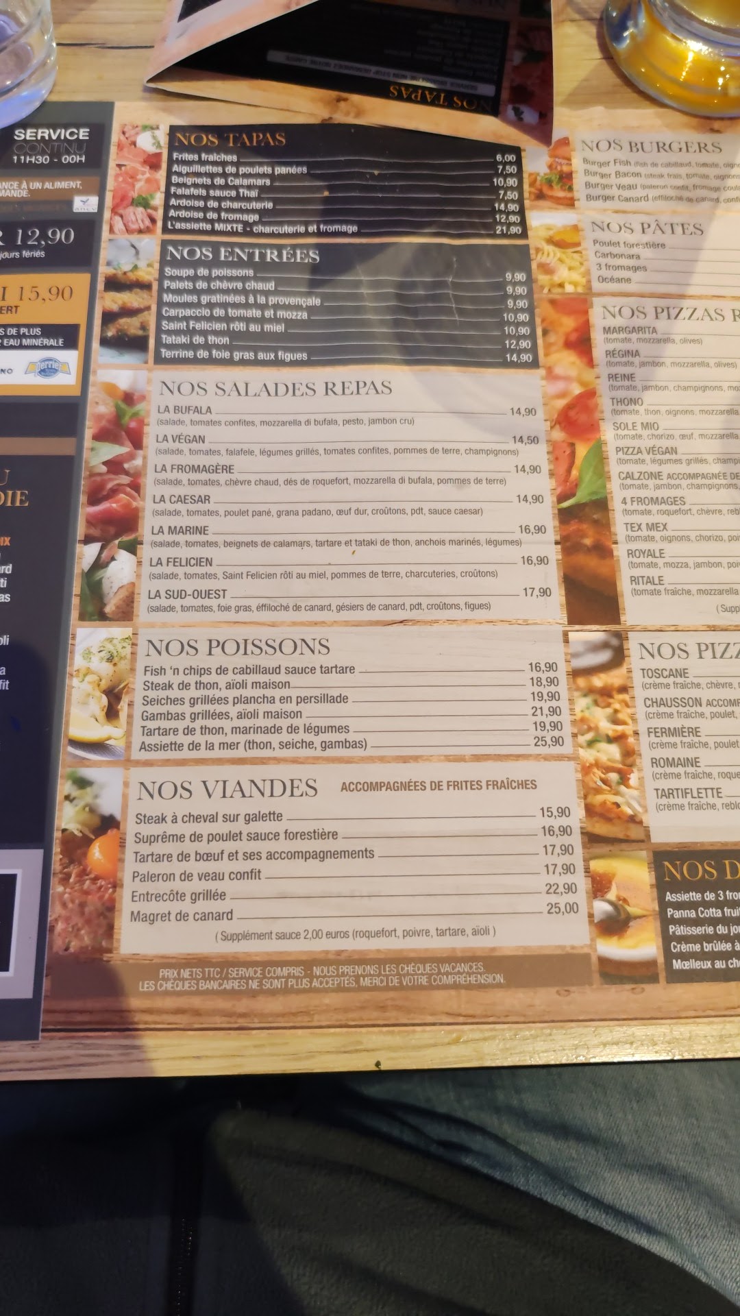 Menu à 20,90, moules gratinées en entrées. Résultats 5 moules quasi vides, plus grillées que gratinées, sans goût. Soit on a la qualité soit la quantité, dans ce cas il n'y avait ni l'un ni l'autre. Pièce de boucher et frites, pas de goût particulier. Dessert correct sans plus. Pas fait maison c'est sur mais bon .. Service, en fonction du serveur, certains savent juste jeter l'assiette, d'autres tentent d'être agréables avec le client. Point positif, le café et la rapidité. C'est l'été, peut être des saisonniers, mais cela ne donne pas envie d'y revenir ou pour une pizza, pas besoin de compétences de cuisinier pour en faire une.