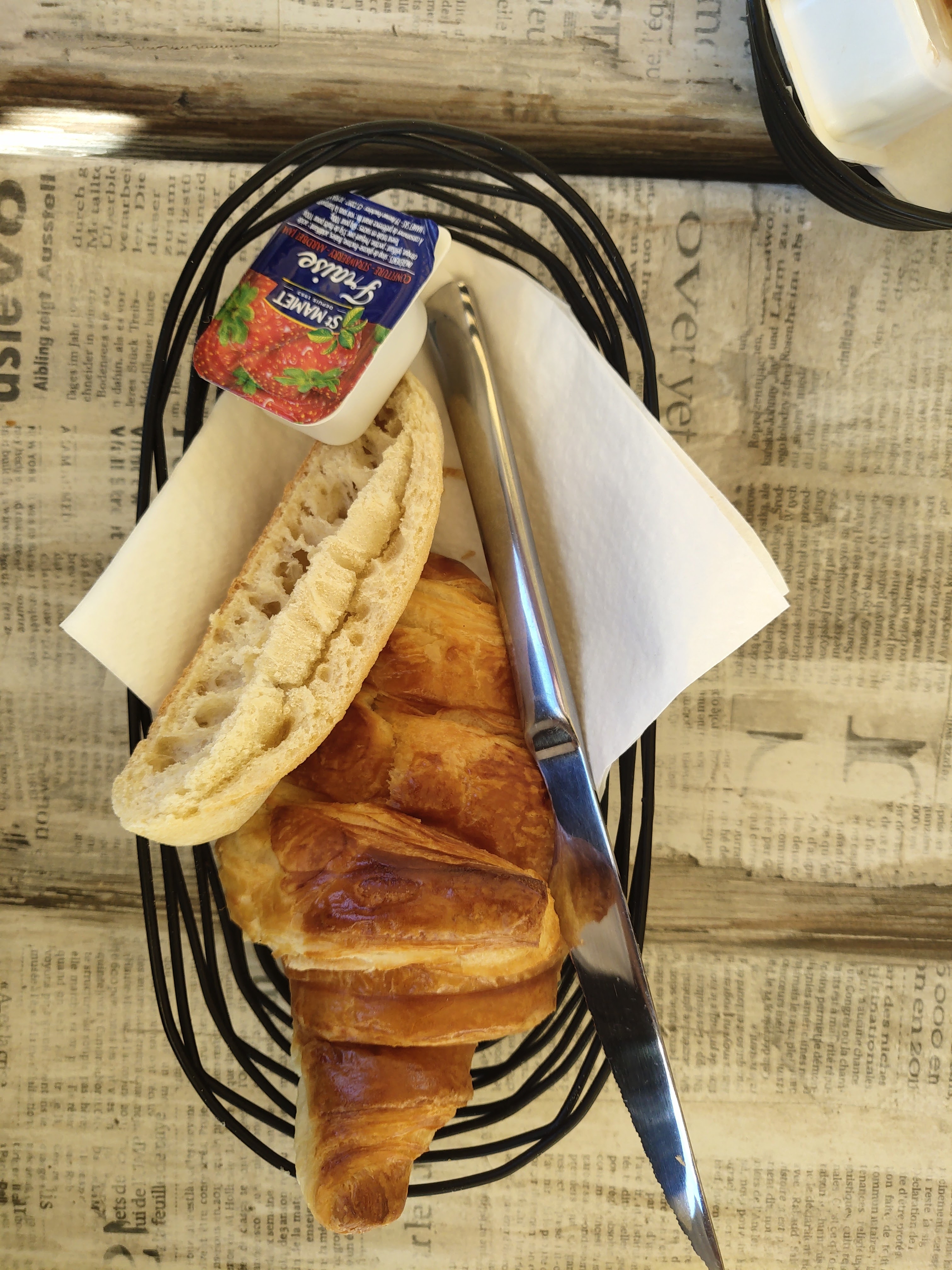 Petit déjeuner français pas top. Le pain semble pas très frais malheureusement. Le personnel moyen, on nous annonce qu’on nous sert un plus grand verre de jus d’orange vu que nous ne prenons pas de boisson chaude dans la formule. Résultat ? Nous avons la même quantité que n’importe qui. Ne pas informer des choses fausses.