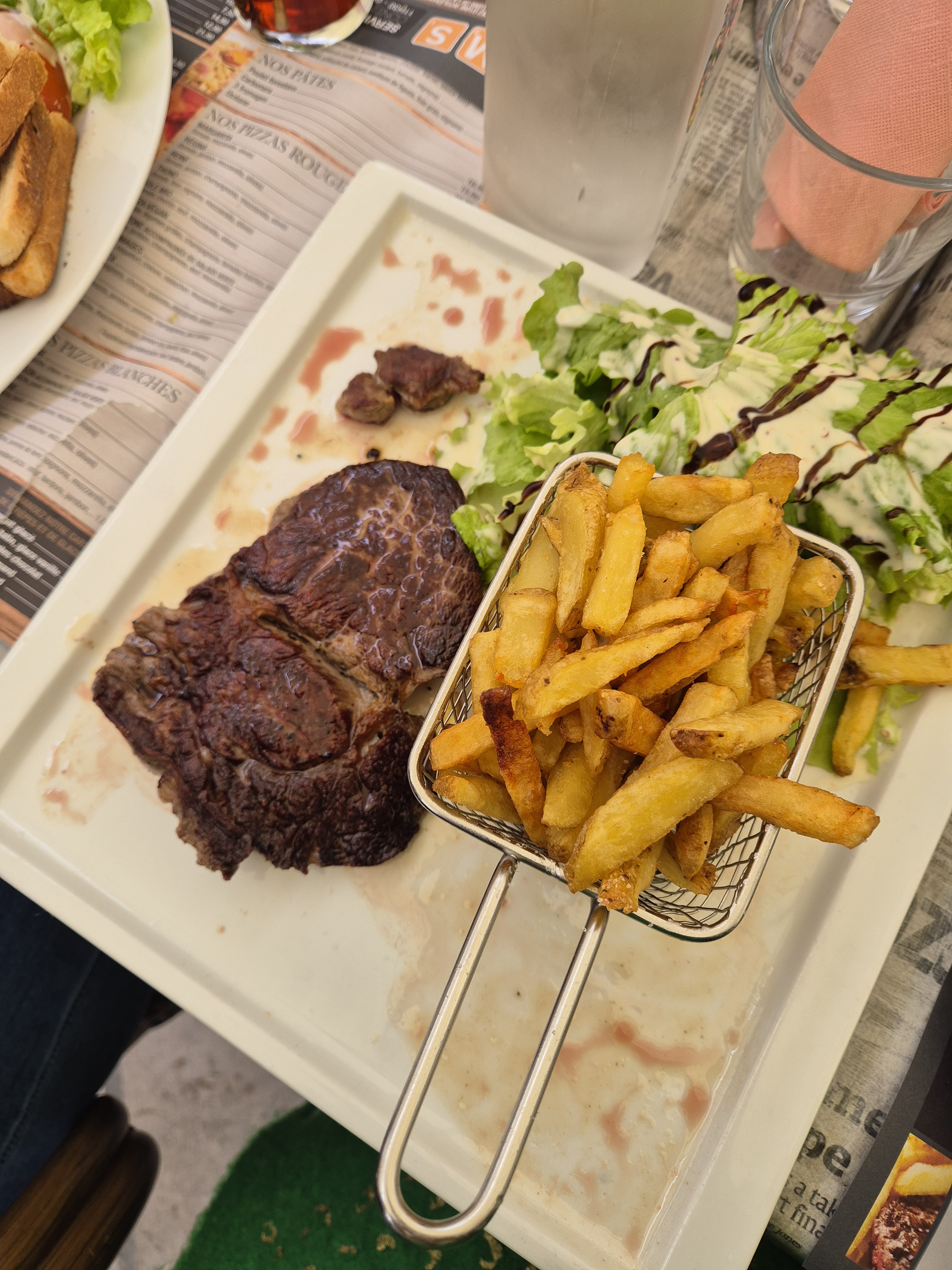 Je pense que mon entrecôte était congelée car elle n'avait aucun goût et très caoutchouteuse (avec énormément de nerfs).Les serveurs ne viennent même pas vérifier comment se passe notre repas alors qu'ils sont à côté à parler entre eux super fort... points positifs : belle deco, le pain et les frites sont bons.
