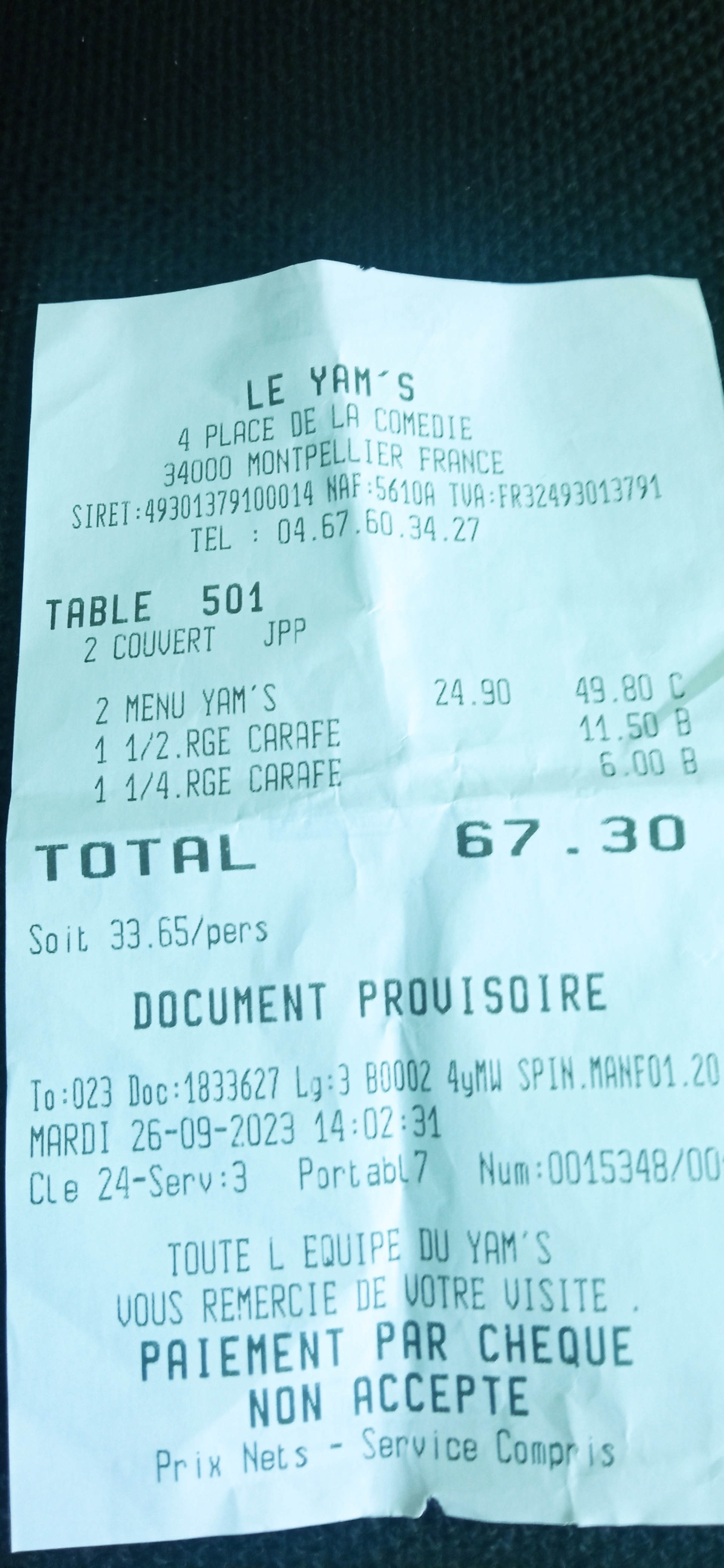Première fois au Yam’s de Montpellier en escale, l’avantage est que c’est en plein centre de la place de la comédie, très bel endroit. Par contre les inconvénients sont à mon sens relativement nombreux, tels que par exemple la durée d’attente entre la commande d’un apéritif et la commande du plat principal. Petite dédicace également au serveur auquel j’ai demandé bien gentiment un cendrier, qui ce dernier ne m’a même pas regardé et 5 minutes plus tard est revenu avec le cendrier et l’a claqué sur la table, je vous assure avoir été choqué par son acte. Certes l’endroit est convivial mais ne me laissera pas un bon souvenir pour autant.