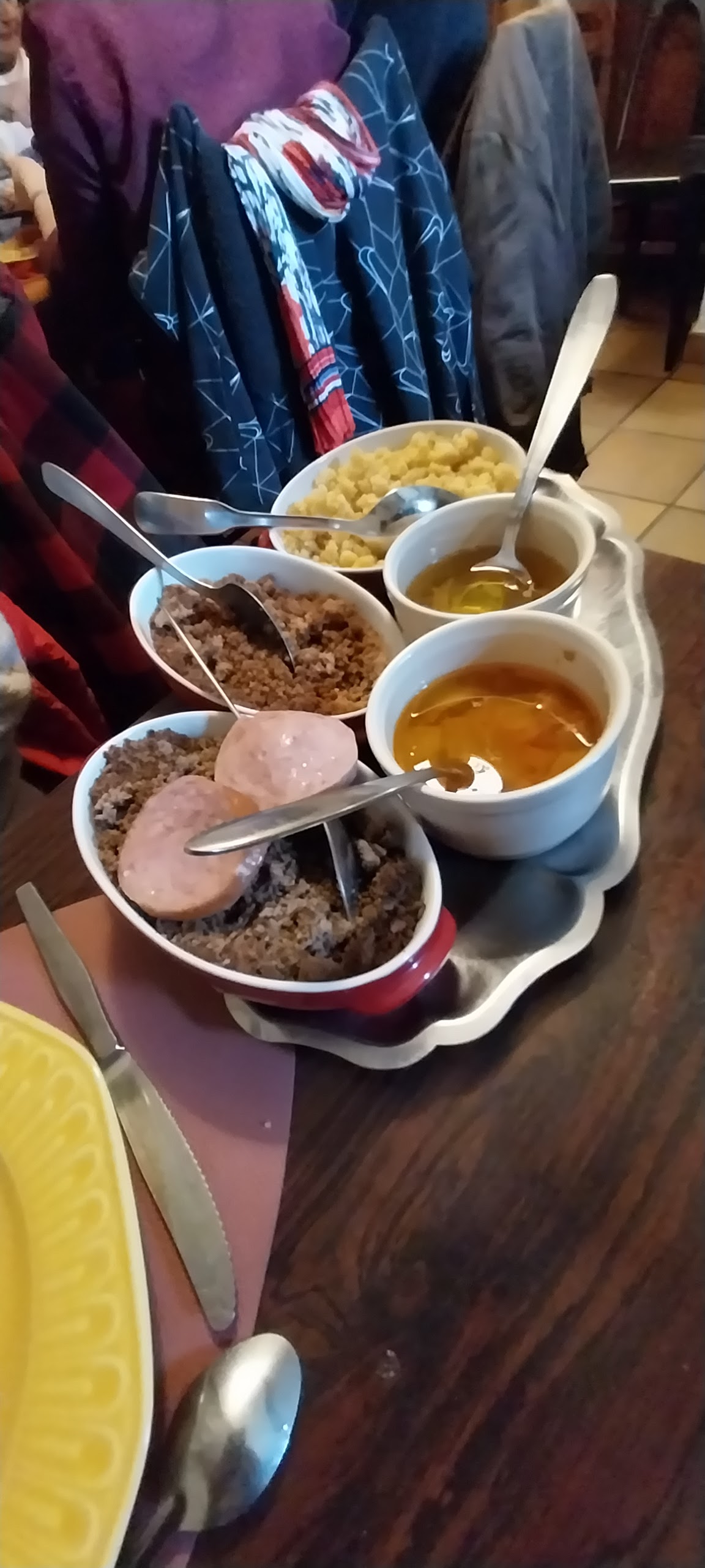 Excellent et copieux kig ha farz royal (34€ incluant kir, une bouteille de cidre Kerné, crudités, le kig ha farz avec jarret, bœuf et lard, ses légumes, ses deux lipigs 😋 et ses trois farz (froment, blé noir, châtaigne) précédé de son bouillon, dessert et café).