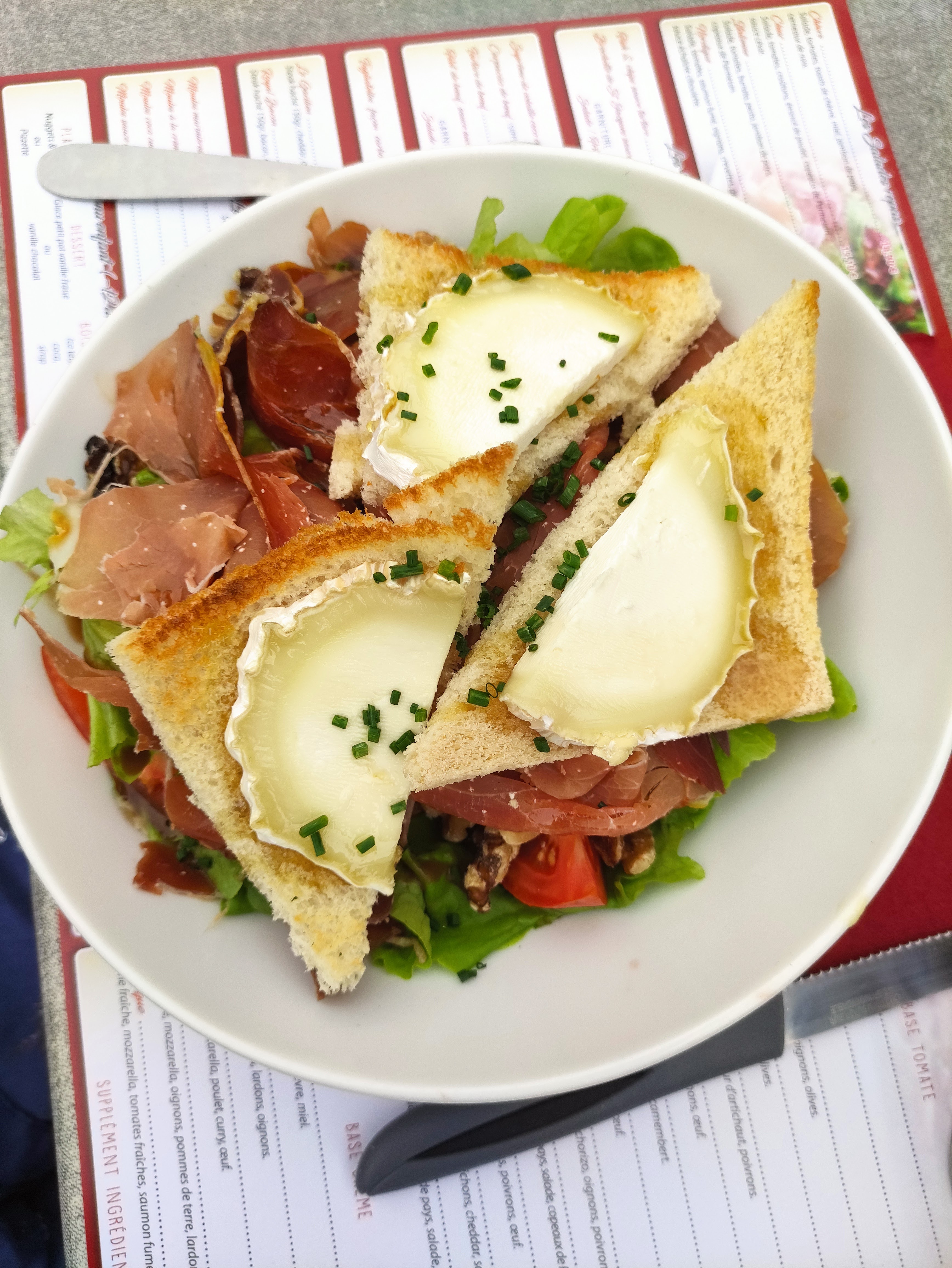 Nous avons mangé des salades italiennes et au chèvres , bien mais ne casse pas trois pattes à un canard.