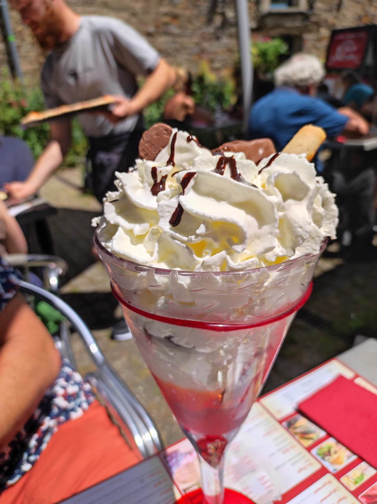 Nous avons commandé 2 kir: il n'était pas frais. Les pizzas bonnes mais morceaux coupés tros gros. Glaces à déconseillé car déjà fondu de moitié dans la coupe.