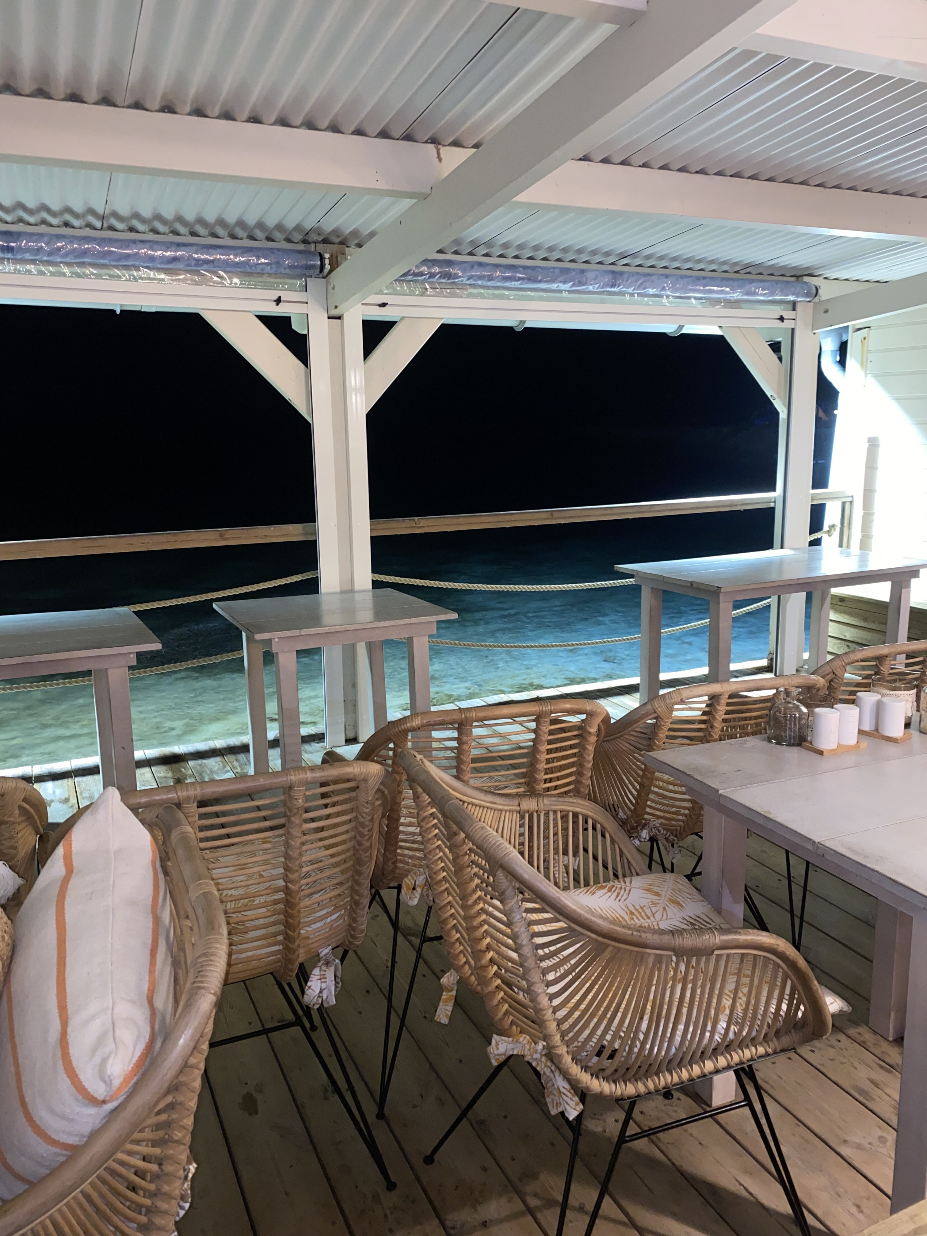 De façon générale, nous avons été assez déçus de notre expérience et surpris étant donné la bonne notation de ce restaurant. Nourriture: Nous avons pris le porc effiloché et les pâtes aux langoustes. Les deux plats ne goûtaient pas grand chose. Les pâtes était trop cuites même si sur le menu c’était indiqué que c’était servie « al dente ». Pas beaucoup de saveur. L’assiette de porc était tout simplement une assiette de viande sèche et pas très goûteuse. Le dessert était bon (cœur fondu). Service: après avoir demandé de changer de tables comme les lumières ne fonctionnaient pas au dessus de la notre, le serveur nous a dit que « c’était comme ça à Saint François » et qu’il était impossible de changer de tables comme le restaurant était plein. Pourtant il y avait au moins 2 autres tables de disponible. Il nous a dit qu’il allait demander à son patron et nous est jamais revenu là-dessus. Atmosphère: Endroit très joli et charmant, directement sur l’eau. Sûrement qu’il serait très plaisant pour simplement prendre un verre.
