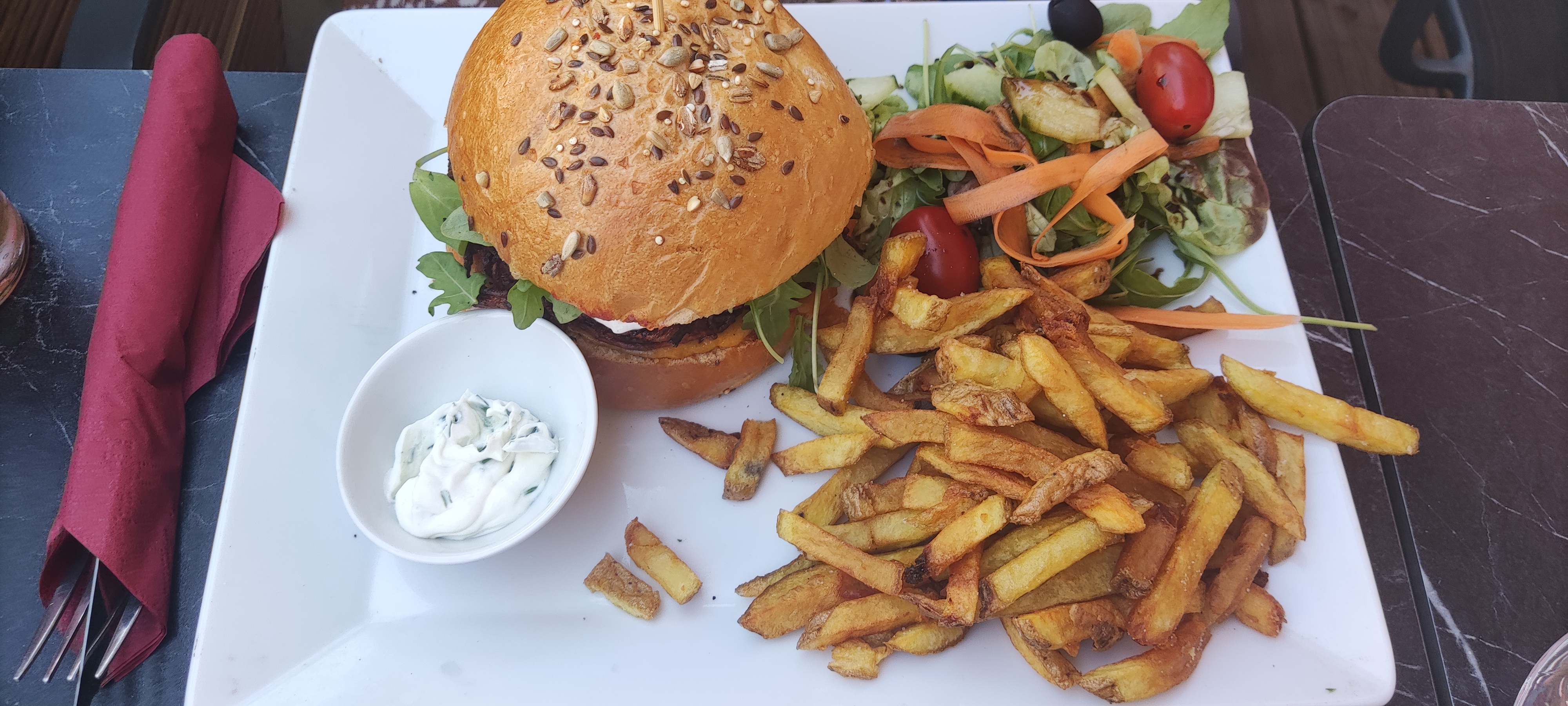 Excellent. Essayez les burgers végétariens, ils sont délicieux et originaux. Plats copieux.