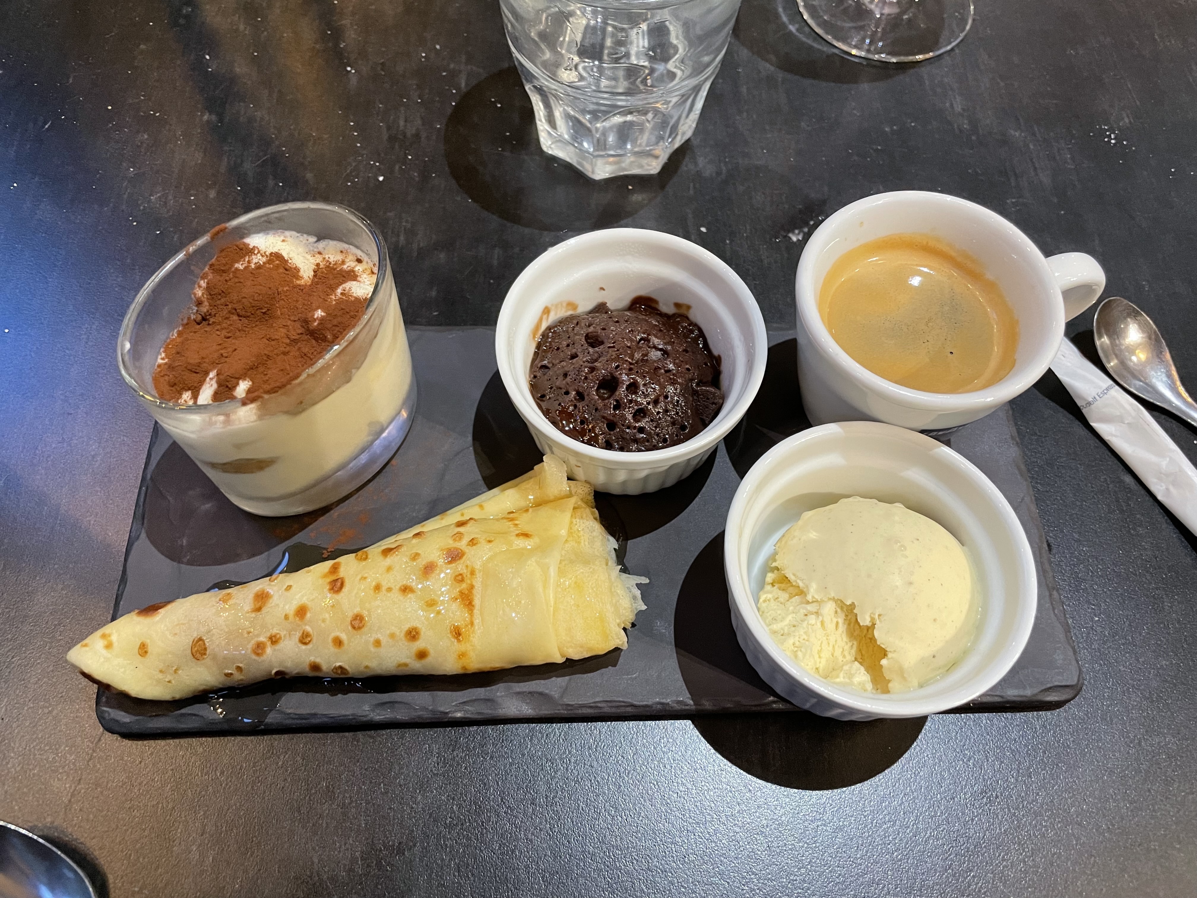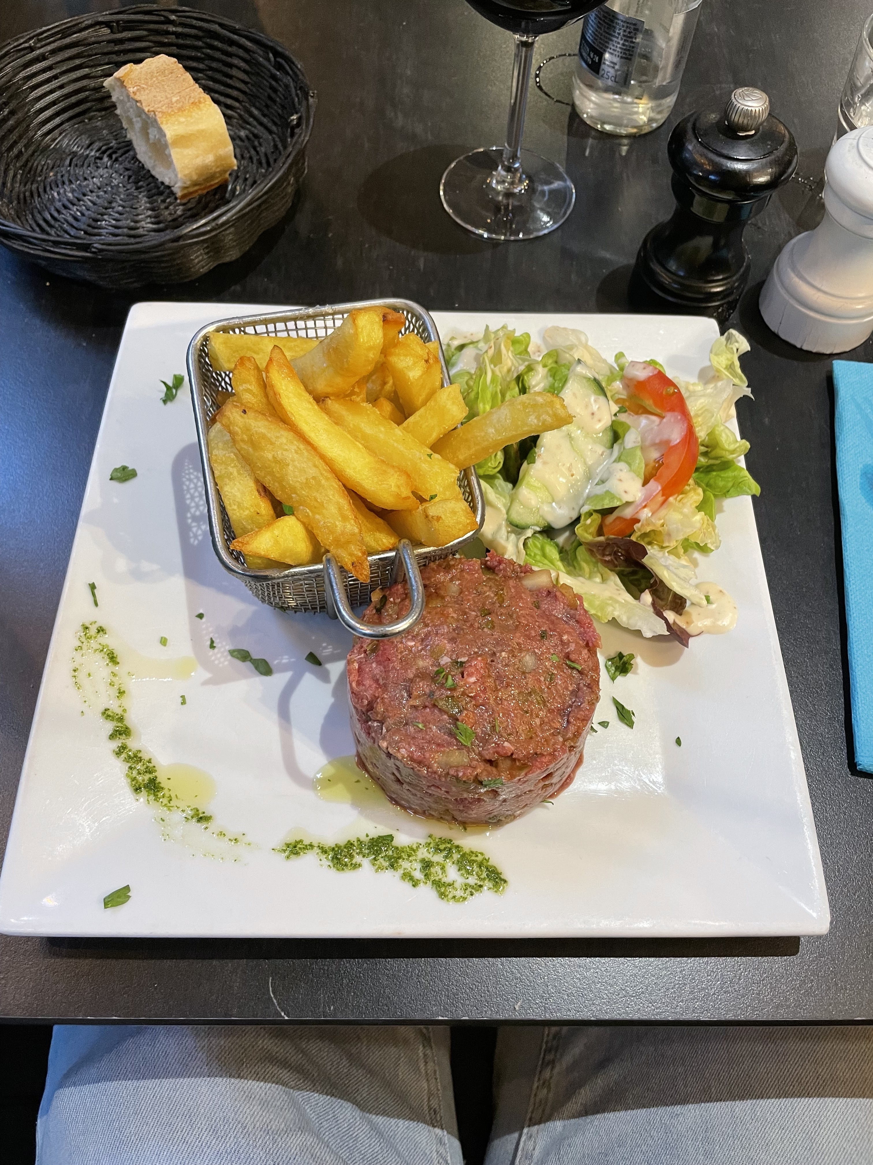 Je suis tombé par hasard ici selon la recommandation du personnel de mon auberge de l'autre côté de la route. Le personnel était très hospitalier et charmant. La nourriture était parfaite. J'ai eu le gravlax de saumon, le tartare de bœuf et une assiette de dessert composée de crêpe/tiramasu/fondant au chocolat ?/glace/expresso. Le rouge maison « esprit bordeux » était très très bien aussi. Je t'aime