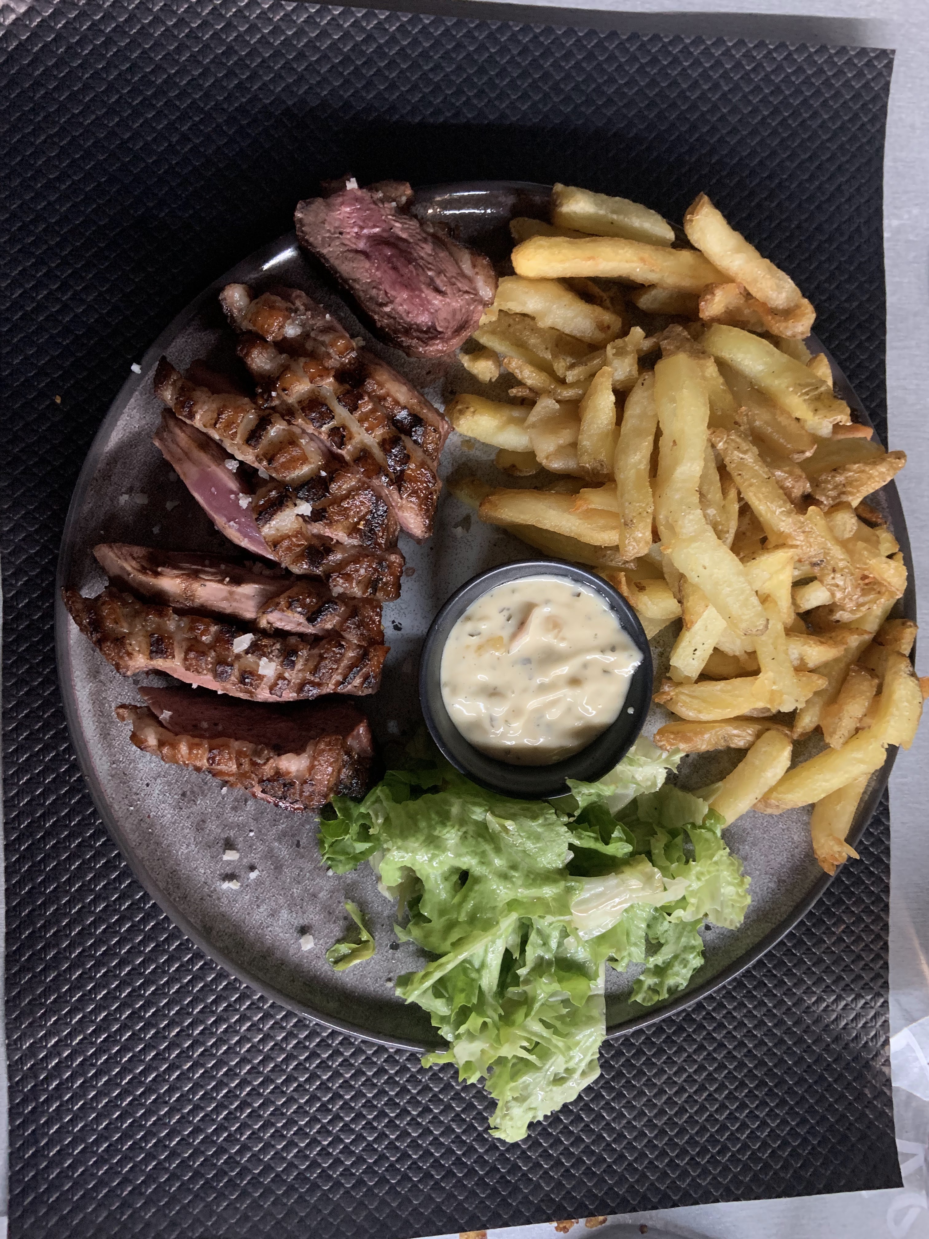 Viande très bonne, idem pour le vin. Dommage que les frites étaient molles et donnaient l'impression d'être réchauffées