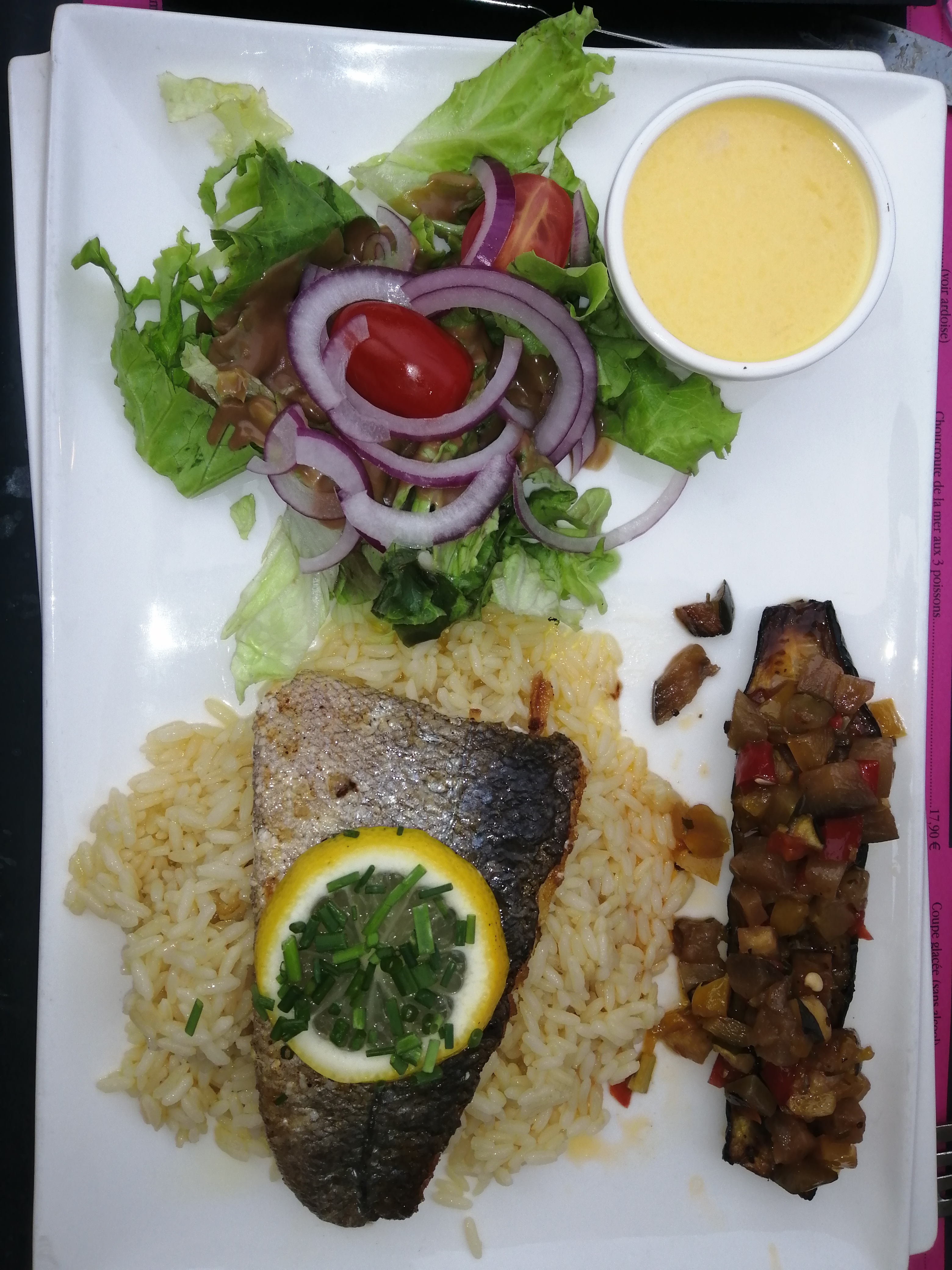 Le menu du jour n'etait pas top... Le poisson (Merlu) etait sancer être grillé mais on aurait dit qu'il etait passé dans une poele, la sauce n'avait pas le gout de citron, le riz et les legumes etaient présent en trop petite quantité j'était un peu déçut. L'entrée etait quant à elle plutot correct. C'est assez bon rapport qualitée prix.