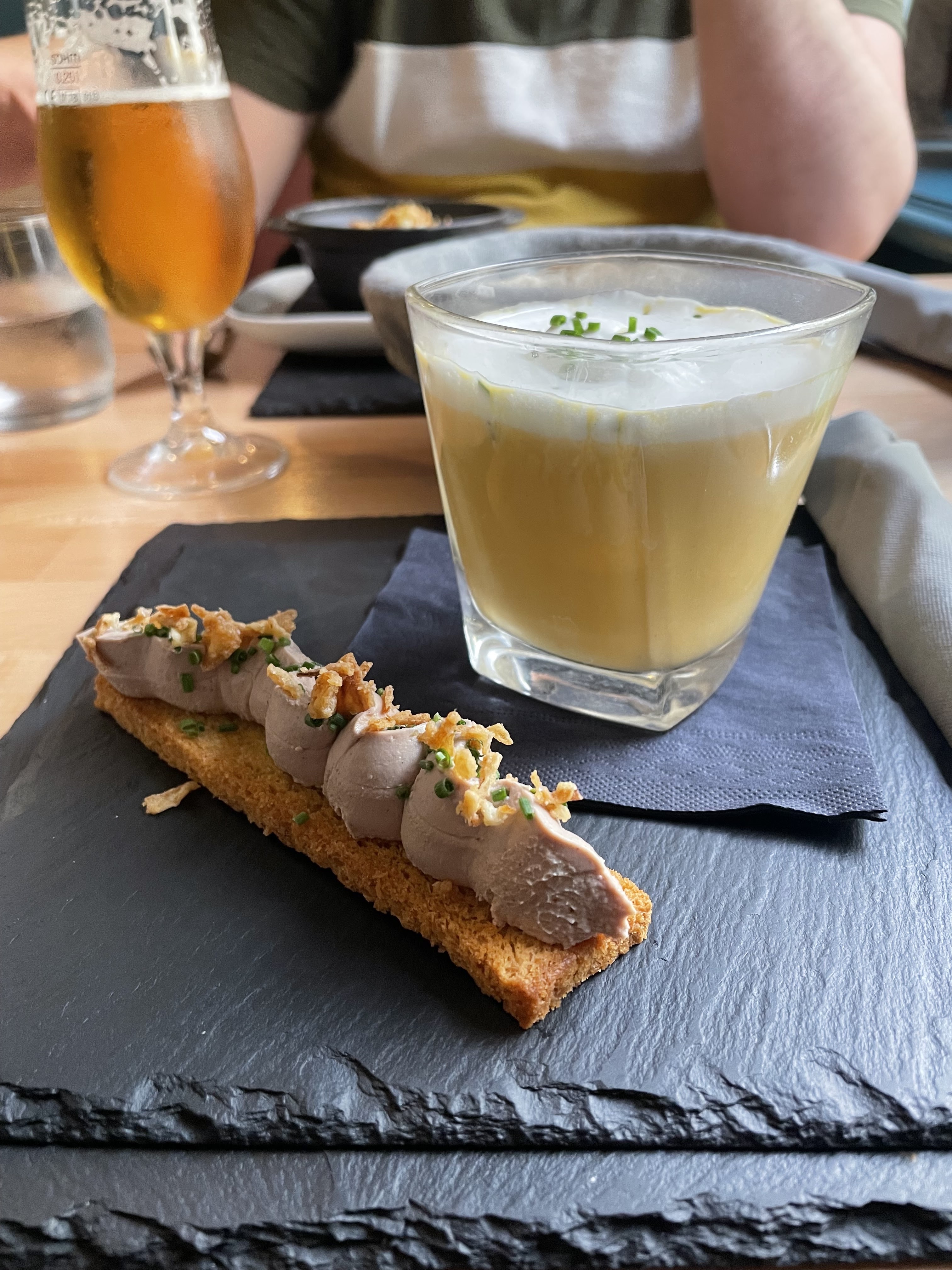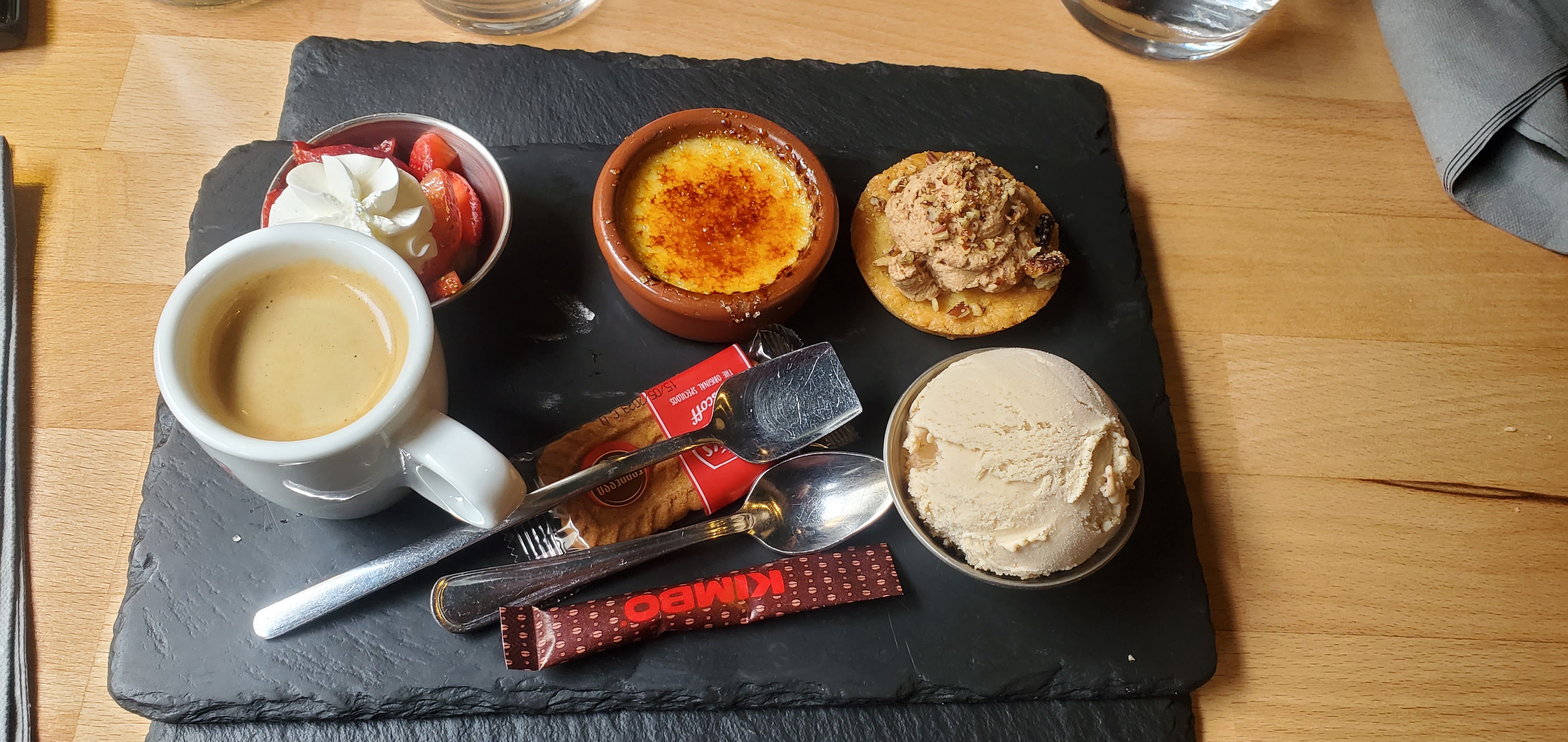 Service impeccable avec serveuse souriante et efficace (jeune brune dont jai malheureusement oublié le prenom) et cuisine raffinée Ambiance très sympathique et tolérance car mon chien a pu nous accompagner sans problème. Je recommande vivement cet endroit pour un moment de plaisir gourmand !
