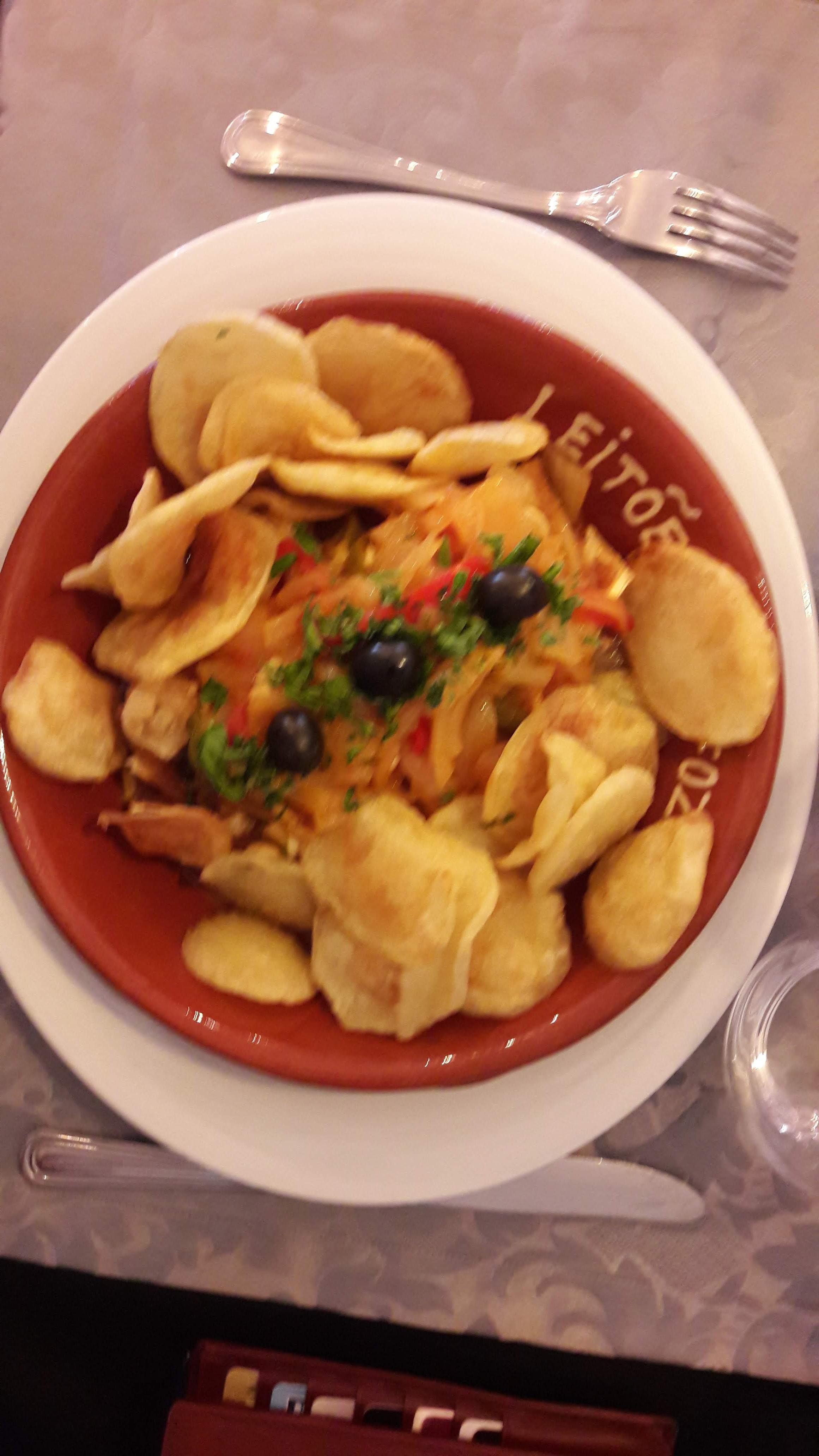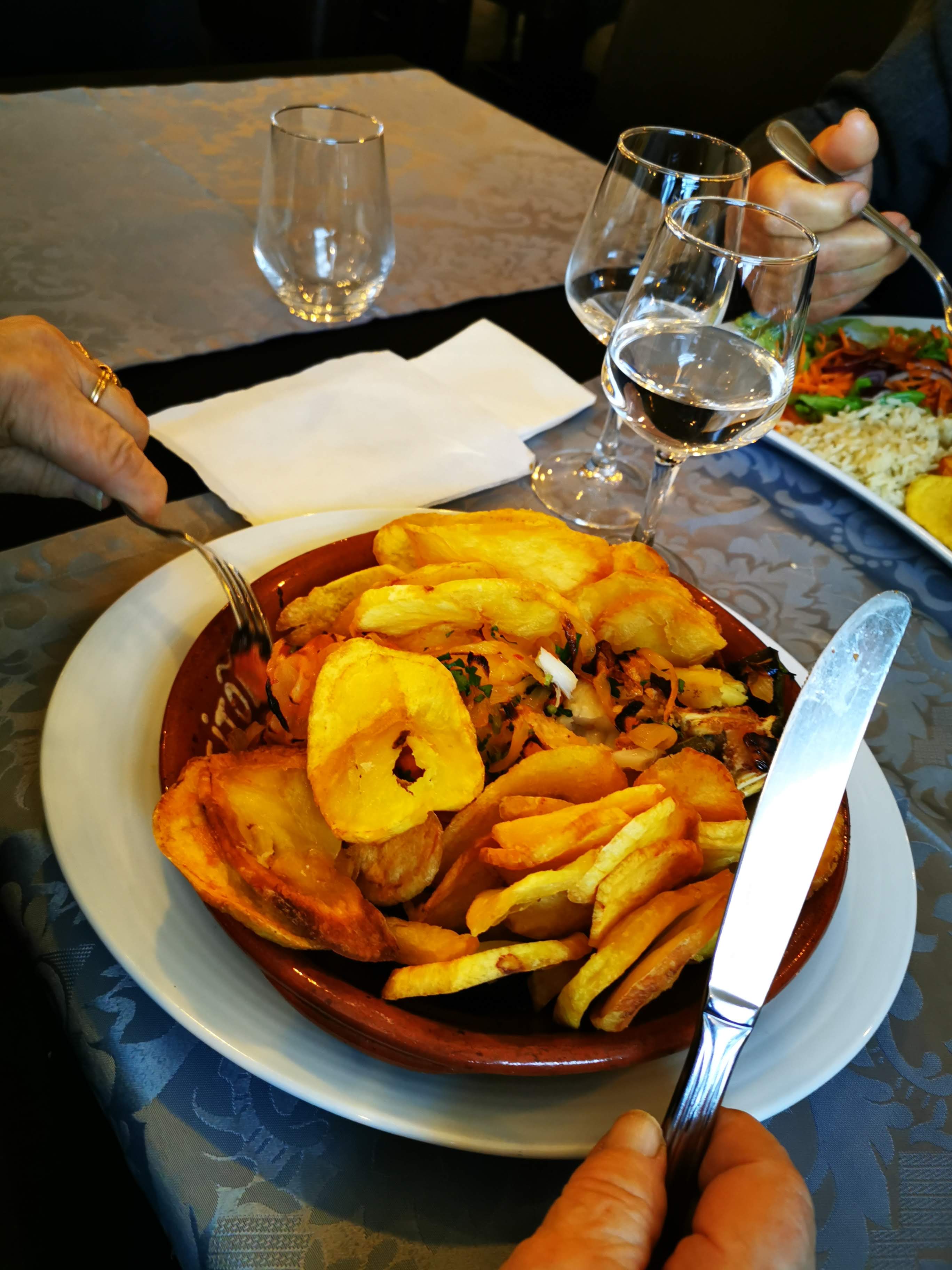 Super resto portugais et de la bonne cuisine portugaise cochon de lait, saucisse grillée, beignets de morue et de viande, bacalhao a cebolada, bacalhao a bras et carne alentejana (viande avec des fruits de mer et pommes frites) accompagnée d'un alvarinho vin blanc typique du Nord du Portugal.