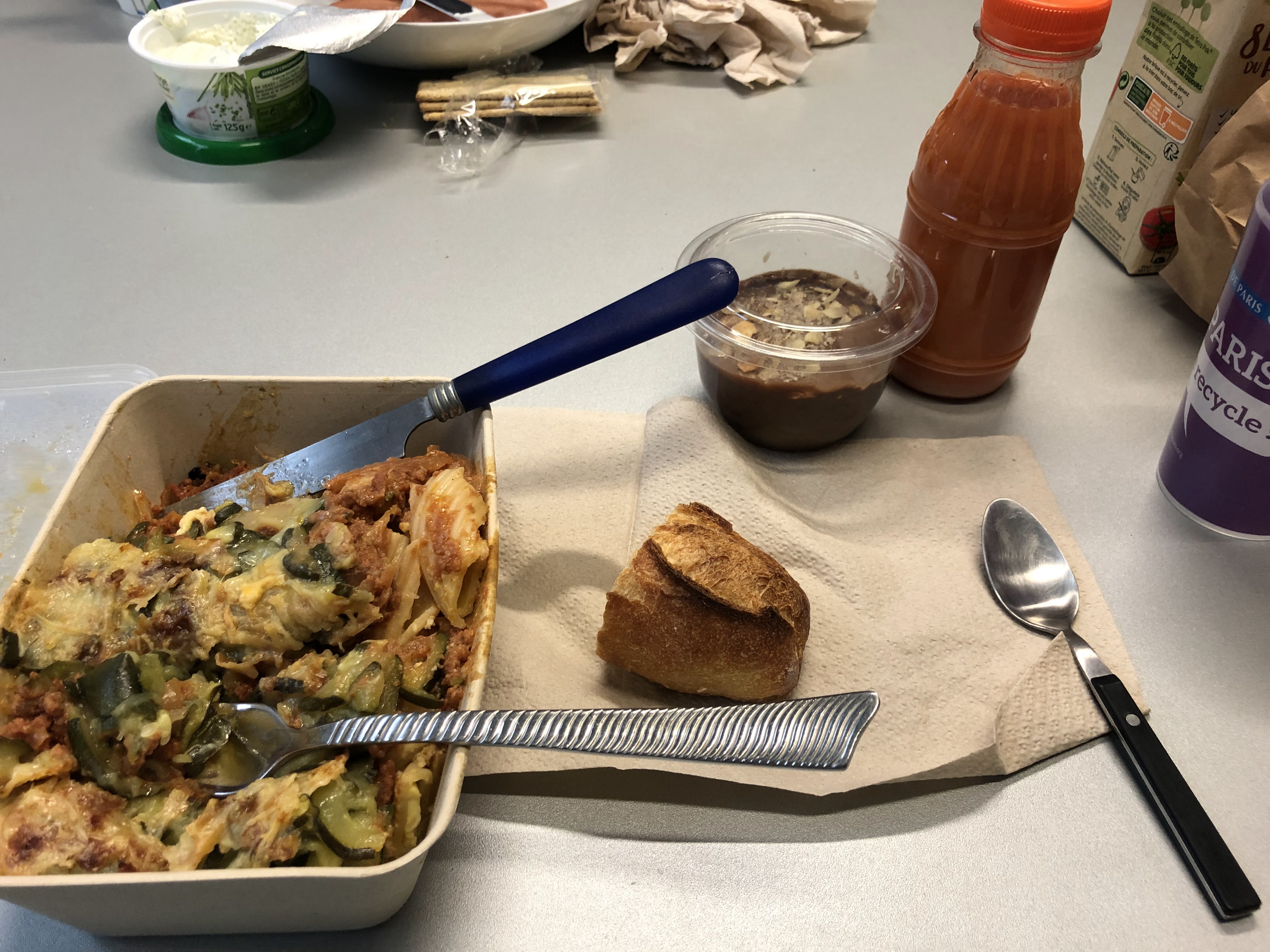 Gratin de pâtes courgette et viande haché + poire au chocolat + jus de fruit pressée Un régal